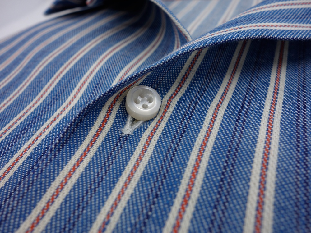 Ce fournisseur italien est spécialisé dans les tissus « sport » et propose une des offres de denim les plus larges au monde. Les tissus que nous avons choisis sont des jeans fabriqués au Japon exclusivement pour la collection Albiate. Nous avons pu en tirer deux rouleaux, mais l’offre est extrêmement limitée. Pour réaliser ces chemises, nous avons pris un fort parti stylistique avec ces deux tissus rayés. Il s’agit de véritables tissus en denim plutôt bruts puisqu’ils pèsent 150 grammes au mètres carré. Notre objectif est de vous proposer des chemises solides, que vous pourrez porter de manière très décontractée le week-end. A même la peau ou bien même sur un t-shirt blanc pour un look plus détendu.