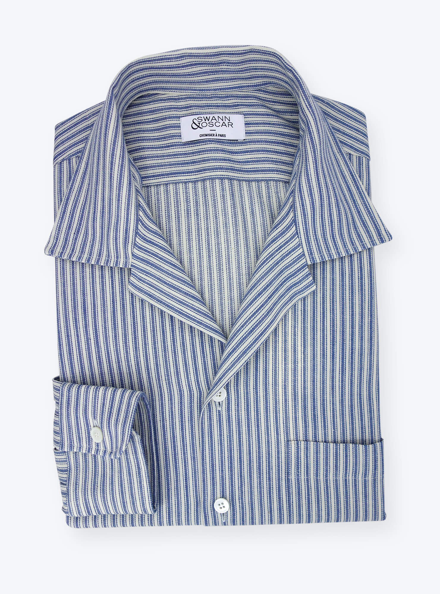 Pour une version toujours très estivale, nous disposons également d'un autre tissu au même style de rayures, mais en beaucoup plus léger. Il s'agit d'un oxford en coton (85%) et lin (15%). Très doux et souple, vous pourrez en faire une très belle chemise d'été agréable à porter. La voici dans un autre style, avec gorge leda, col boutonné et poche poitrine :