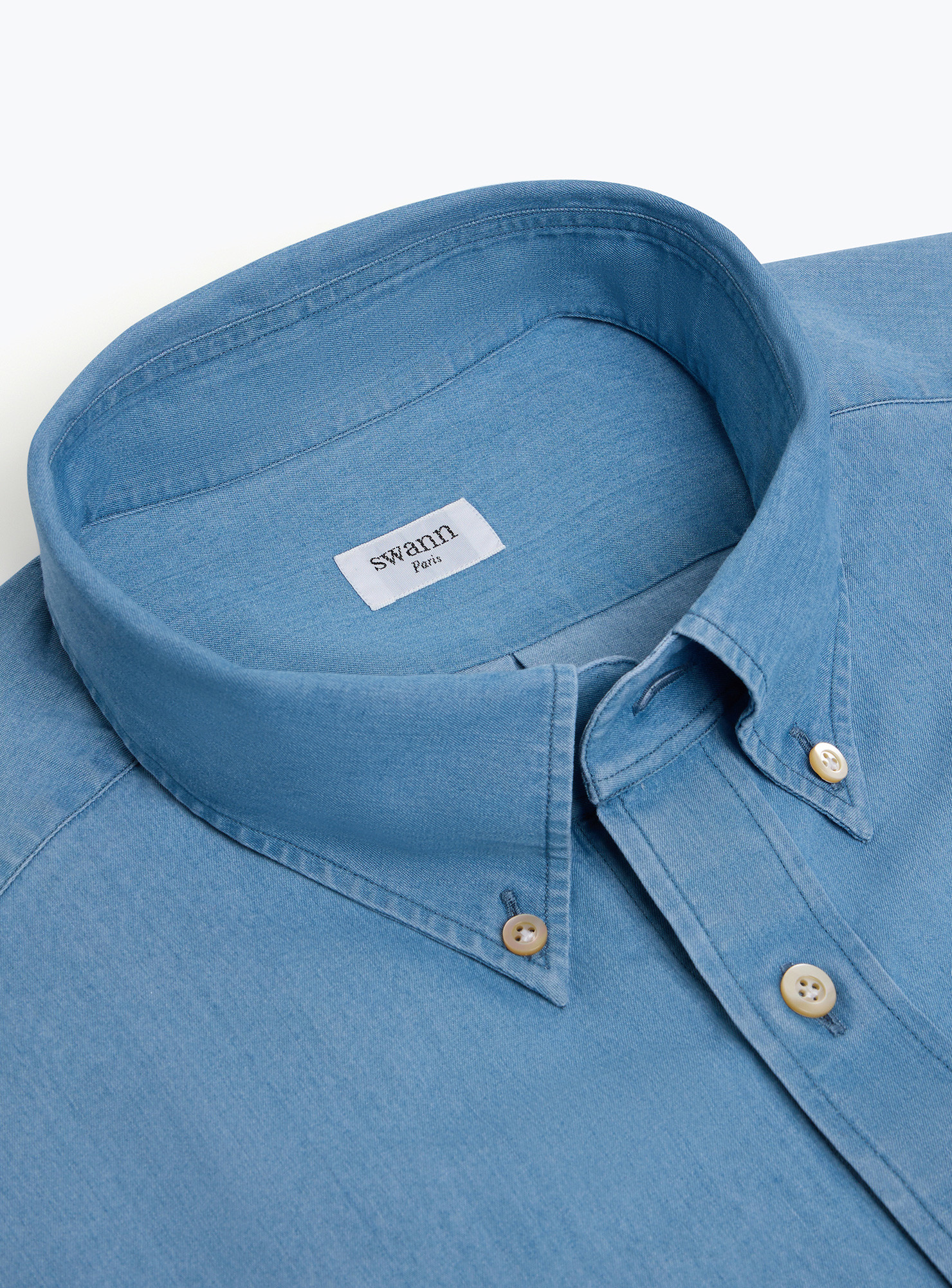 Chemise en jean coupée dans notre denim italien double retors, très agréable à porter. Col boutonné souple, boutons en nacre naturelle, double poche. La chemise a été montée avant d'être lavée pour lui donner un aspect patiné. Délaver des chemises sur mesure en tenant compte du rétrécissement est une technique complexe que notre atelier maitrise à la perfection.