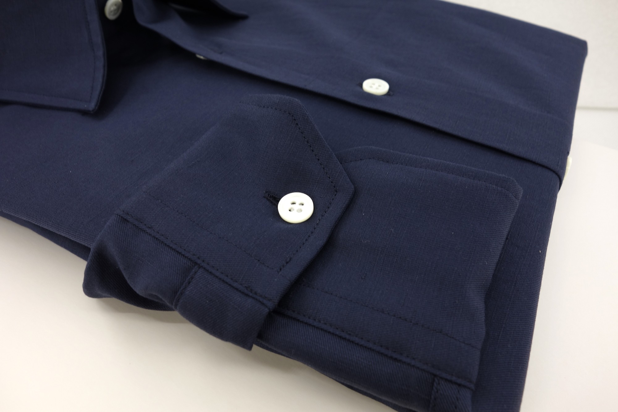 Gabardine de coton et lin bleu marine. C'est un tissu idéal pour des chemises type saharienne avec poches plaquées à rabat. L'été sur la plage ou l'hiver dans le Sahel !
