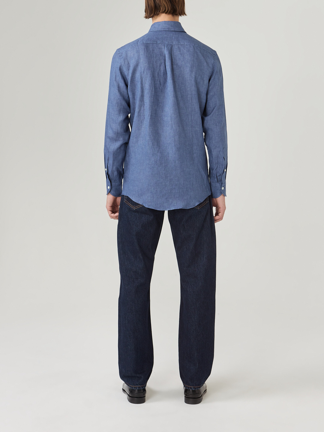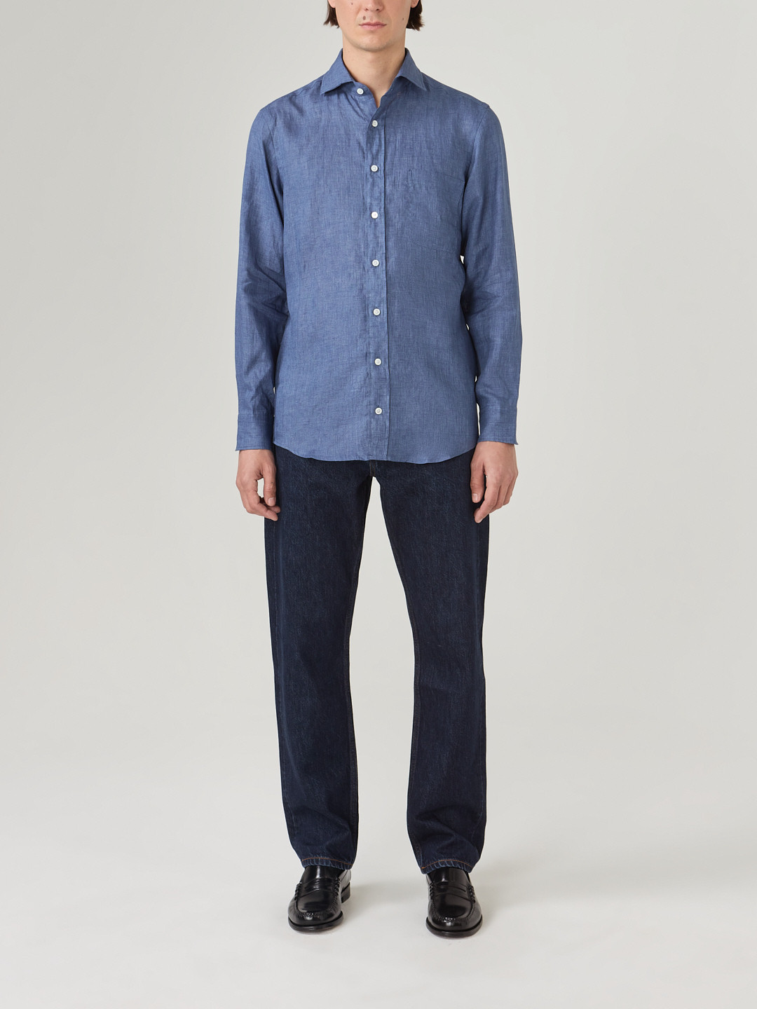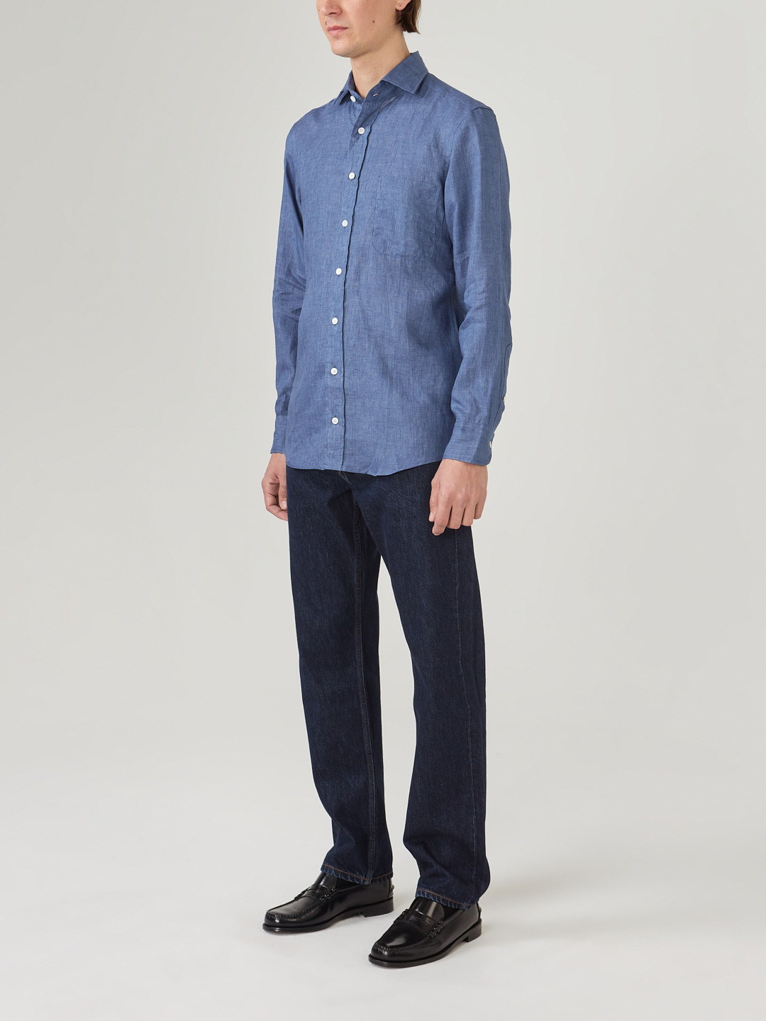 Lin délavé Thomas Mason, uni bleu. Souple et confortable, il va continuer à se délaver et à se patiner avec le temps.