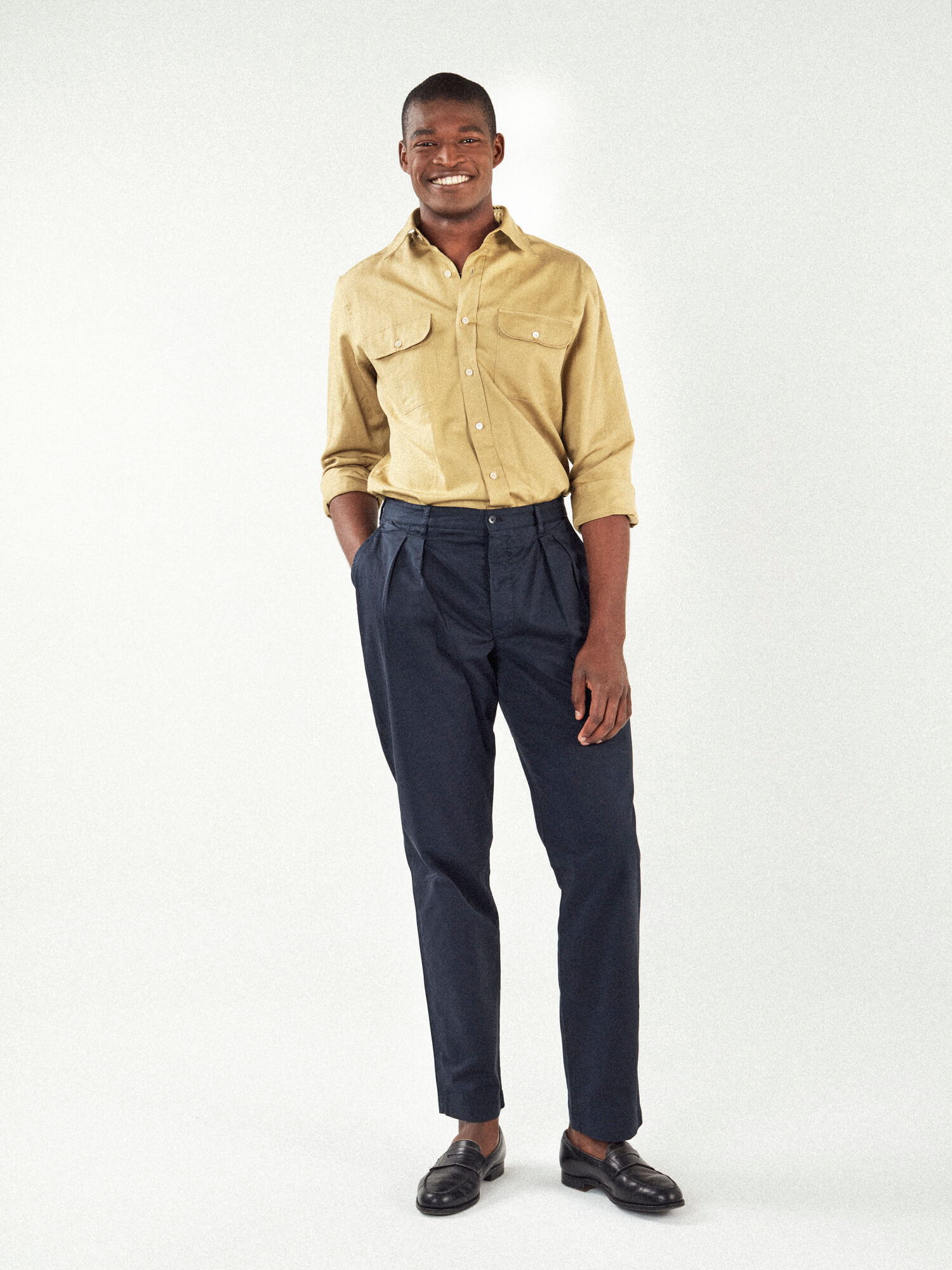 Tous nos vêtements sont coupés à la demande, nous pouvons donc réaliser la coupe ou le style que vous souhaitez indépendamment des modèles présentés ici. Demandez-nous.