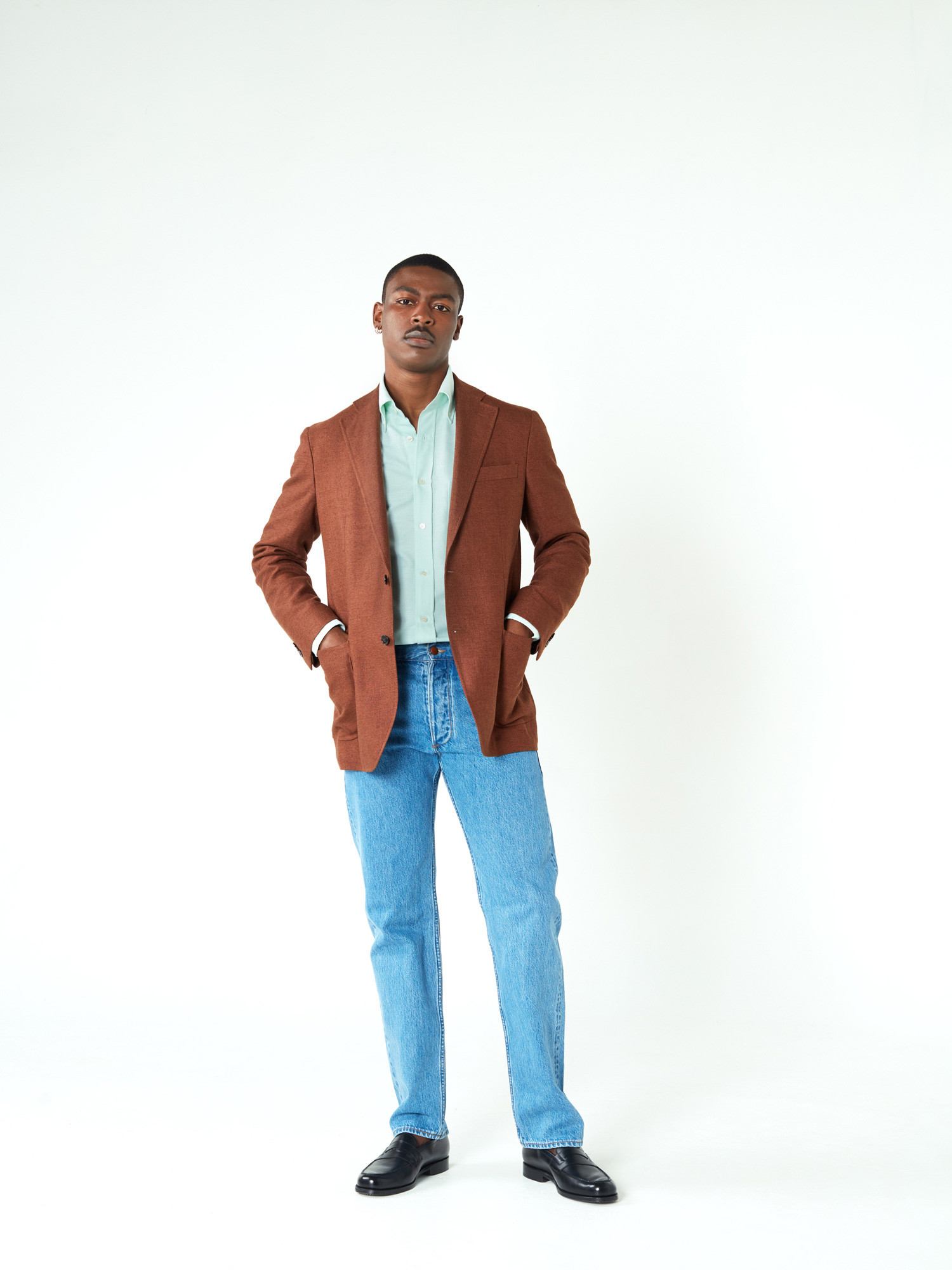 Tous nos vêtements sont coupés à la demande, nous pouvons donc réaliser la coupe ou le style que vous souhaitez indépendamment des modèles présentés ici. Demandez-nous.