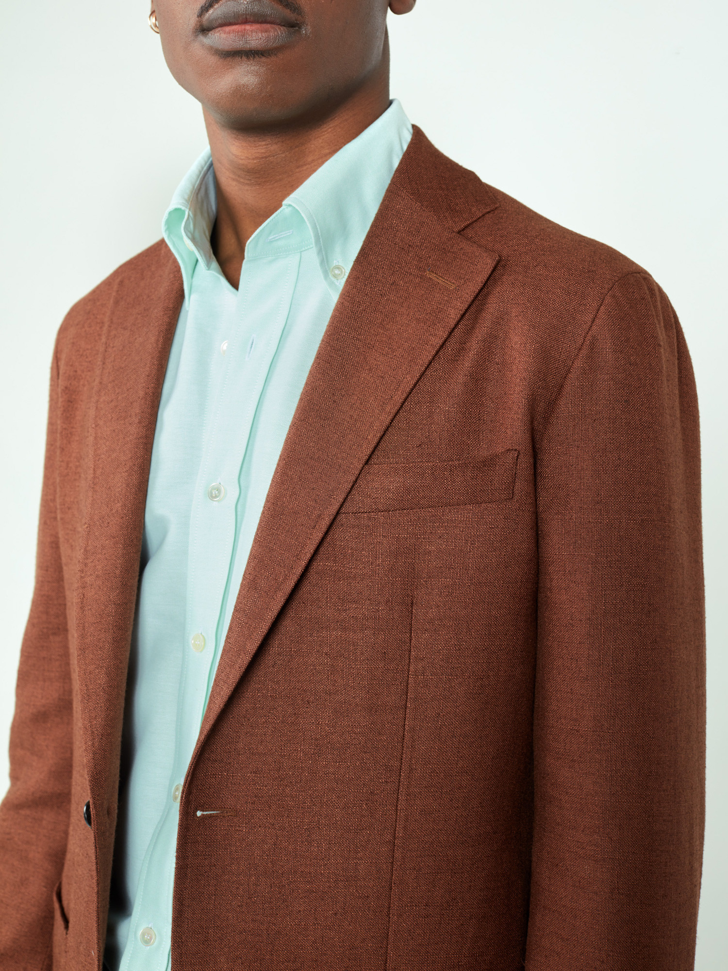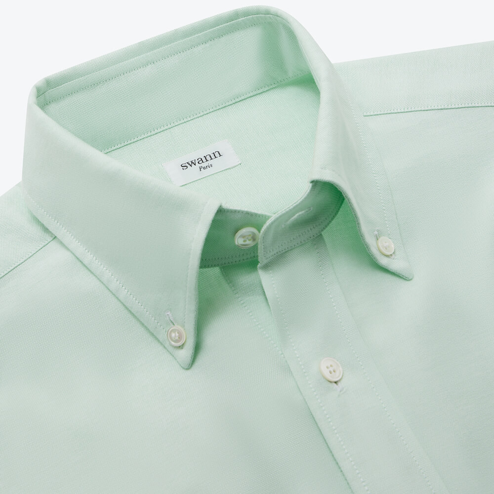 Oxford épais uni vert pâle, un tissu rustique et souple, parfait pour des chemises OCBD sport. La chemise Ivy à col boutonné.