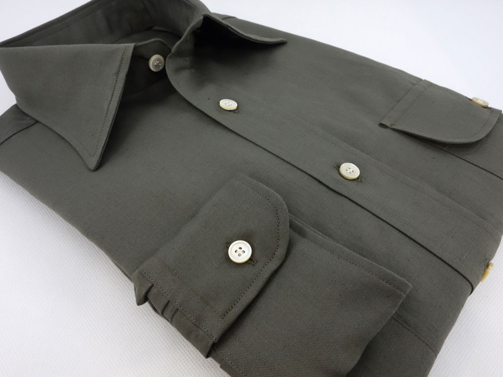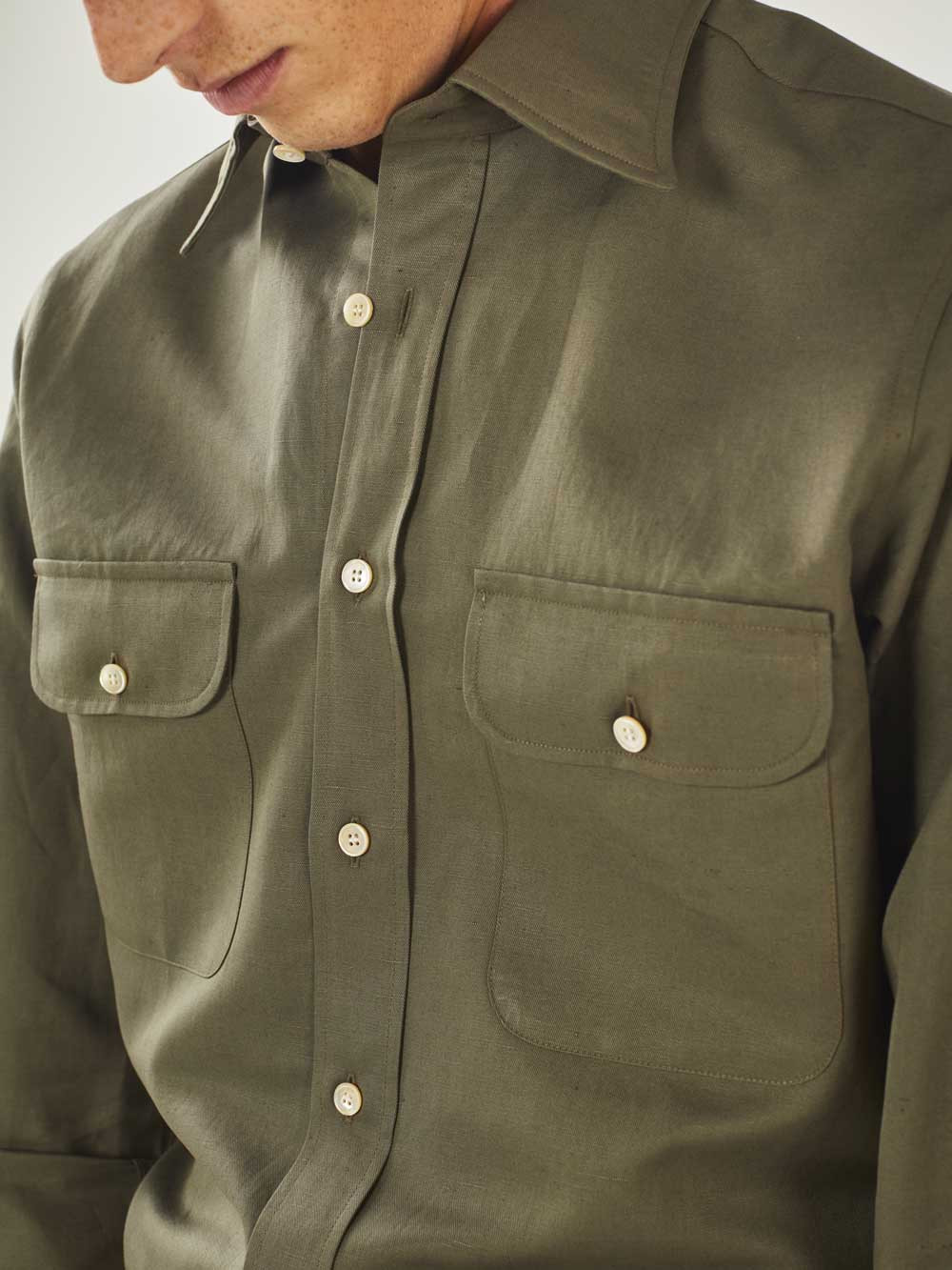 Gabardine épaisse Thomas Mason, mélange coton et lin vert foncé. C'est un tissu idéal pour des chemises d'été au col souple, ou une saharienne avec des doubles poches à rabat. L'aspect irrégulier du fil de lin renforce le côté sport du tissu.