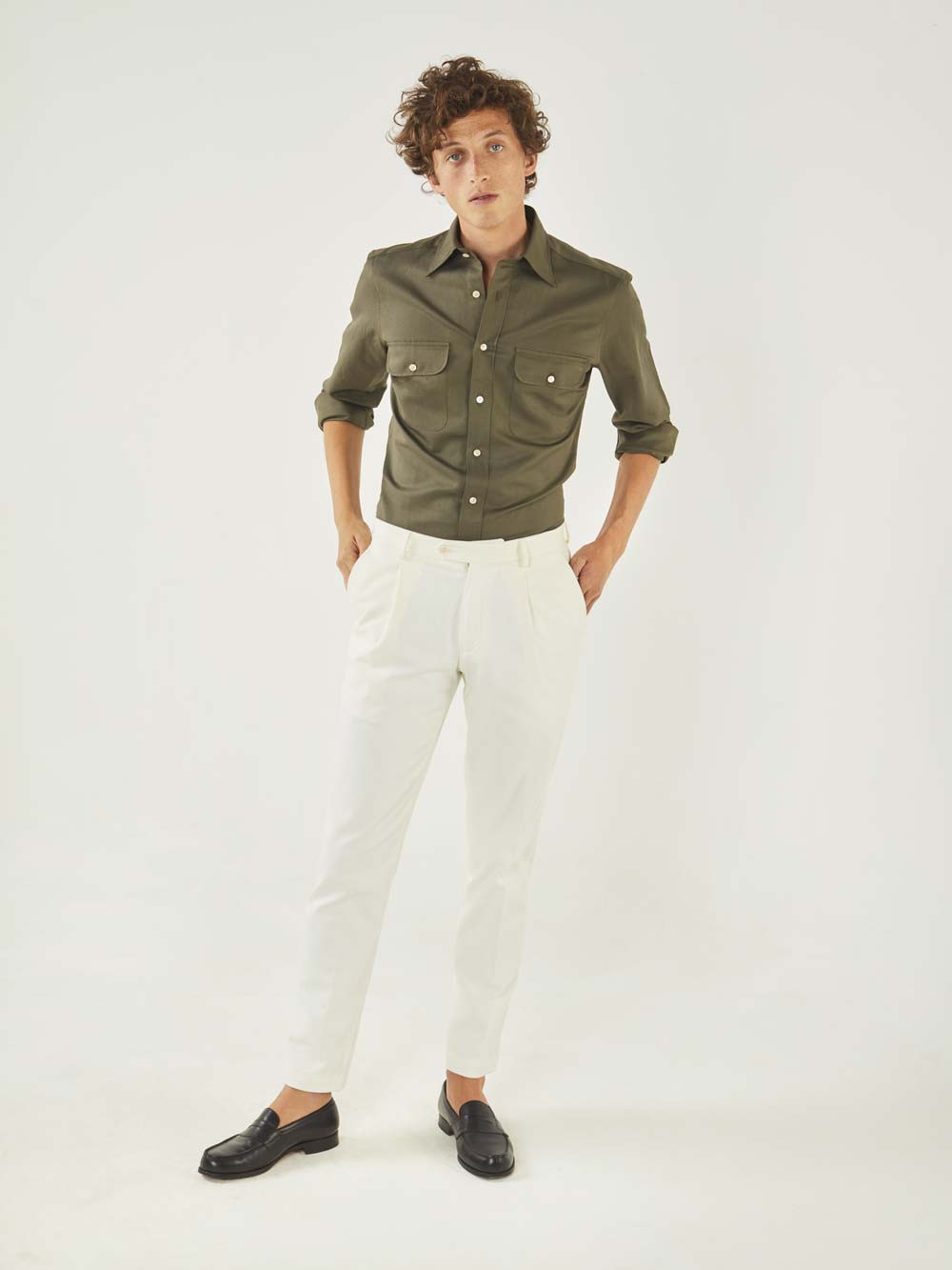 Tous nos vêtements sont coupés à la demande, nous pouvons donc réaliser la coupe ou le style que vous souhaitez indépendamment des modèles présentés ici. Demandez-nous.