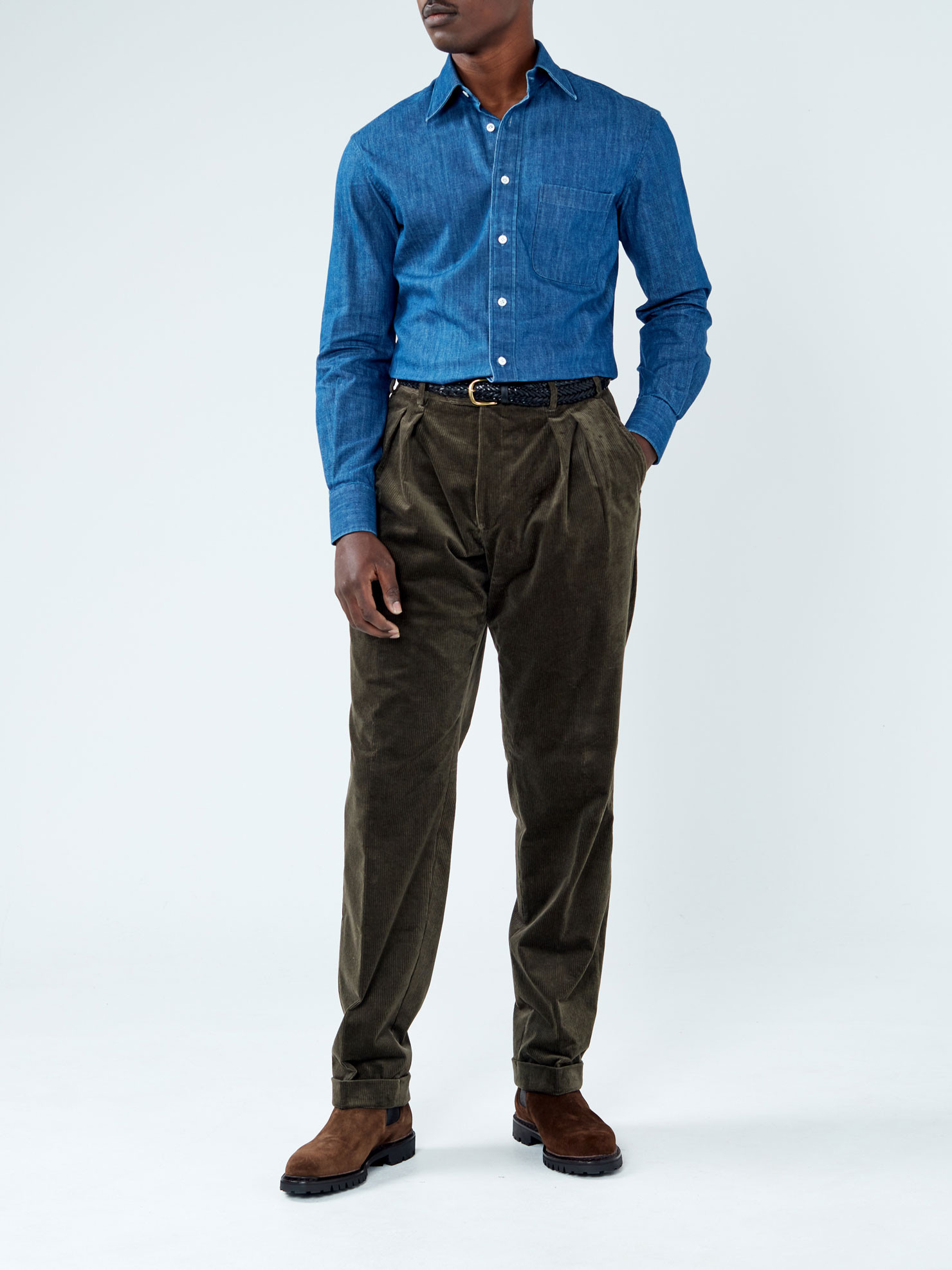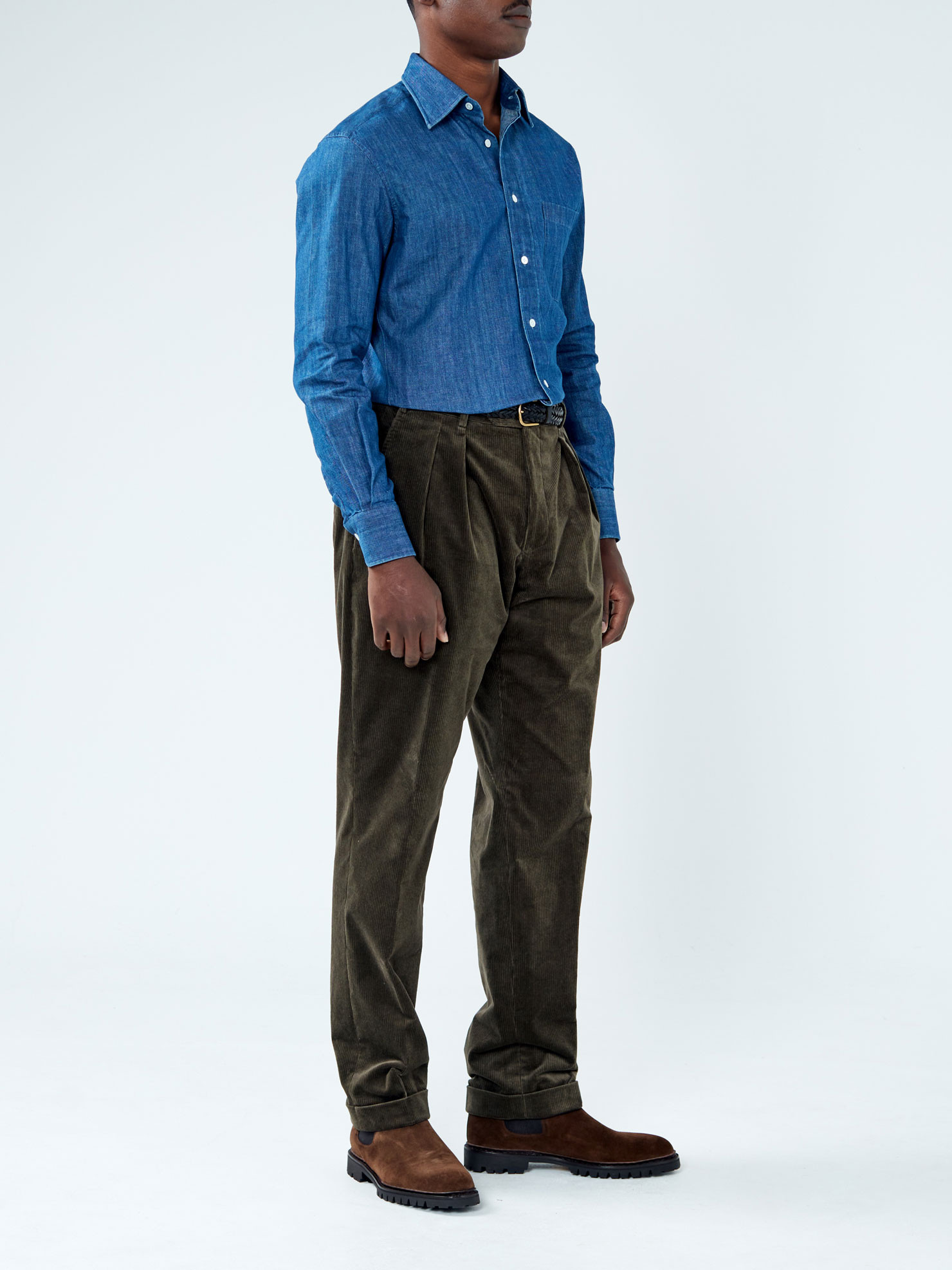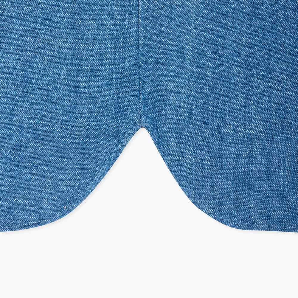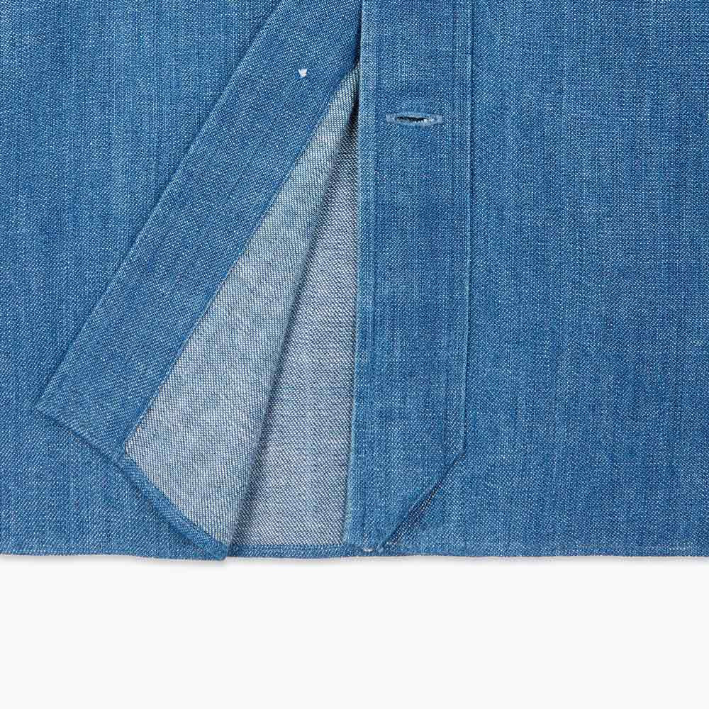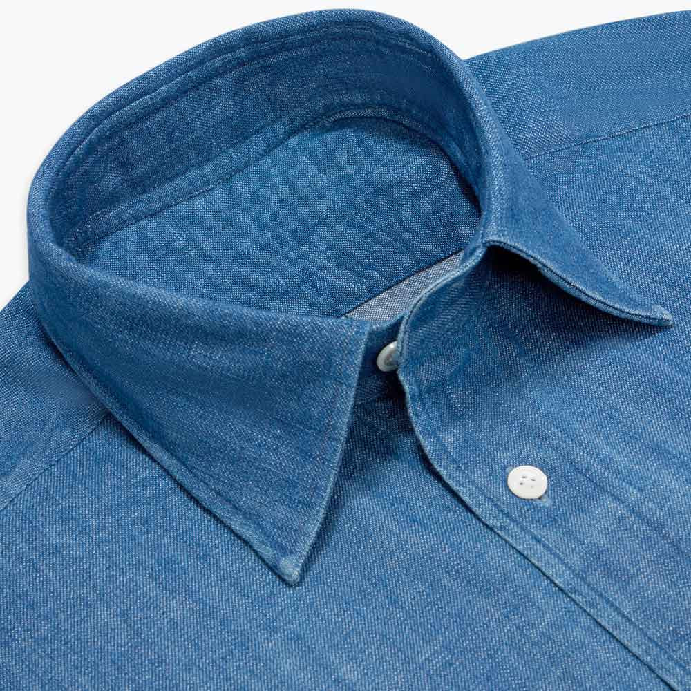 Chemise en jean coupée dans notre denim japonais, épais et robuste. Col hirondelle souple, boutons en nacre, poche. La chemise a été montée avant d'être lavée pour lui donner un aspect patiné. Délaver des chemises sur mesure en tenant compte du rétrécissement est une technique complexe que notre atelier maitrise à la perfection.