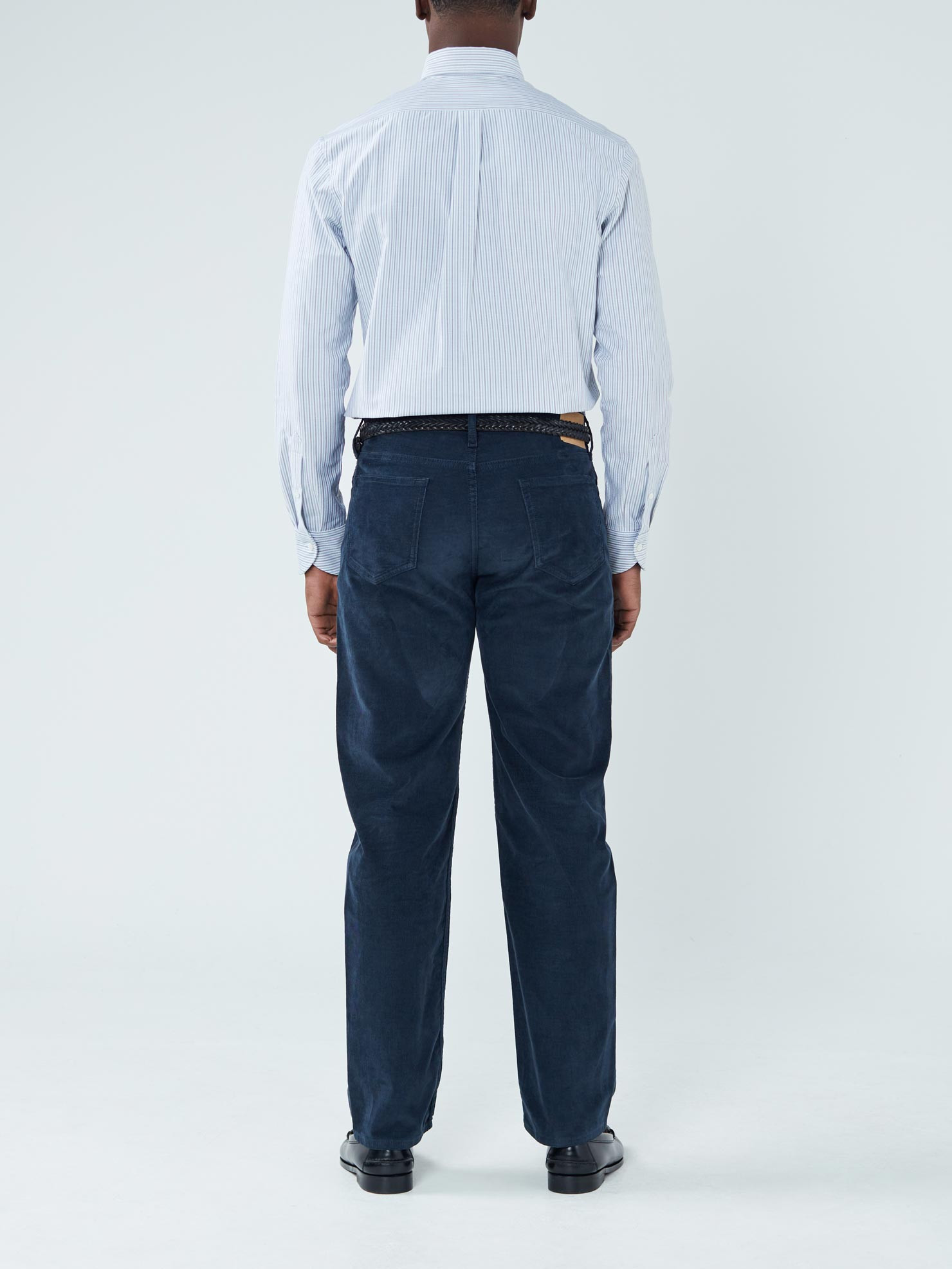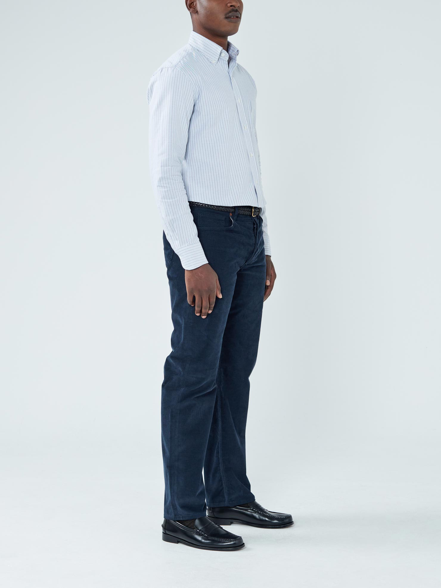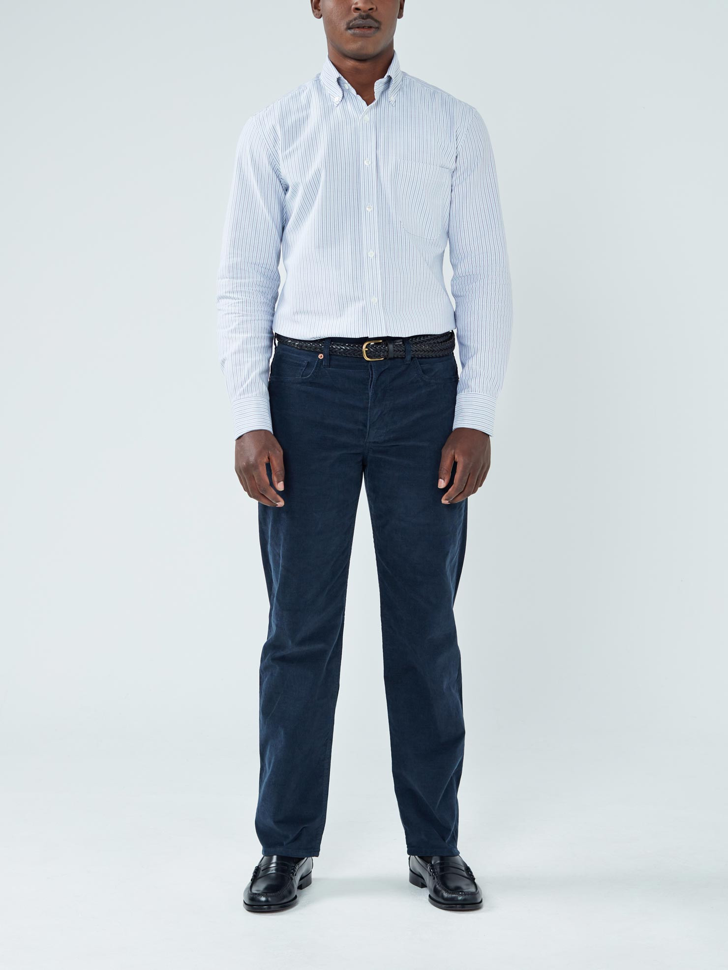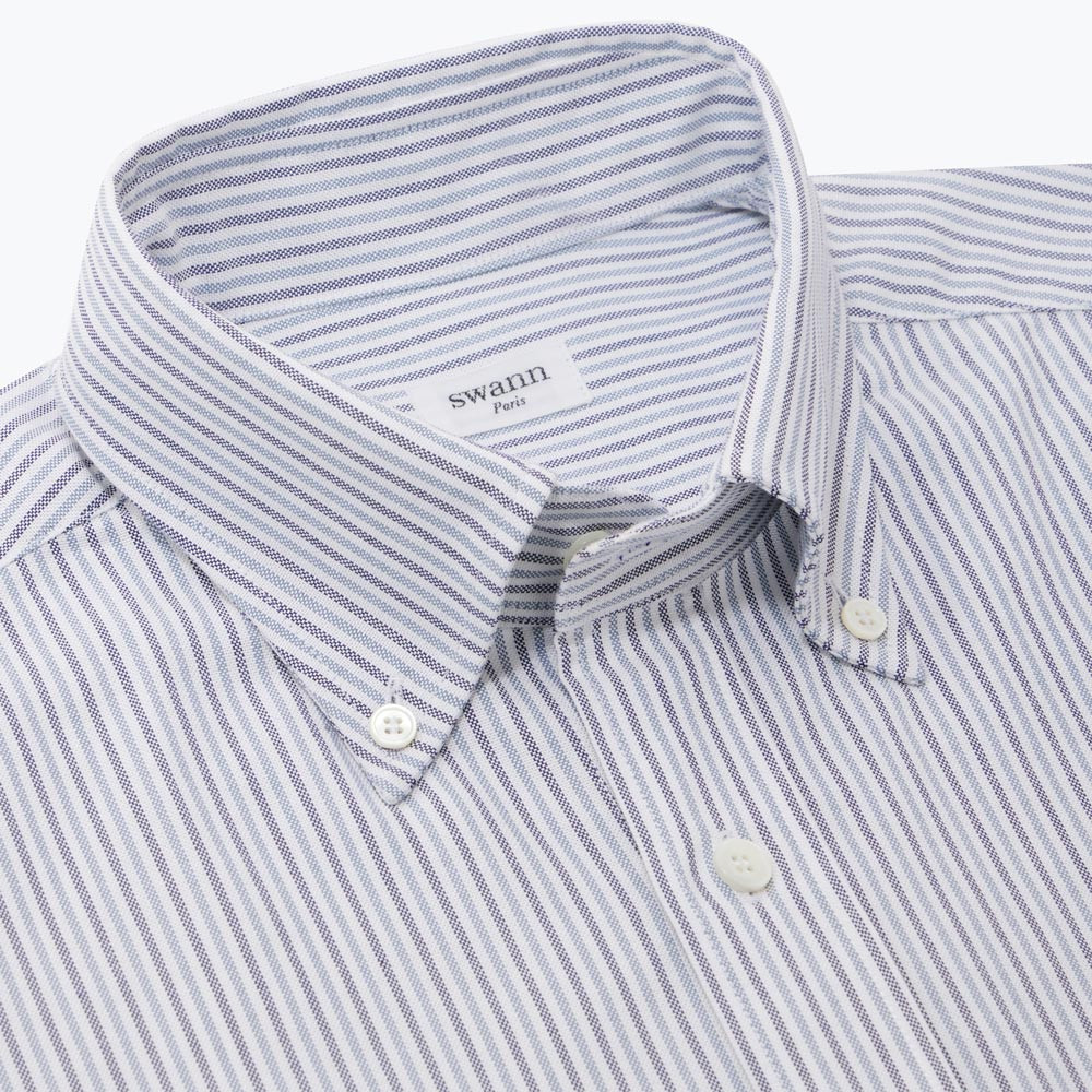 Oxford rayé bleu et marine Albini. Un grand classique, une construction solide à porter hiver comme été qui va se patiner et gagner en confort avec le temps. Probablement notre meilleure qualité d'oxford épais.