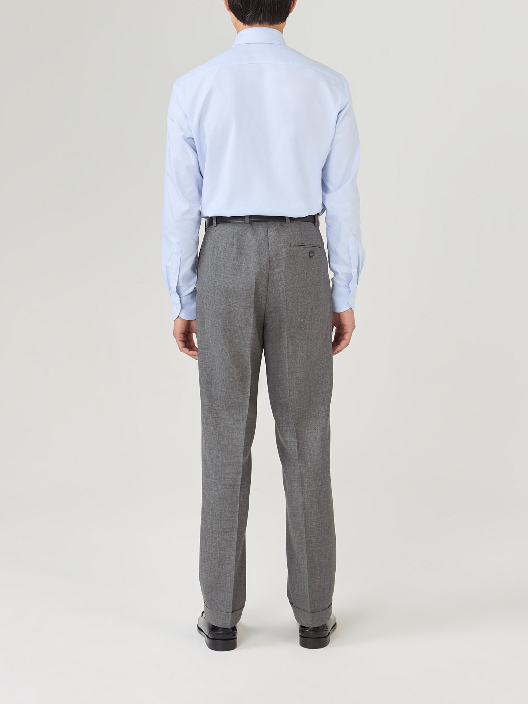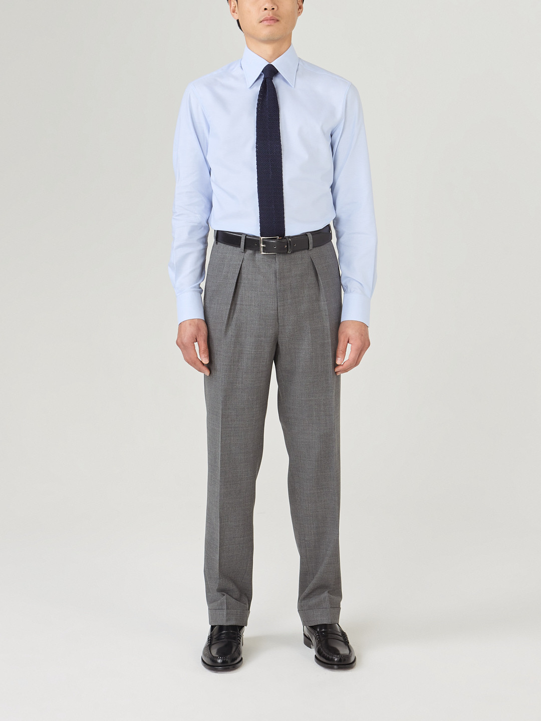 Oxford double retors uni bleu clair de chez Albini. Un tissu relativement épais mais souple et respirant, tissé en ITALIE. Nous vous conseillons d'opter pour un col boutonné, une gorge américaine et une poche.