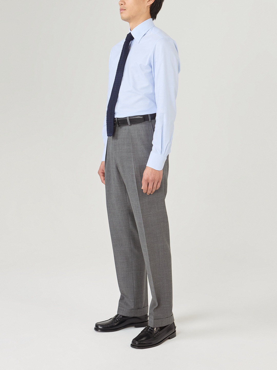 Tous nos vêtements sont coupés à la demande, nous pouvons donc réaliser la coupe ou le style que vous souhaitez indépendamment des modèles présentés ici. Demandez-nous.