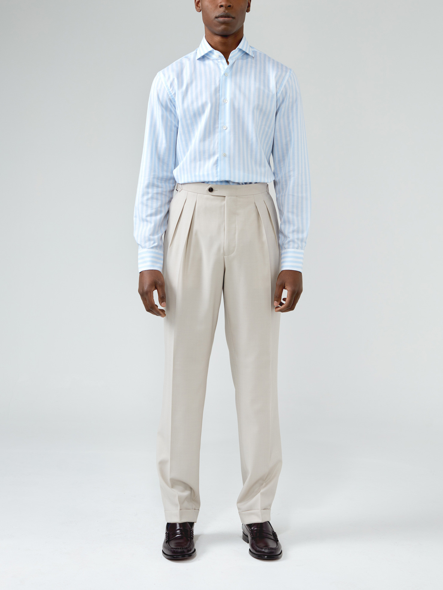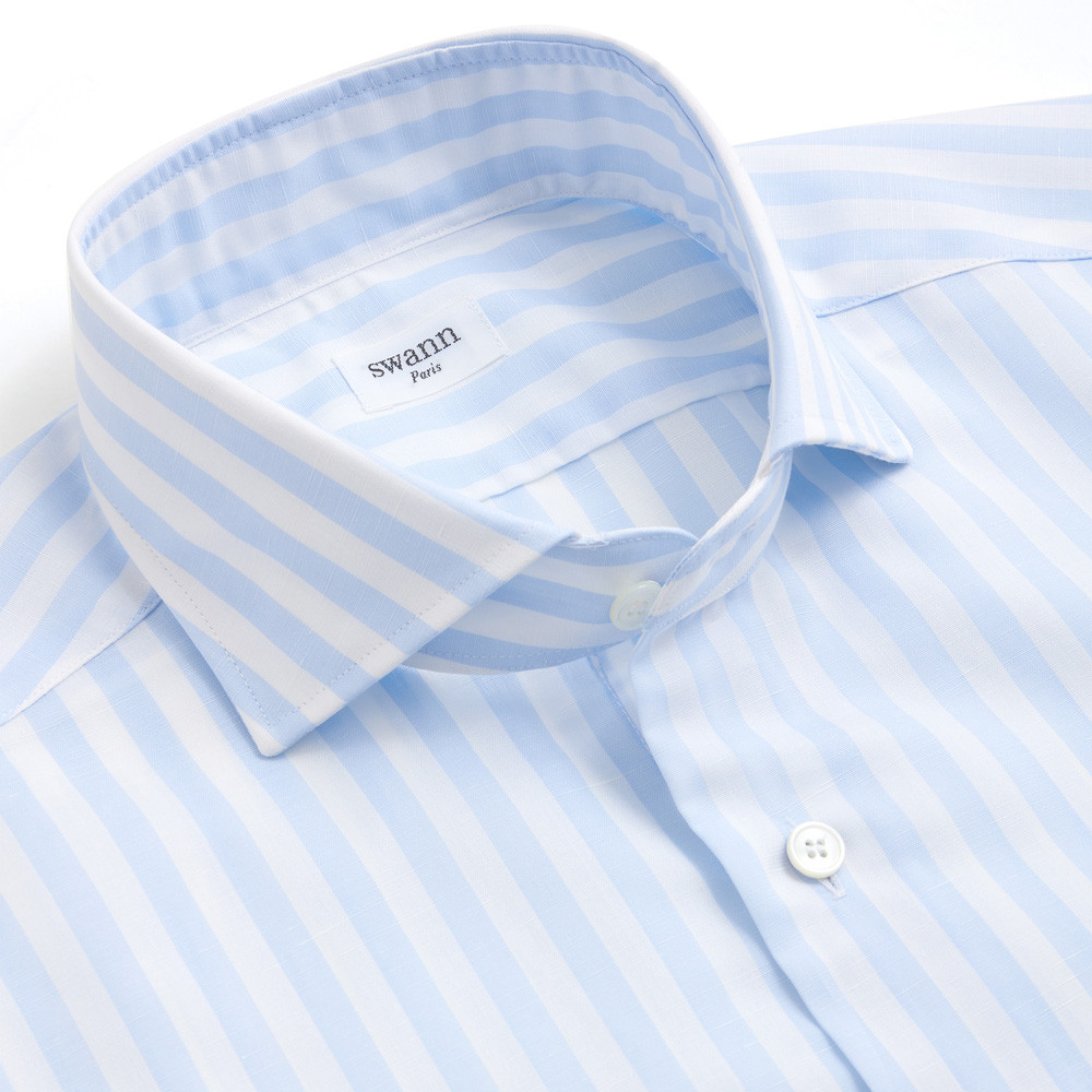 Popeline coton et lin Thomas Mason, double retors rayé bleu. Le tissu idéal pour l'été : une proportion de coton importante pour une belle tenue et un aspect soigné, 29% de lin pour une chemise fraiche et très agréable à porter par forte chaleur.