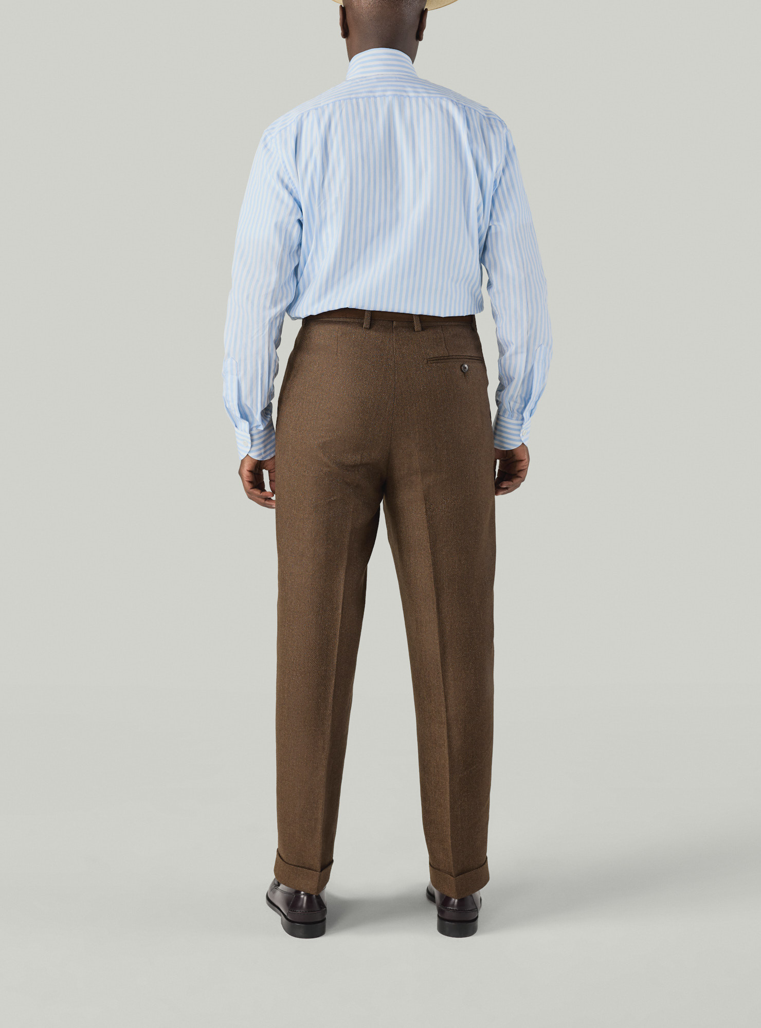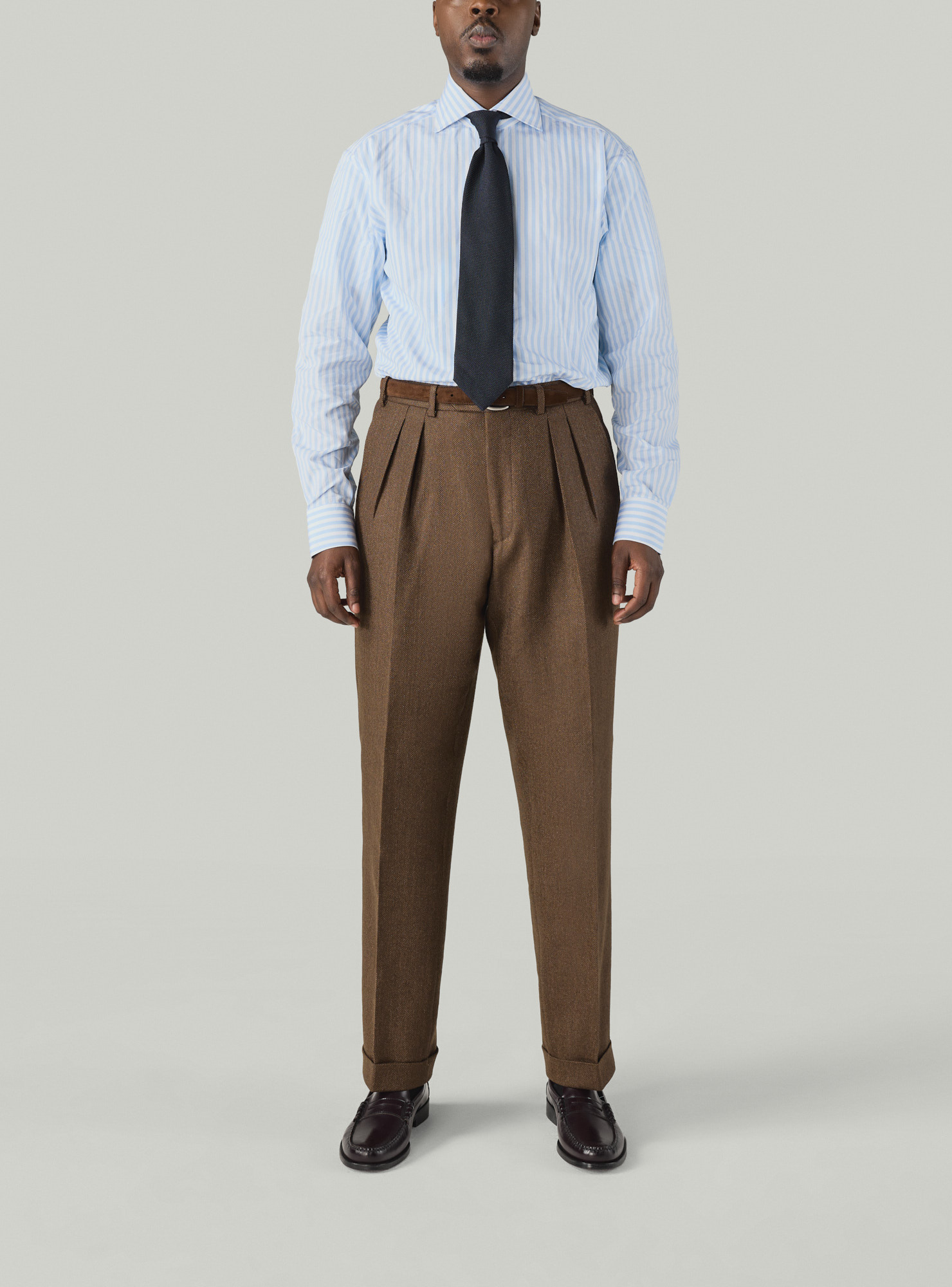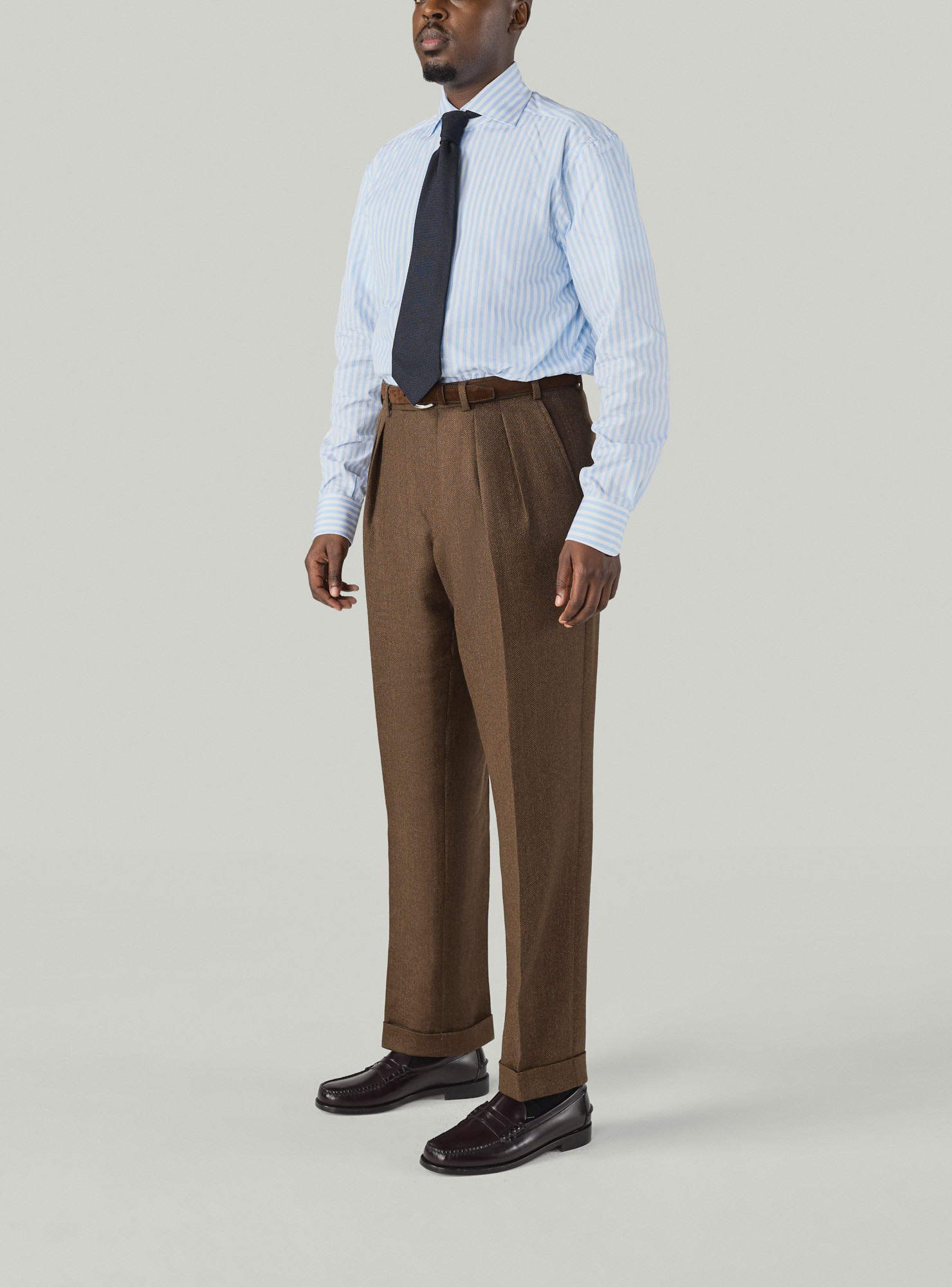 Tous nos vêtements sont coupés à la demande, nous pouvons donc réaliser la coupe ou le style que vous souhaitez indépendamment des modèles présentés ici. Demandez-nous.