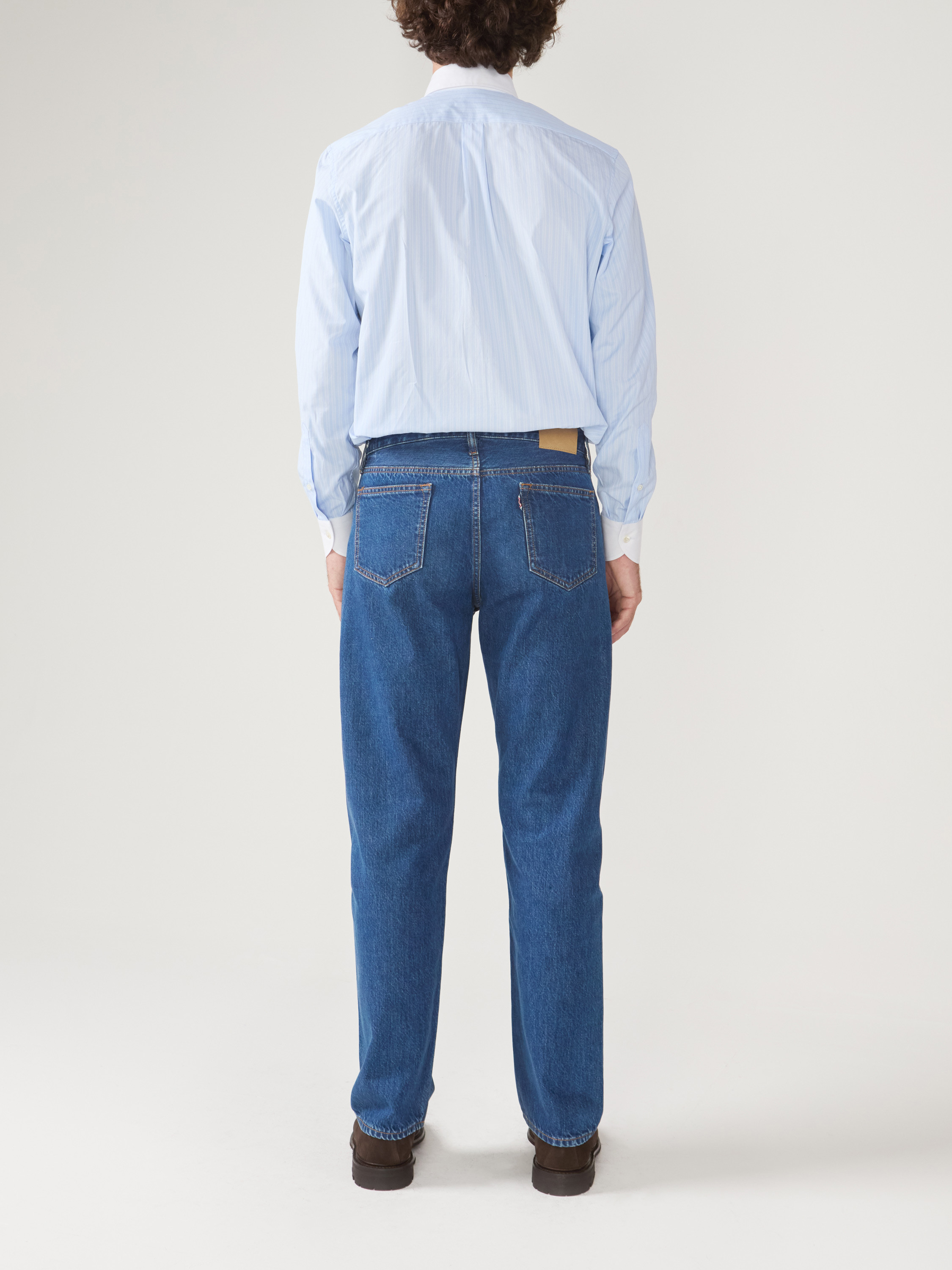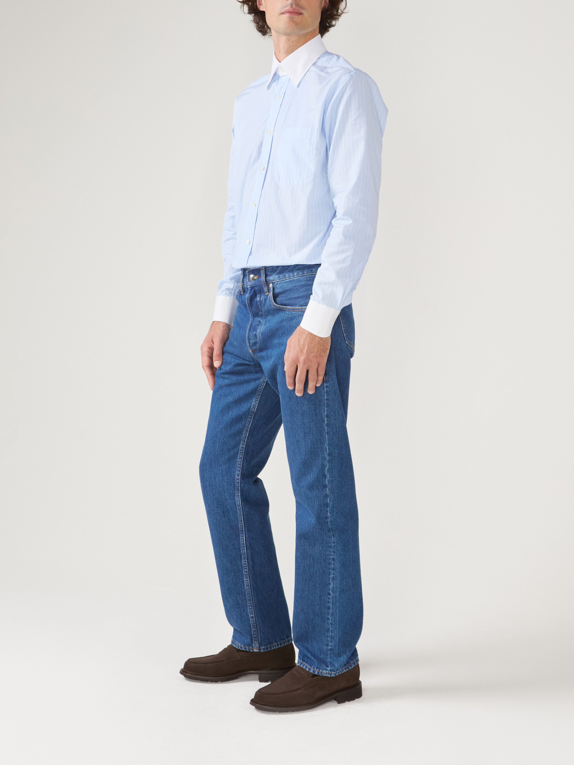 Popeline 120/2 Thomas Mason bleu à rayures. Tissé en Italie, le tissu est ensuite lavé pour lui donner un rendu mat, doux et souple.