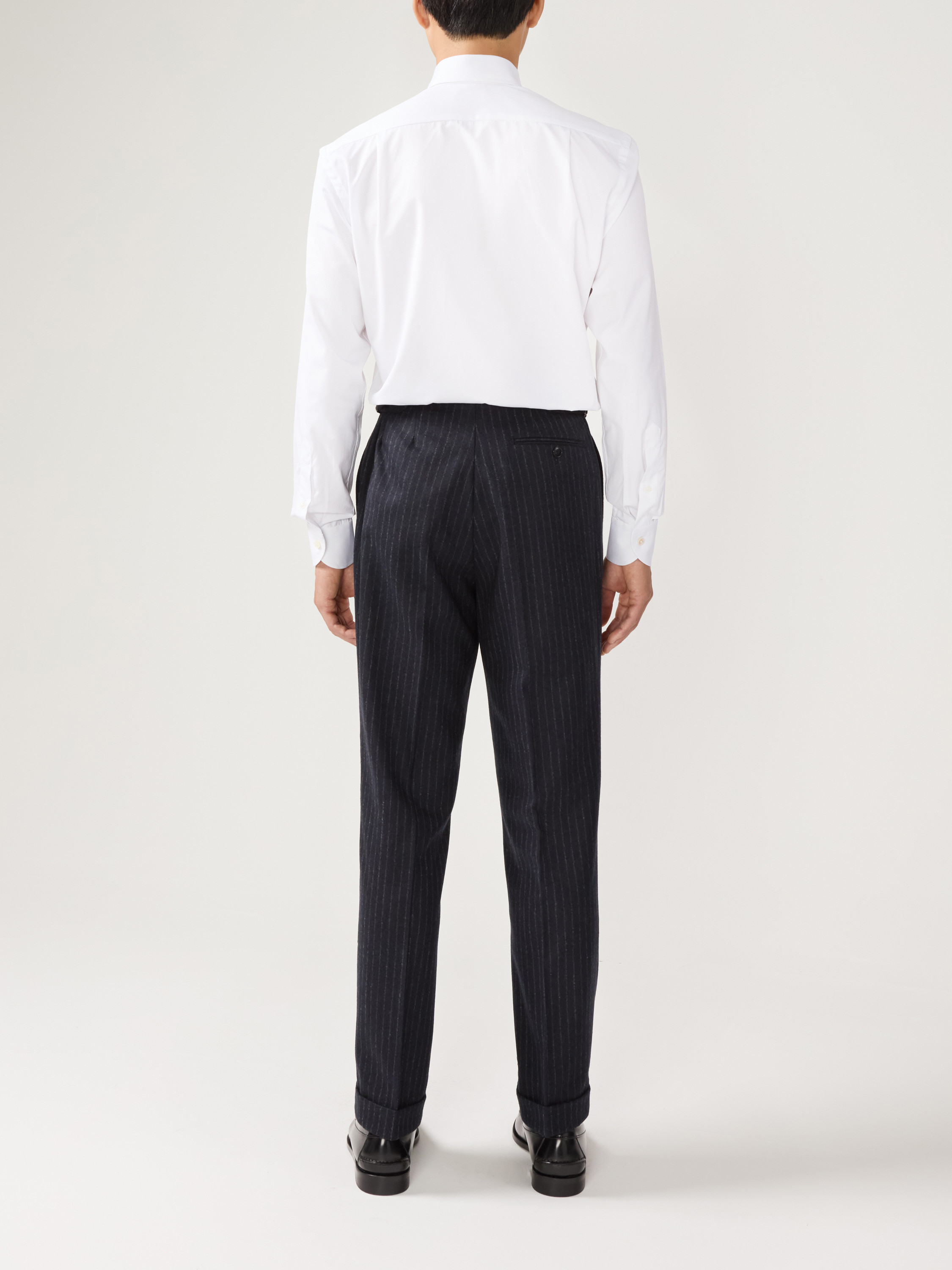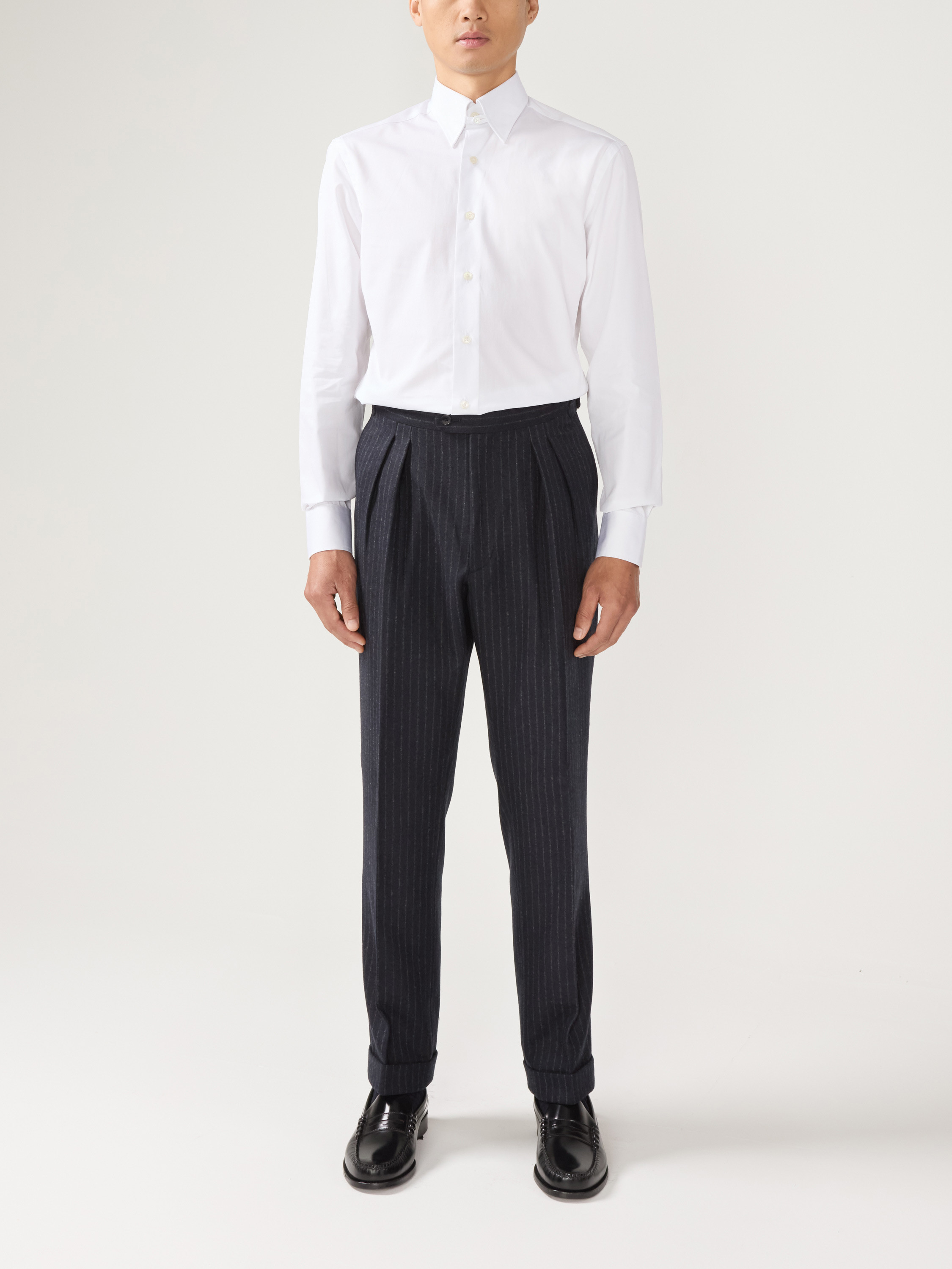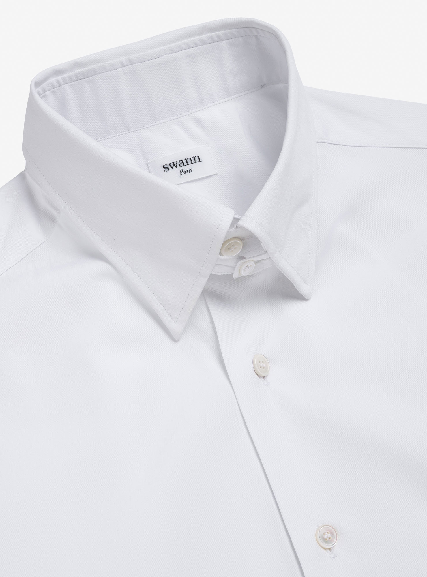 Popeline blanche doublre retors 100/2. Tissu épais et exceptionnellement opaque pour une popeline blanche. Convient aussi bien pour des chemises de cérémonie que pour des chemises plus décontractées.