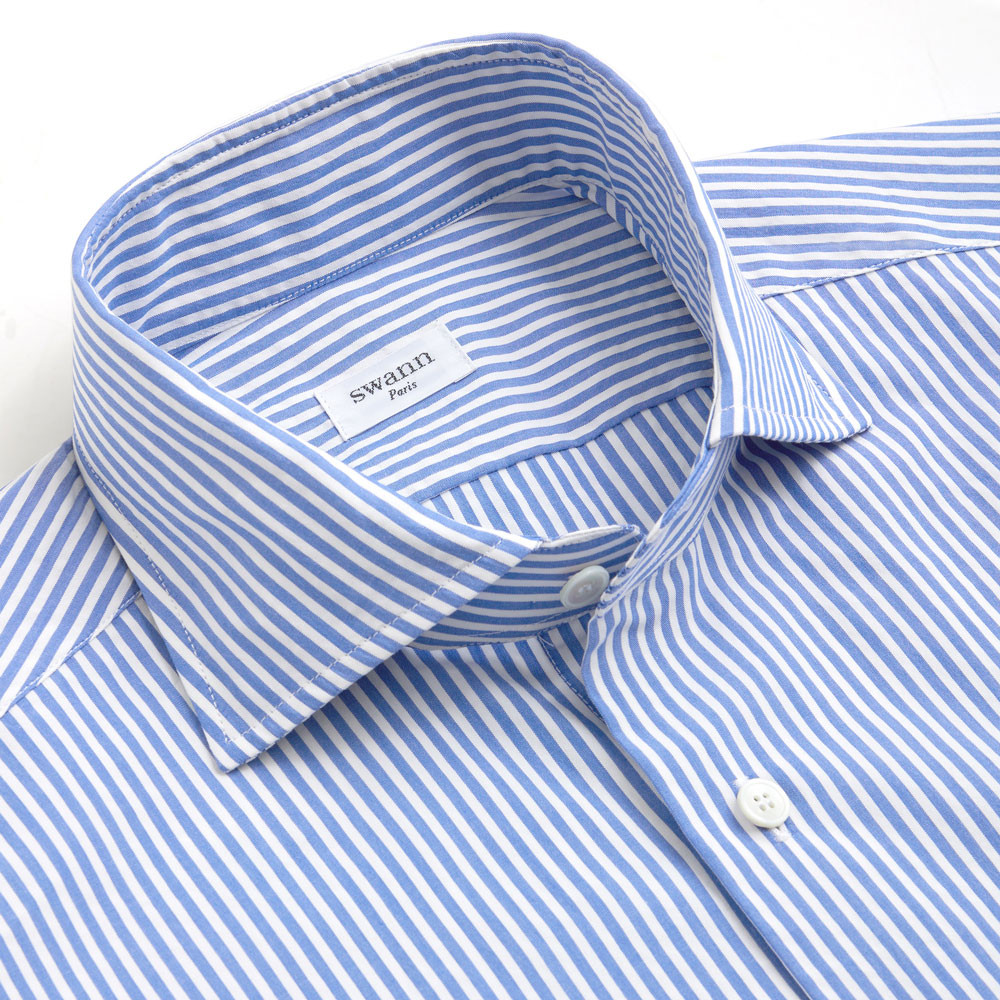Seersucker rayé bleu, Thomas Mason. Le seersucker se froisse peu, c'est un tissu confortable et très agréable à porter même lorsque les températures sont élevées. Il peut se porter habillé sous un costume en coton ou en laine froide ou de façon très décontractée.