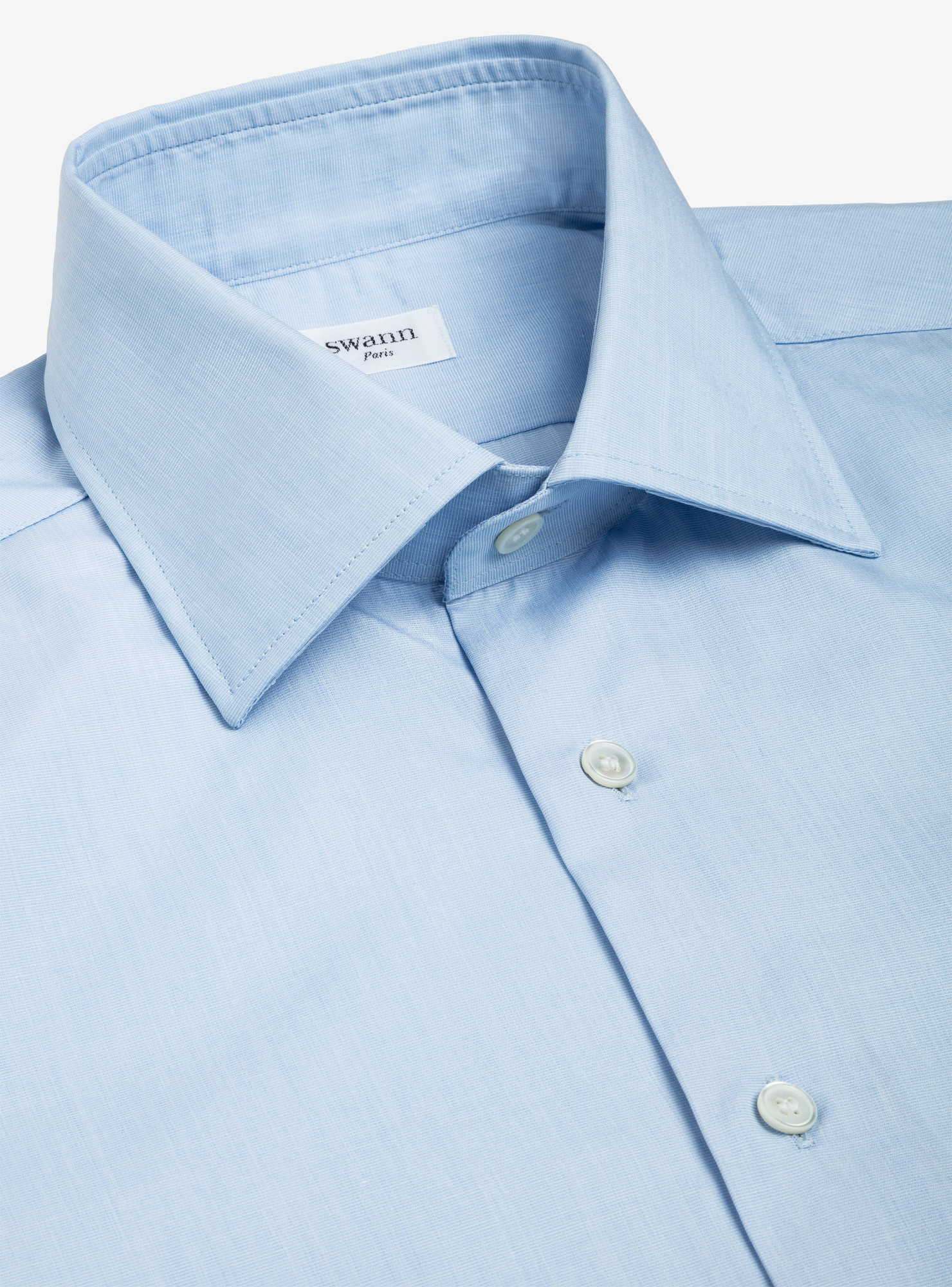 Tissu double retors 120's. Fil à Fil bleu ciel très lumineux, un grand classique. Très belle popeline particulièrement agréable à porter.