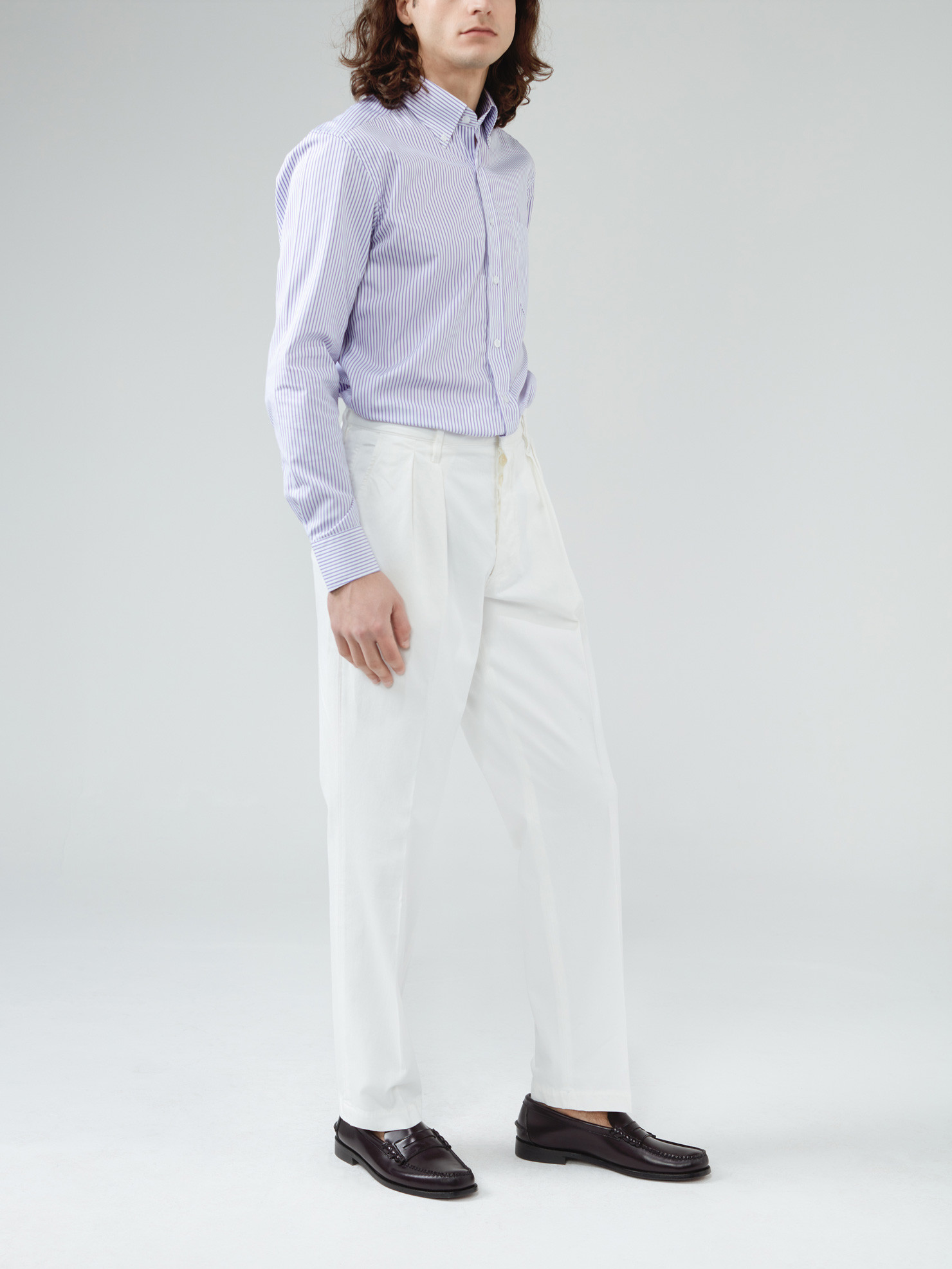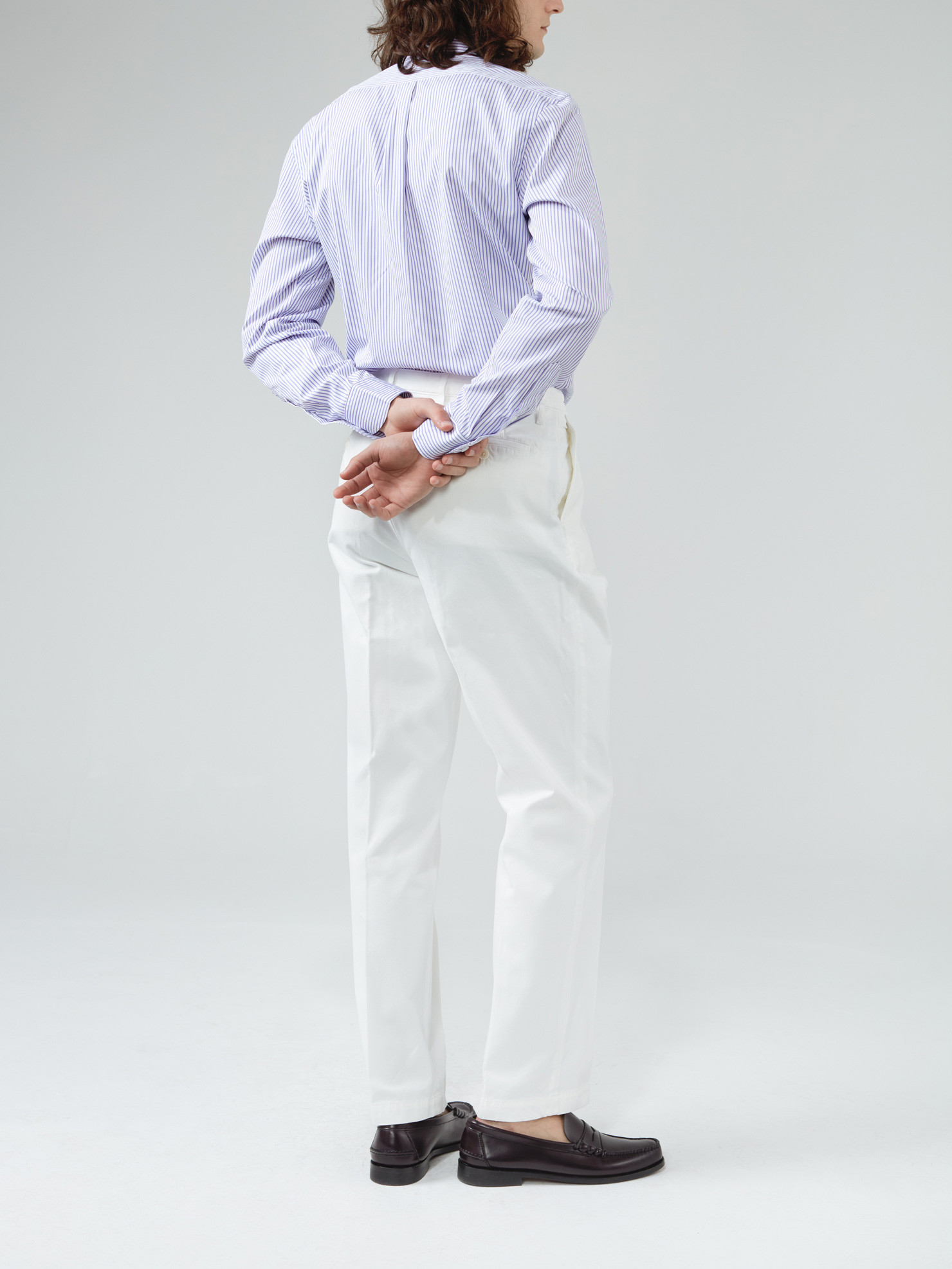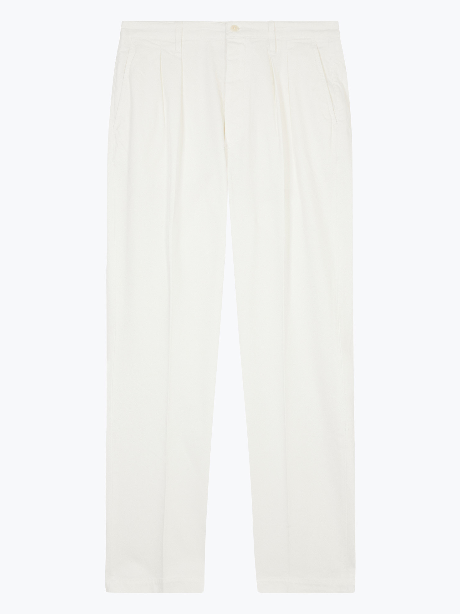 Chino classique, toile broken twill, doubles pinces intérieures, poches latérales obliques, poche arrière à passepoils et boutonnées, boutons en corozo, ourlet simple.