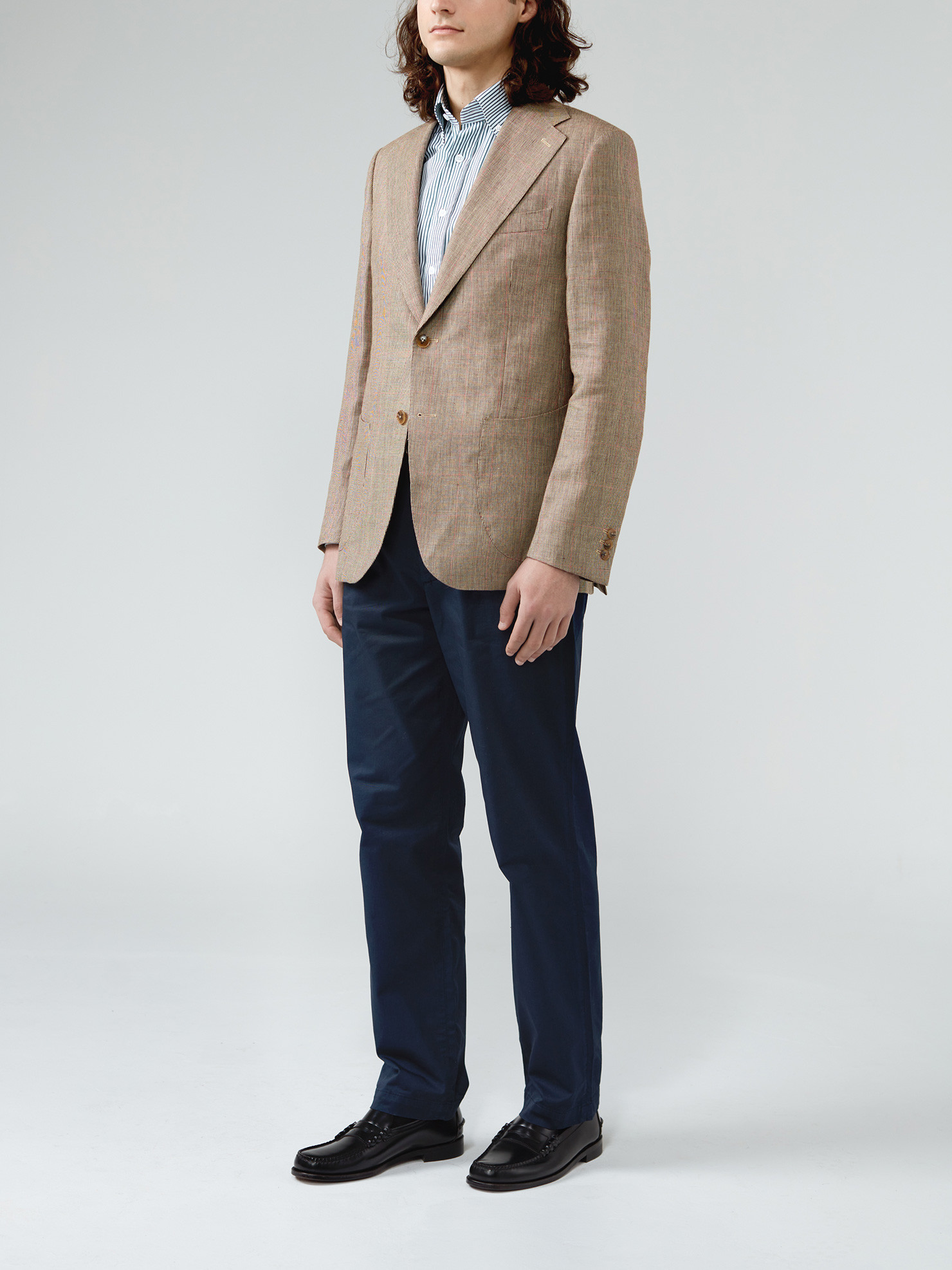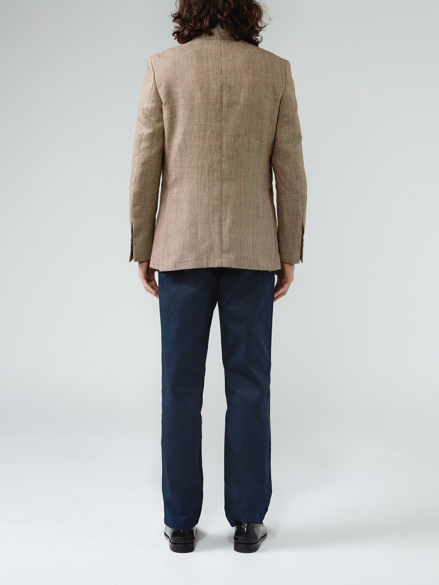 Veste Laine et Lin à motif Gun Club marron beige et rouge, revers classique, poches latérales à rabat, deux fentes dos, épaule classique avec cigarette, boutons en corne.