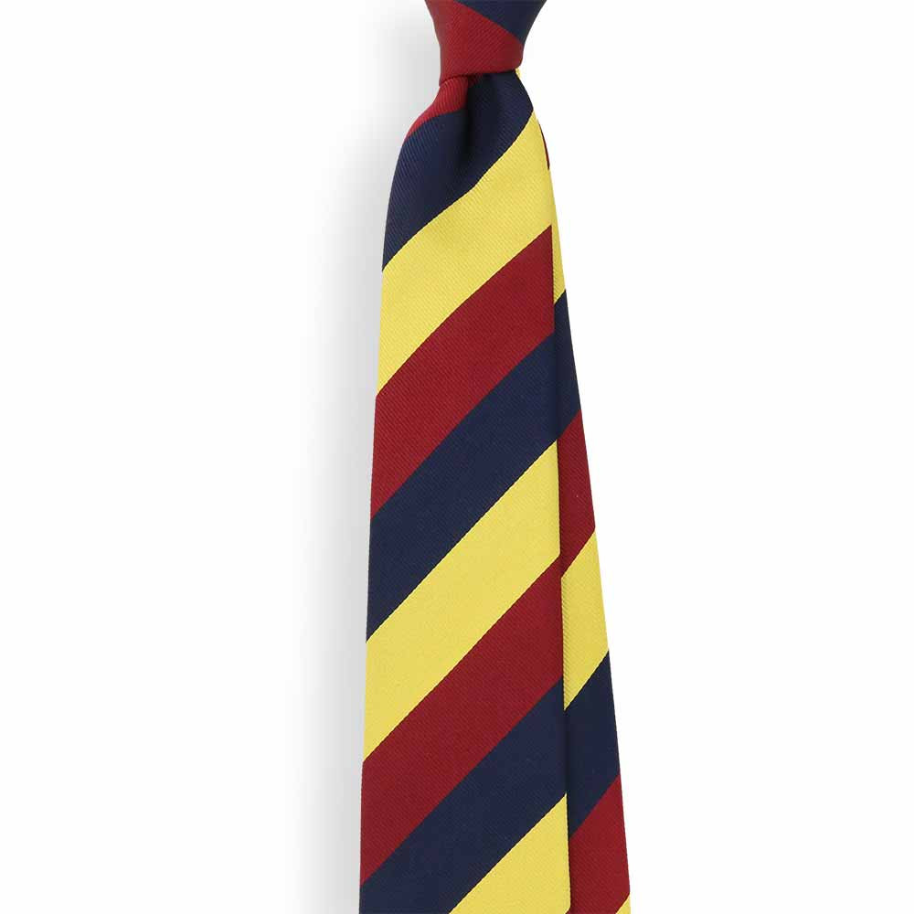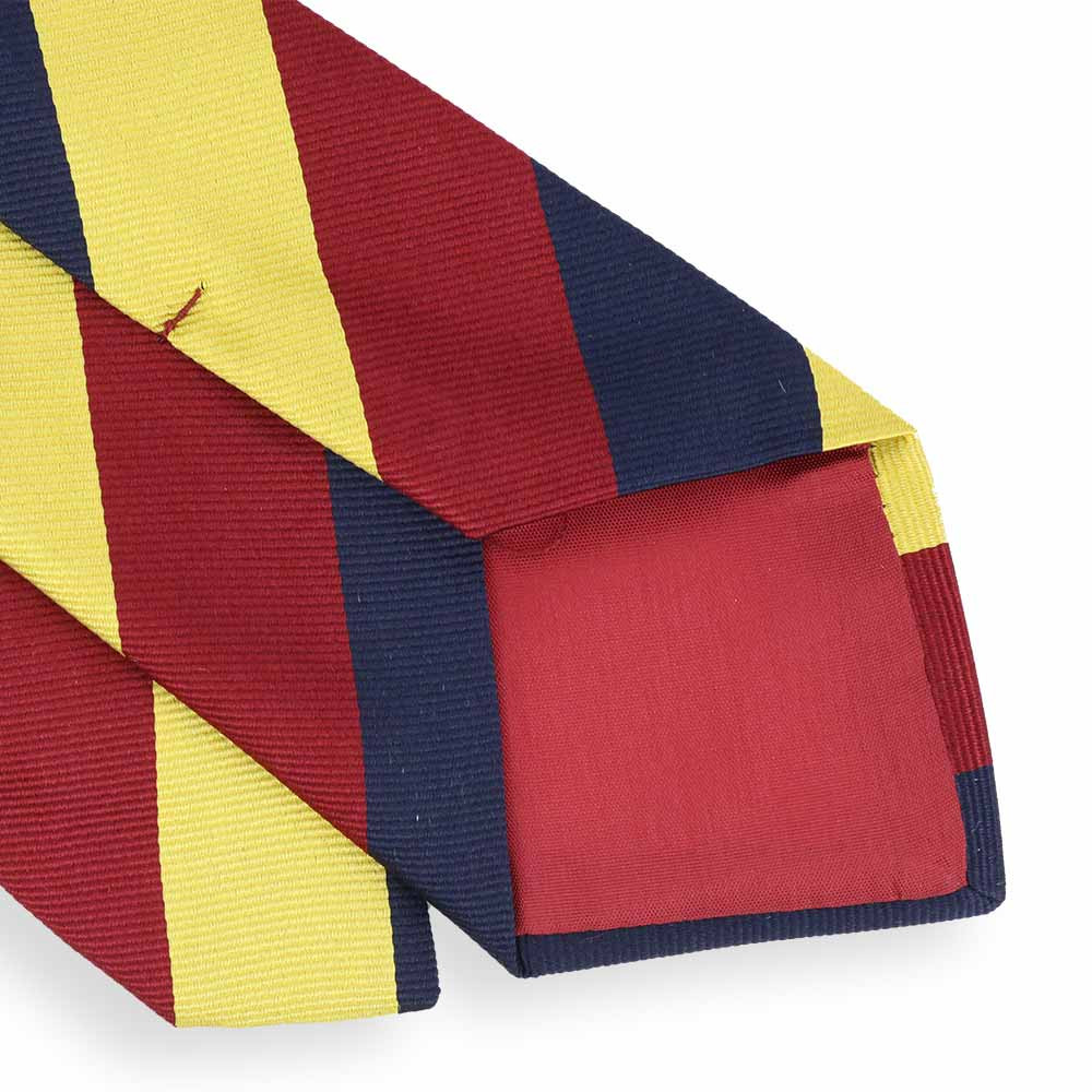 Cravate club bleu, jaune et rouge. Très élégant, inspiré des cravates "regimental" des corps d'armée anglais. Elle est fabriquée à Paris chez une façonnier centenaire.