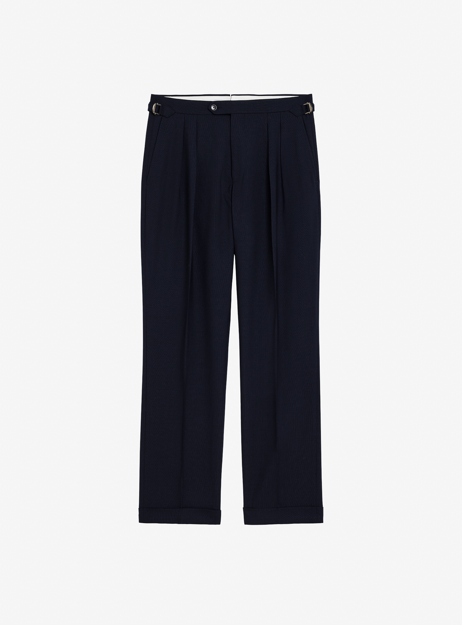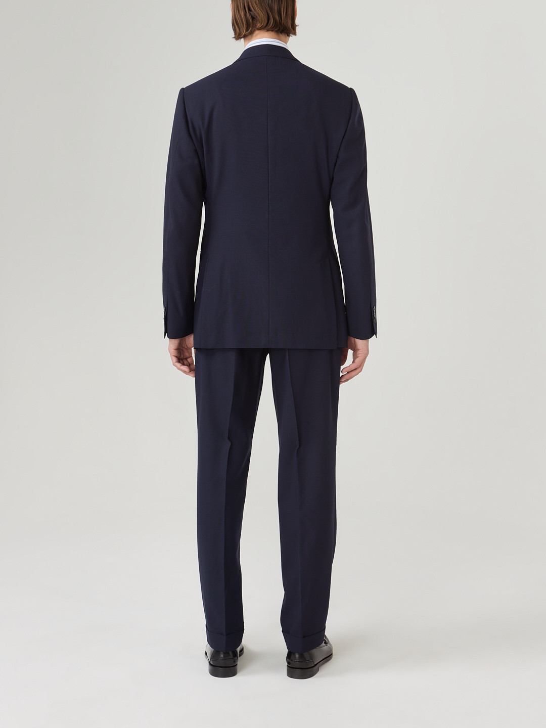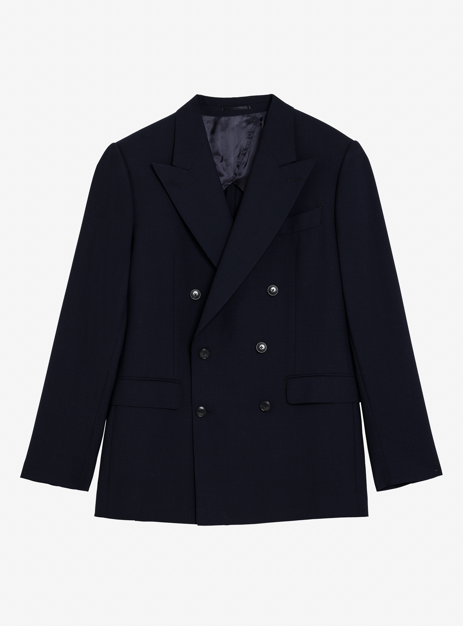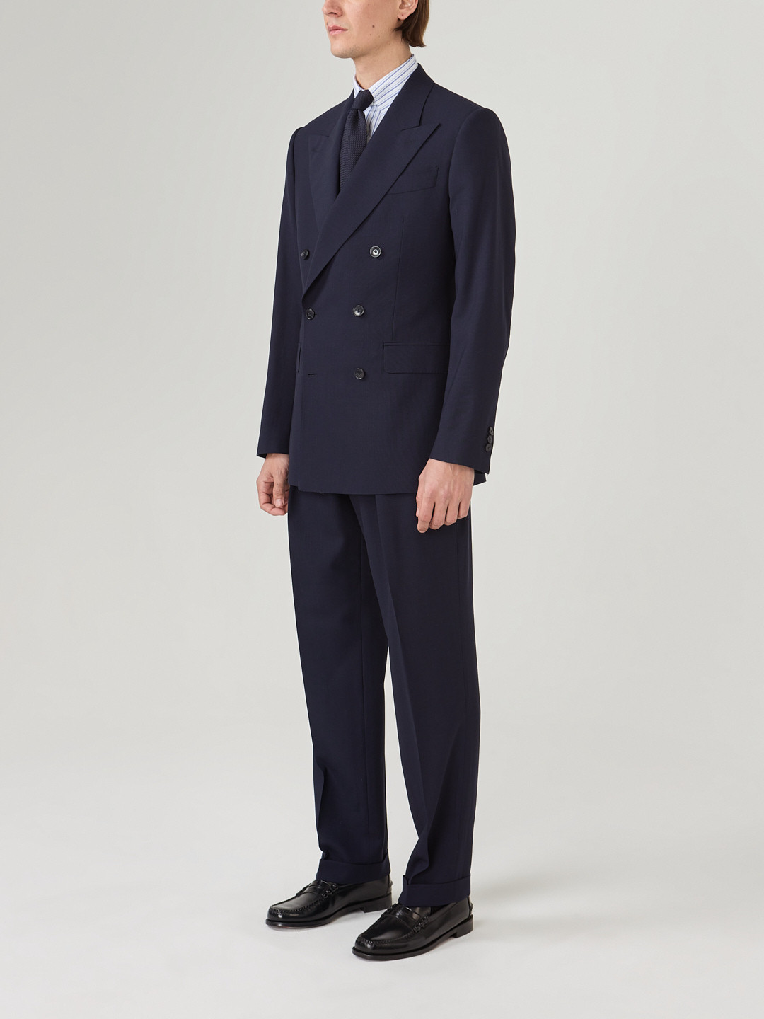 Costume croisé 6 boutons en laine bleu marine. Montage traditionnel, épaules structurées, poches latérales à rabat droit, 2 fentes dos, doublure intérieure semi doublée. Pantalon à pattes de serrage, deux pinces intérieures, bas revers.