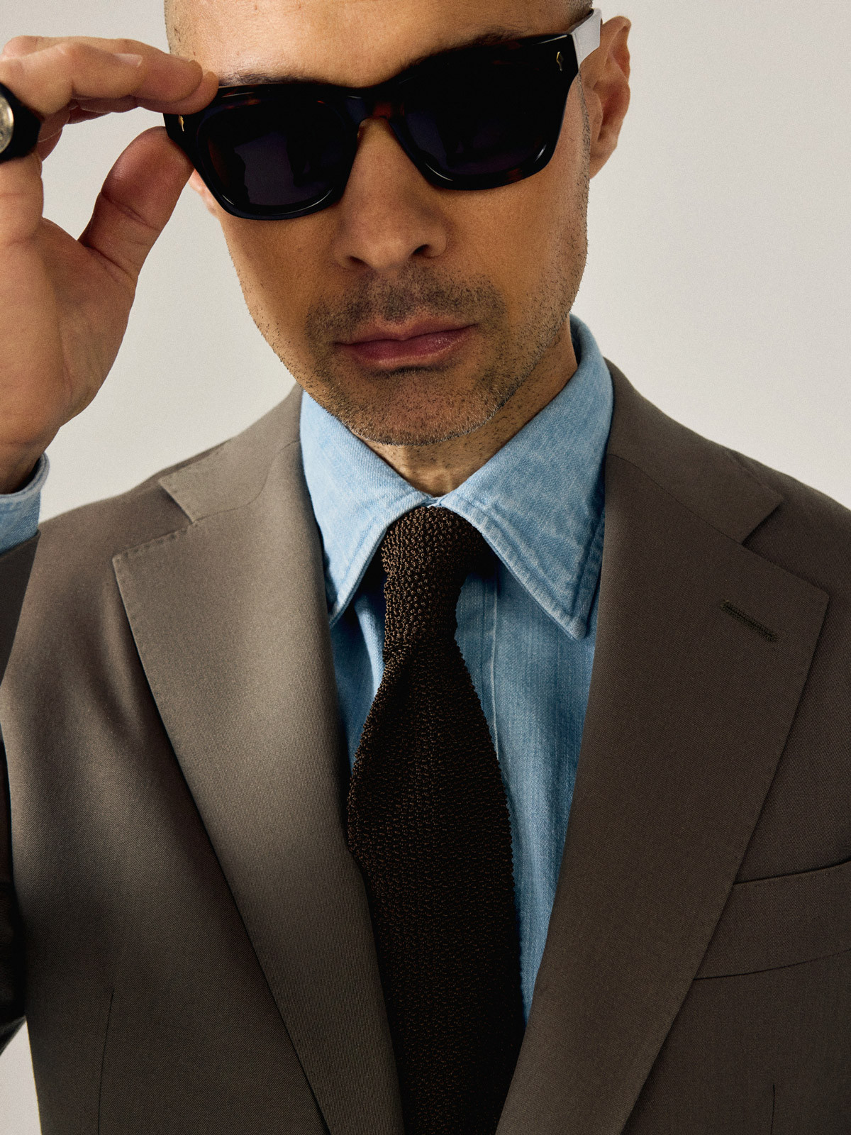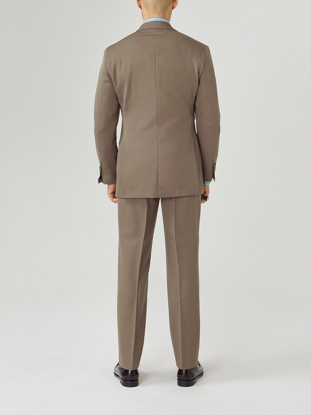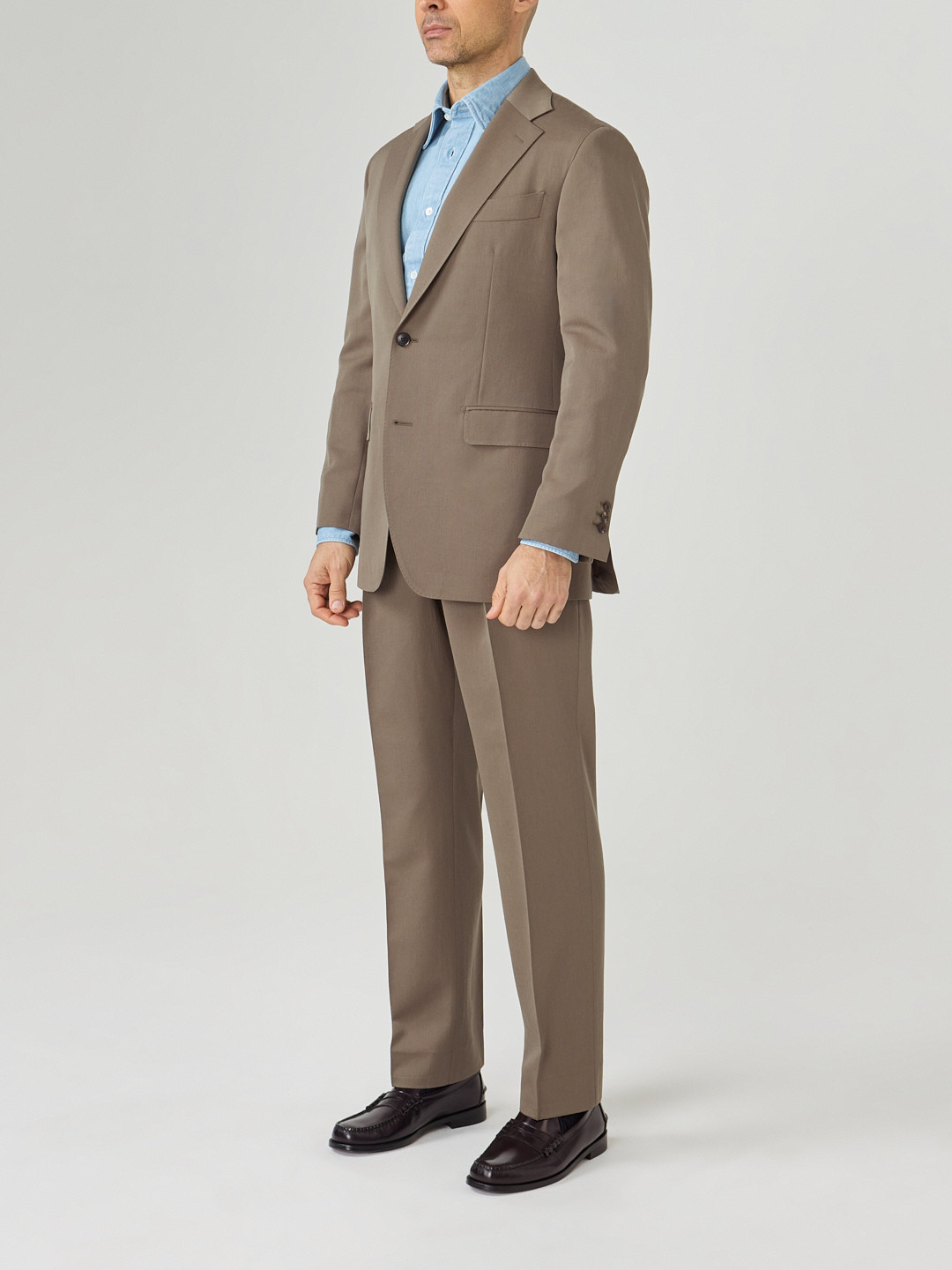 Ce costume est coupé dans une gabardine de laine japonaise, au toucher sec, au tombé fluide. Une matière rare : mate comme du coton, fraîche comme du lin, mais dotée d’une tenue remarquable.