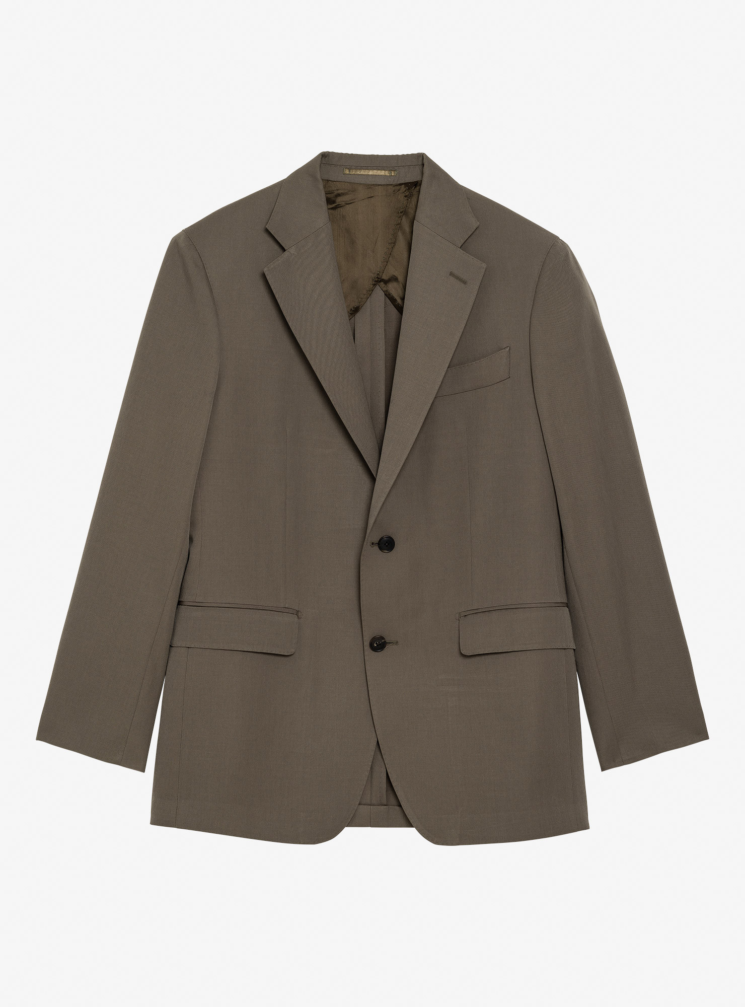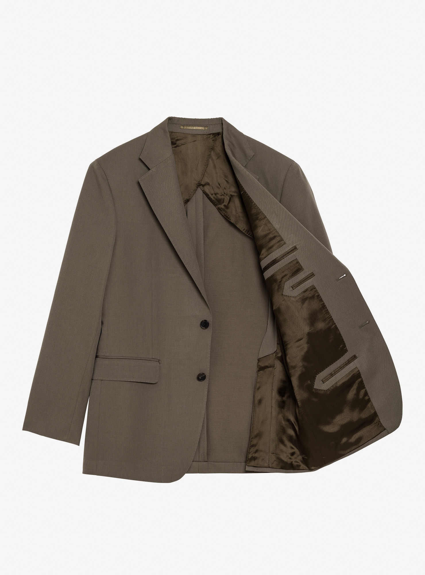 Costume droit 2 boutons en twill de laine olive. Montage traditionnelle, épaules souples, poche latérales à rabat, 2 fentes dos, doublure intérieure semi doublée. Pantalon avec passants de ceintures, 2 pinces intérieures, 1 poche arrière passepoillée, bas sans revers.