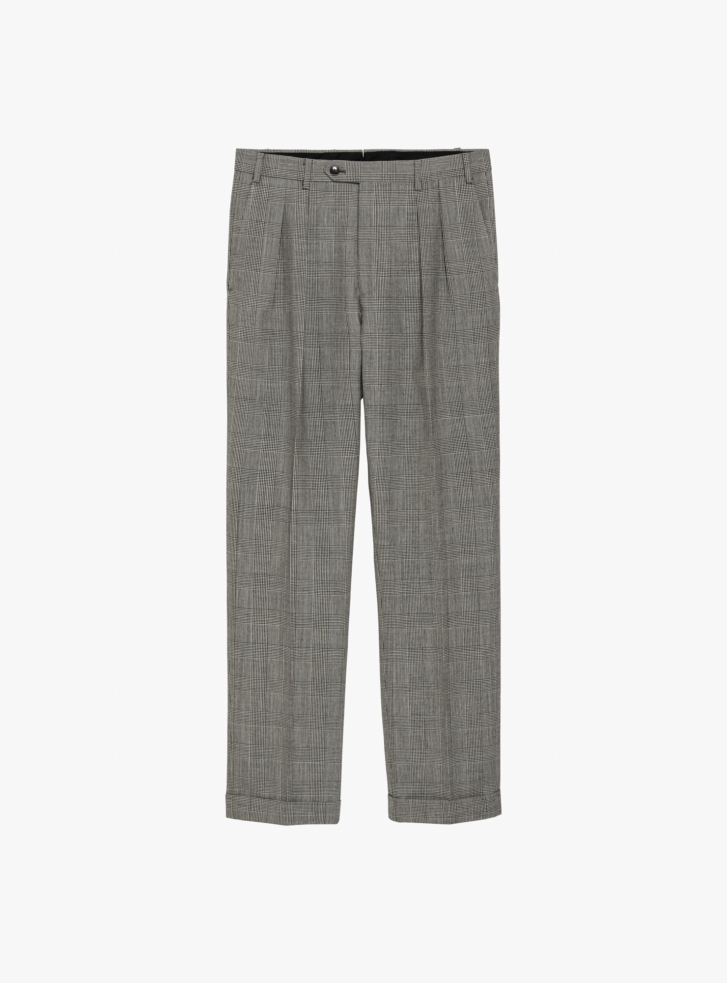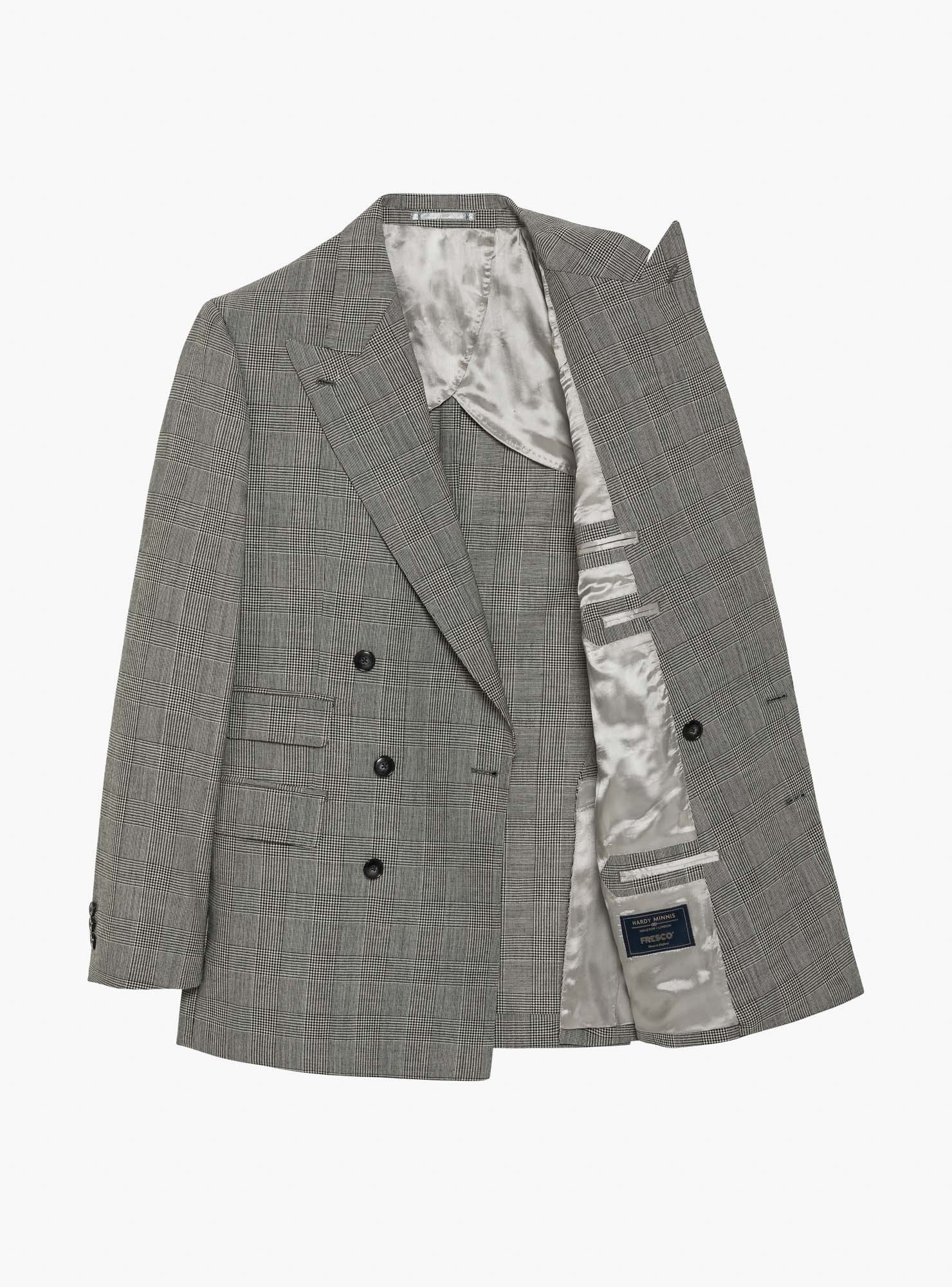 Costume croisé 6 boutons en Fresco à motif Prince de Galles. Montage traditionnel, épaules structurées, poches latérales à rabat droit et poche ticket, 2 fentes dos, doublure intérieure semi doublée. Pantalon avec passants de ceintures, deux pinces intérieures, bas revers de 4cm.