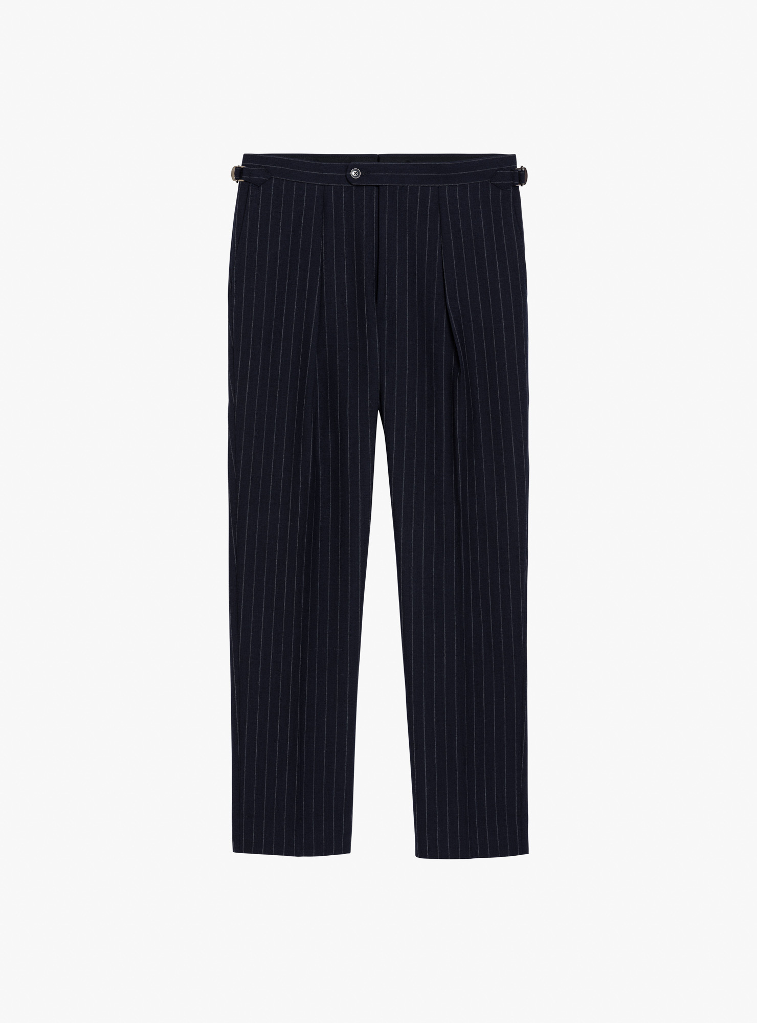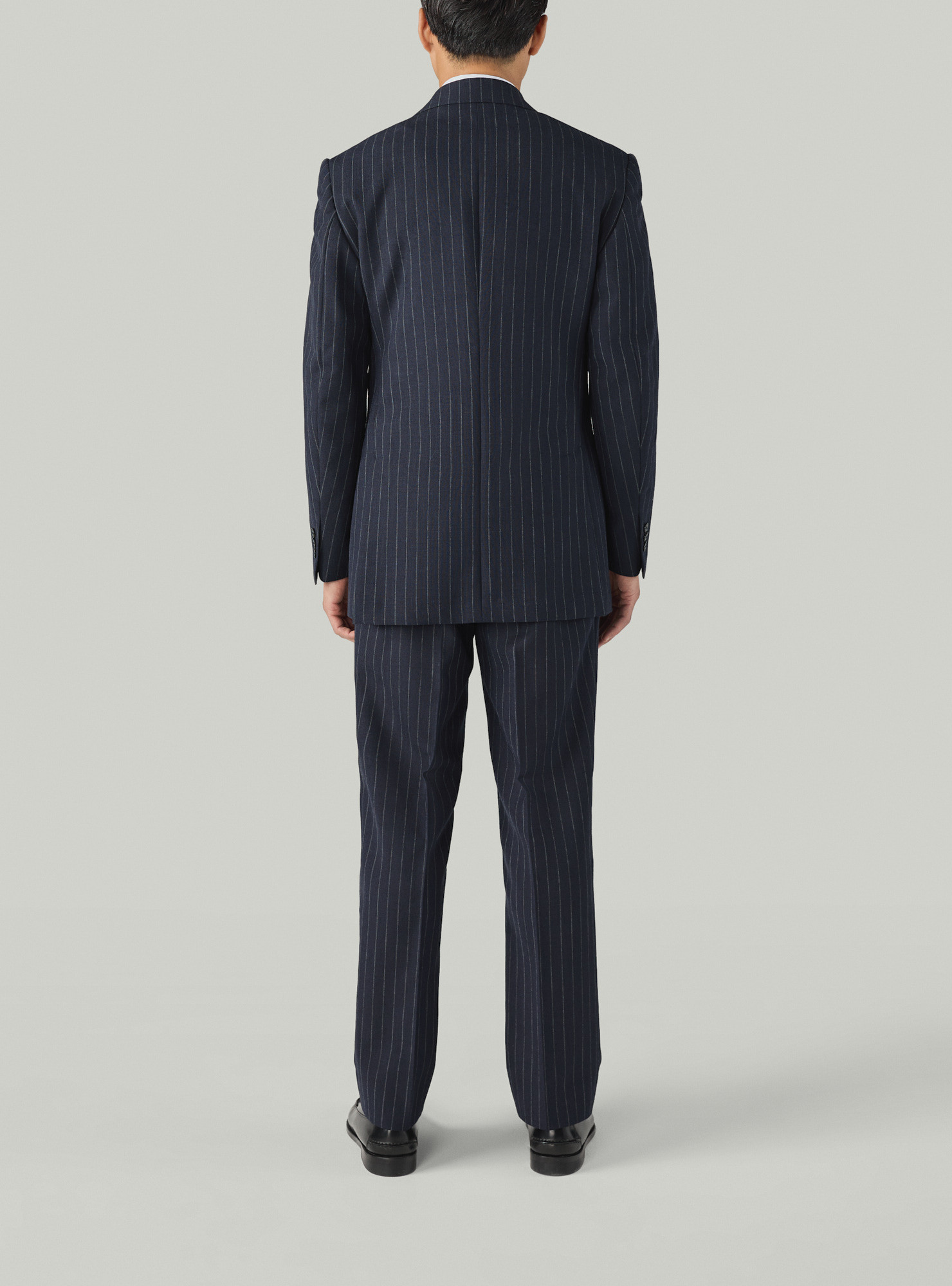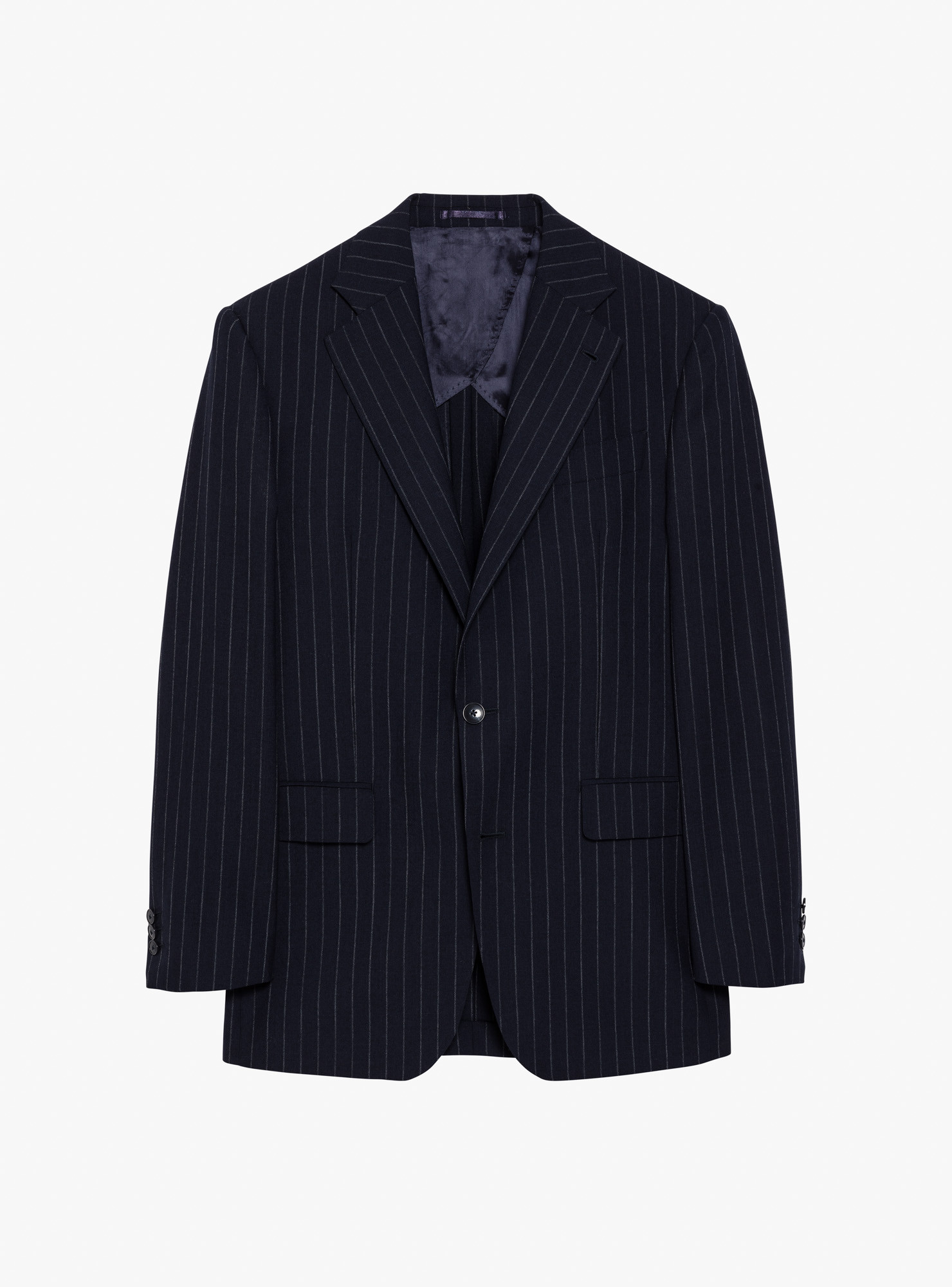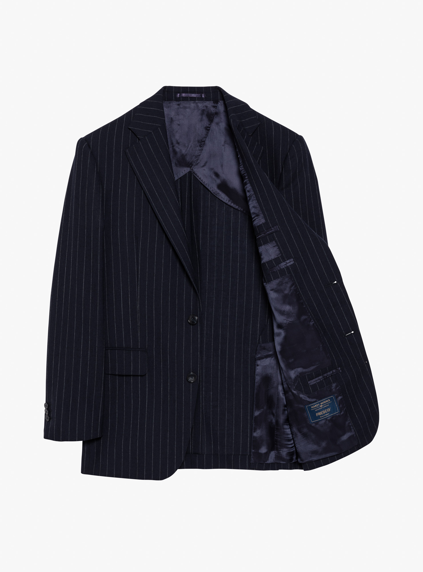 Costume droit 2 boutons en Fresco à rayures craies. Montage traditionnel, épaules avec épaulettes structurées, poches latérales à rabats droits, 2 fentes dos, doublure intérieure semi doublée. Pantalon à pattes de serrages, 1 pinces intérieure, bas simple sans revers.