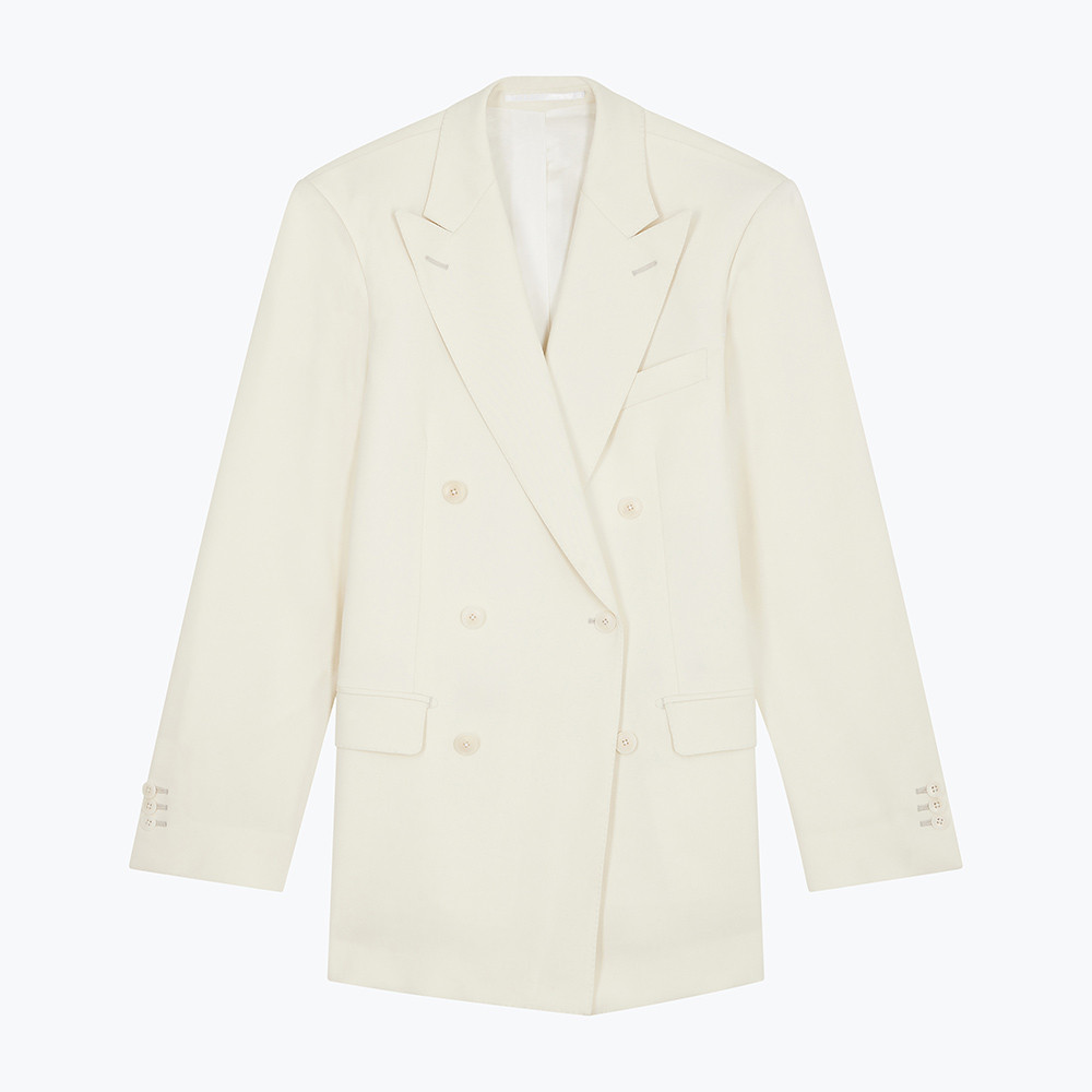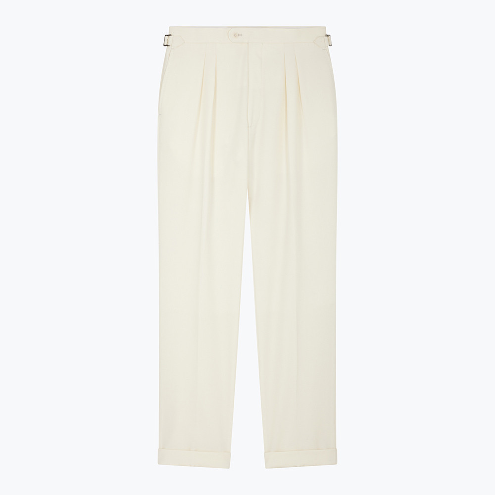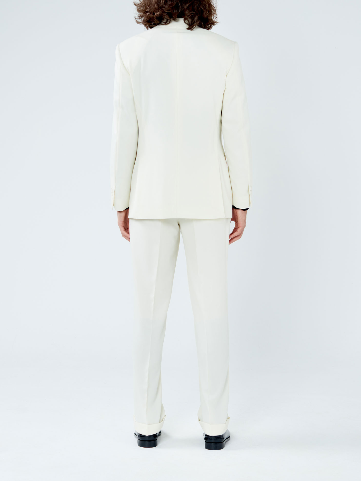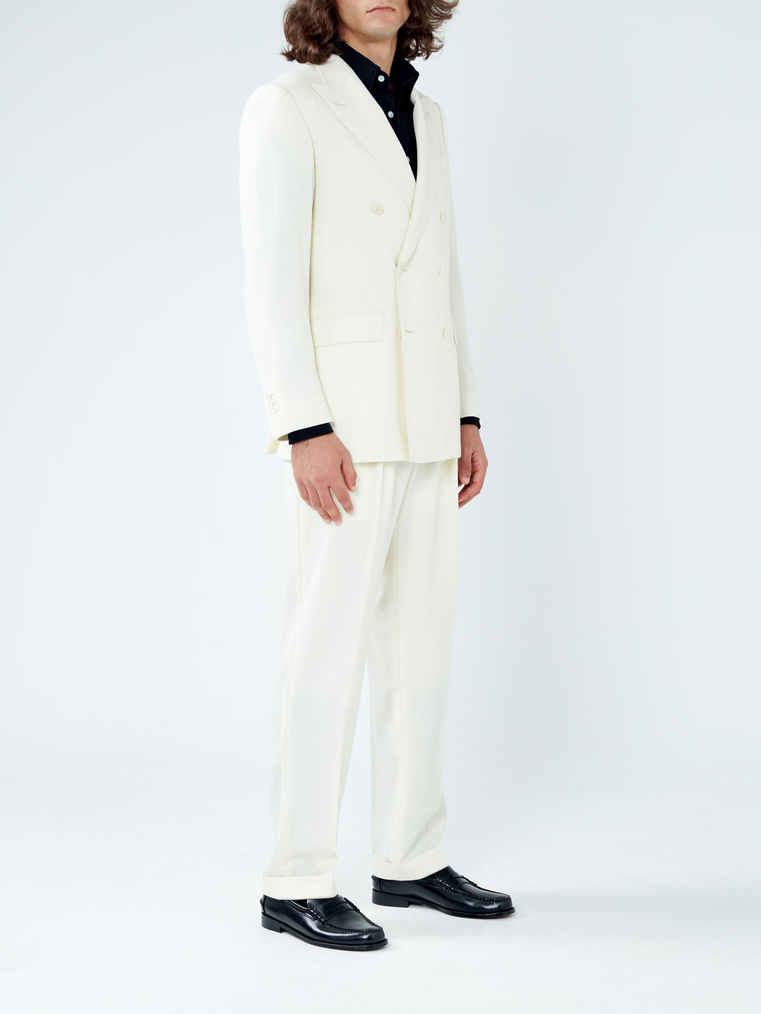 Costume Laine Ecru - Veste croisée six boutons, revers large cran aigu, épaule napolitaine, poche poitrine barchetta, deux poches droite à rabats, deux fentes dos - Pantalon classique avec deux pinces intérieures, pattes de serrage, poches latérales obliques, une poches droite à l'arrière, bas revers 4 cm.