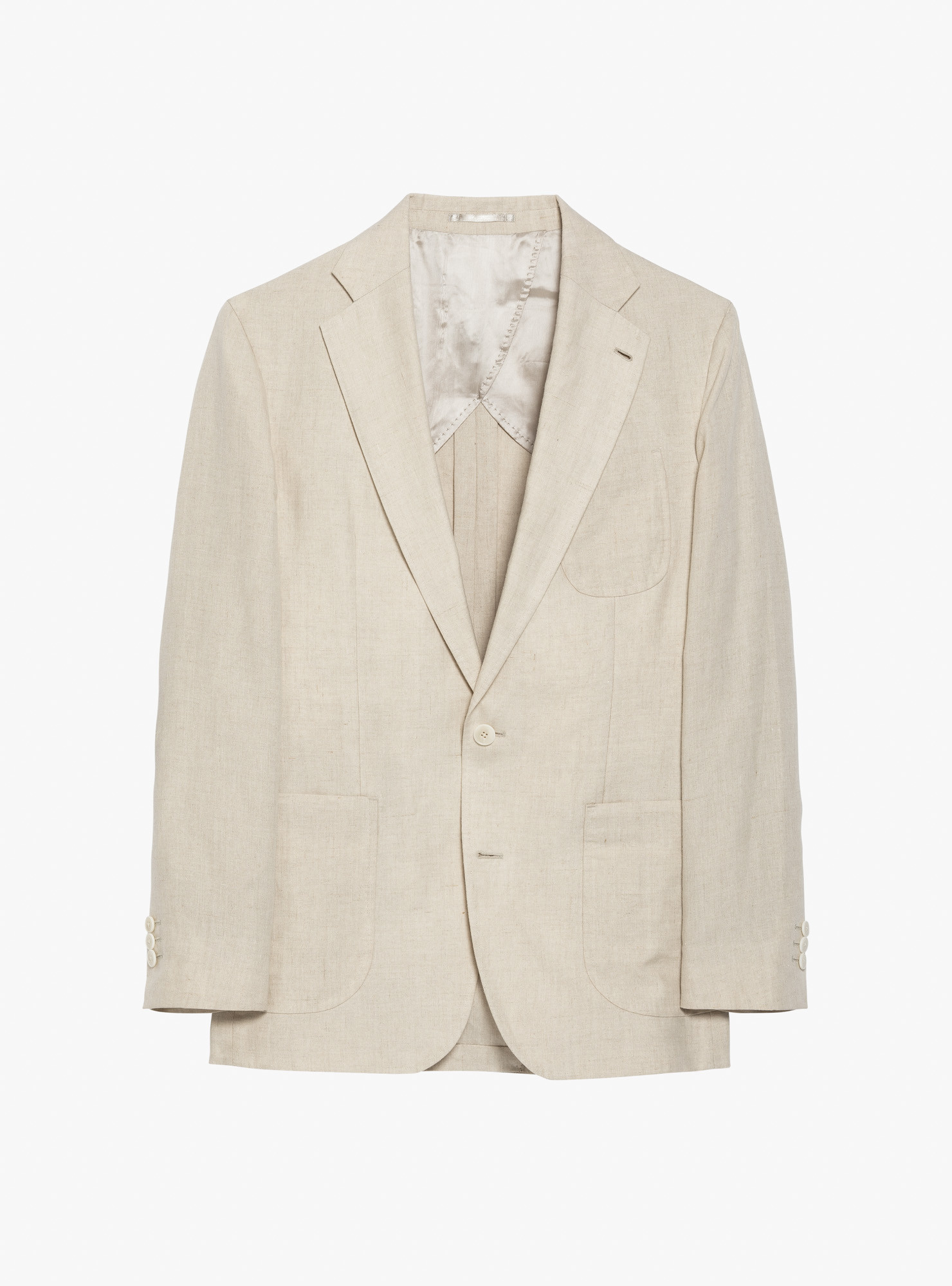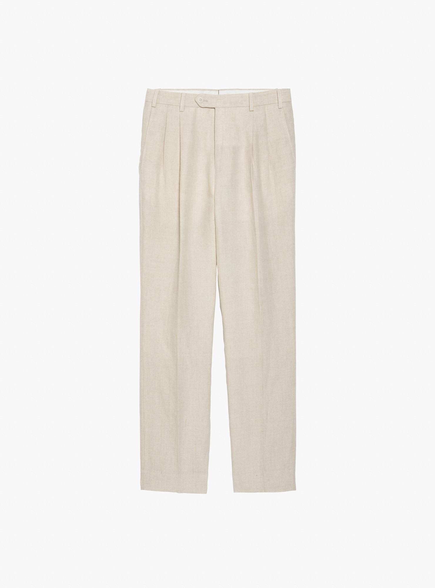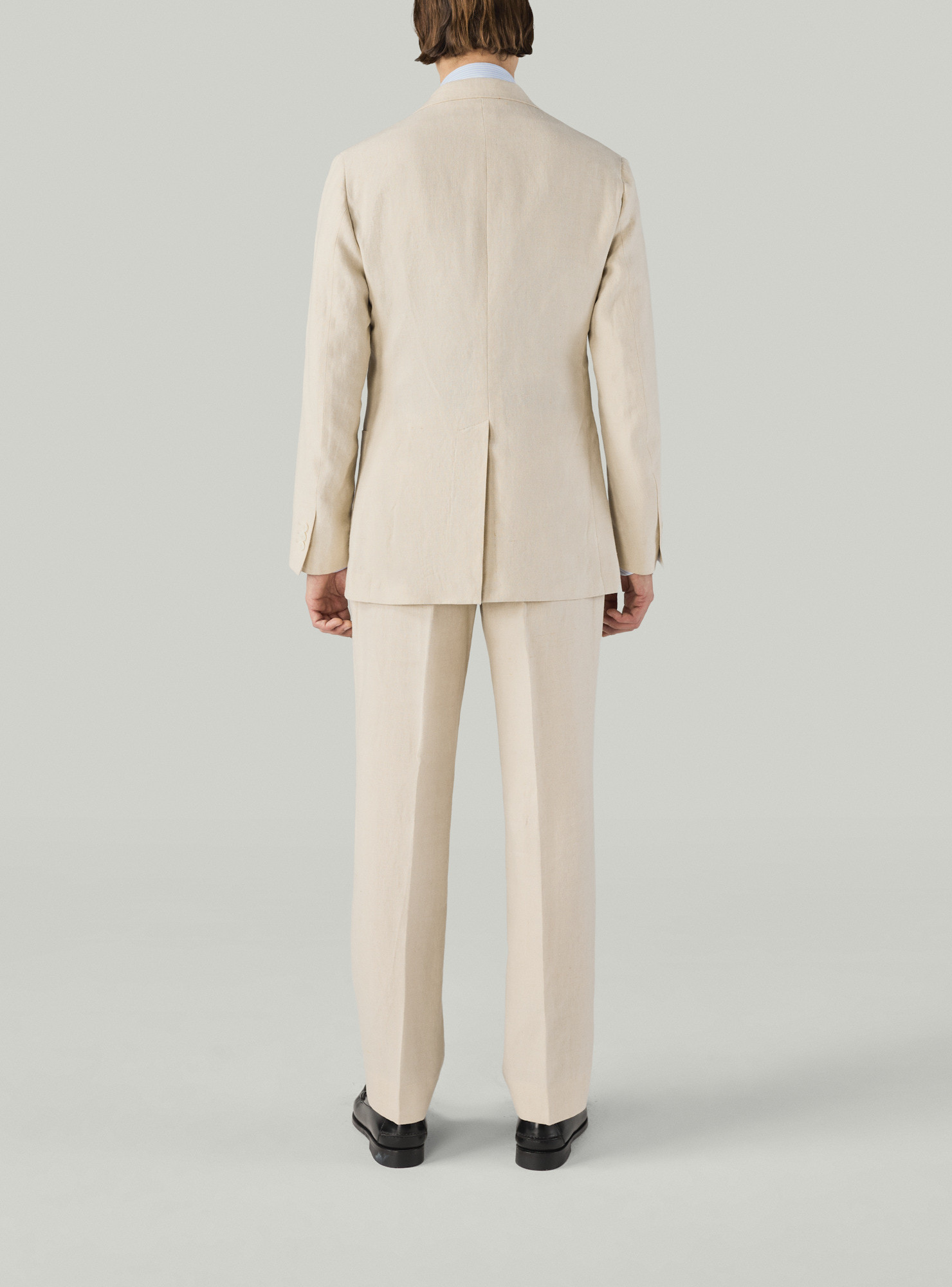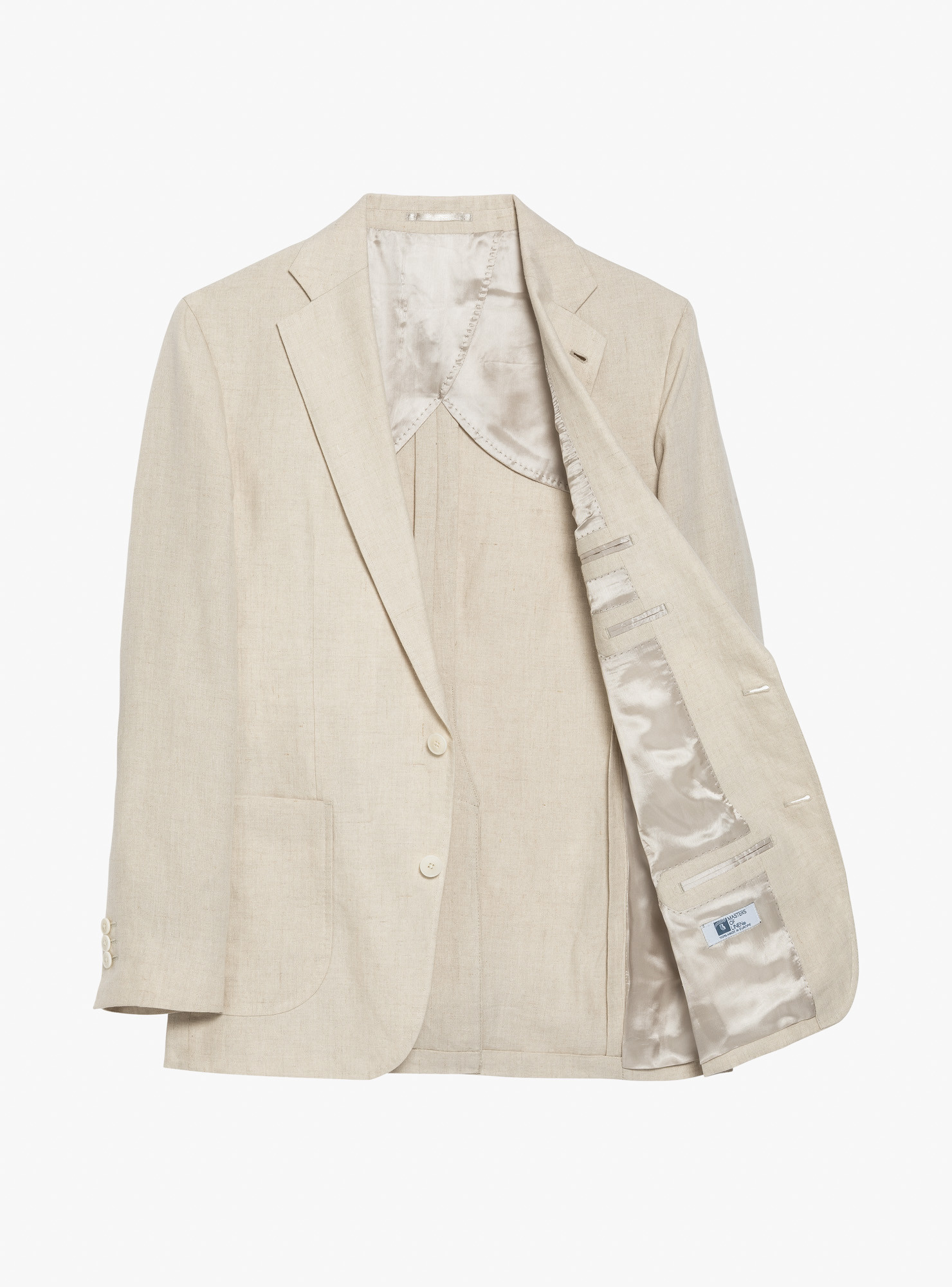 Costume droit 2 boutons en lin crème. Montage non construit, épaules sans épaulettes, poche poitrine plaquée droite,poches latérales plaquées droites, une fente dos, doublure intérieure semi doublée. Pantalon avec passants de ceinture, deux pinces extérieures, bas sans revers.