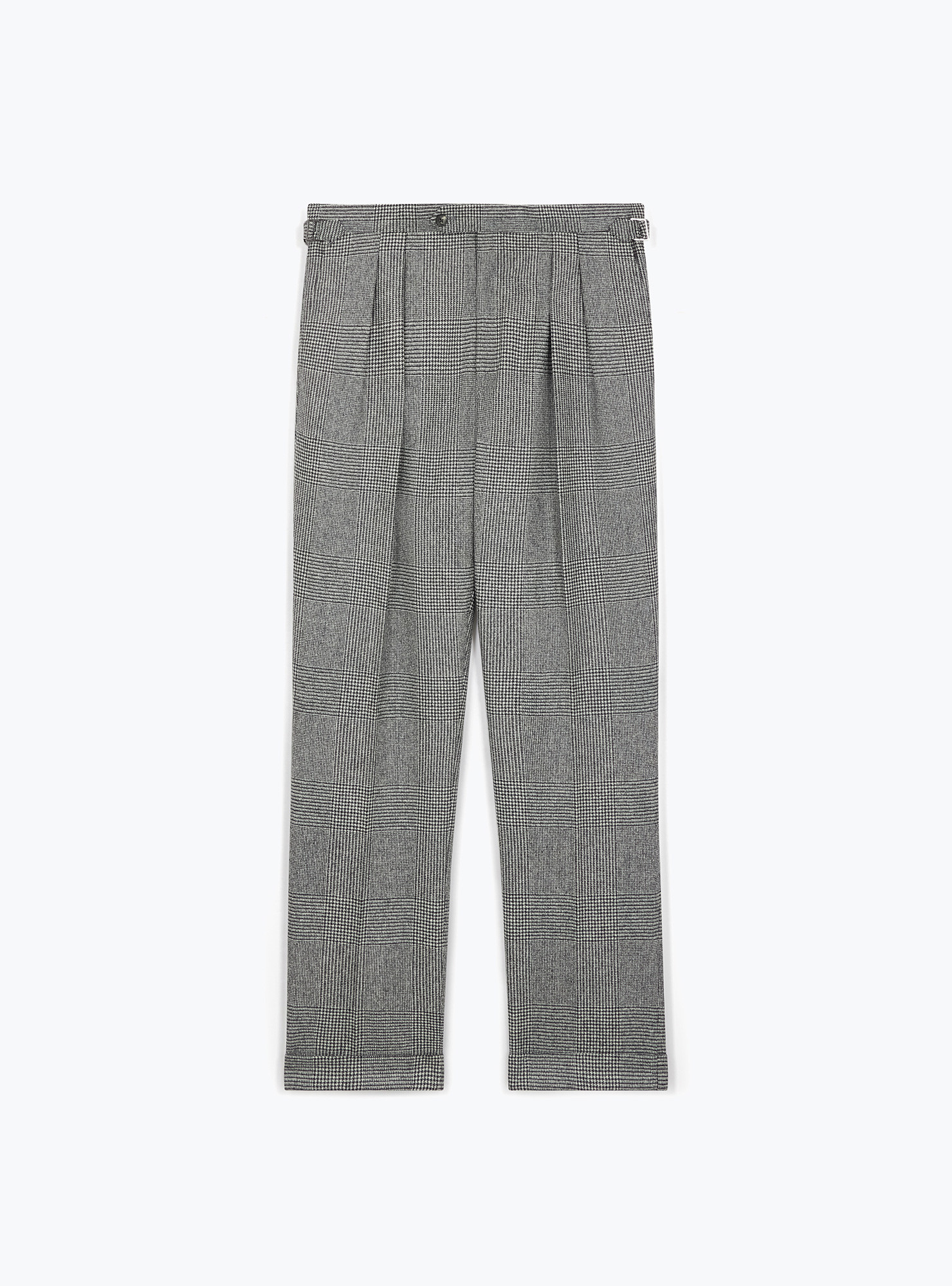 Costume croisé 6 boutons à motif Prince de Galles Gris en flanelle de laine de chez Drapers. Montage Traditionnel, épaules avec épaulettes structurées, poches latérales à rabats, 2 fentes dos et doublure intérieure complète. Pantalon à pattes de serrages, 2 pinces intérieures, revers de 4cm en bas de jambe.
