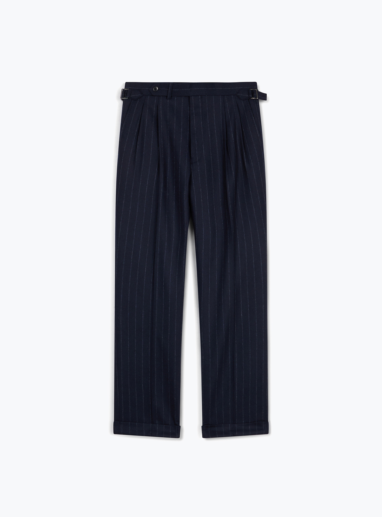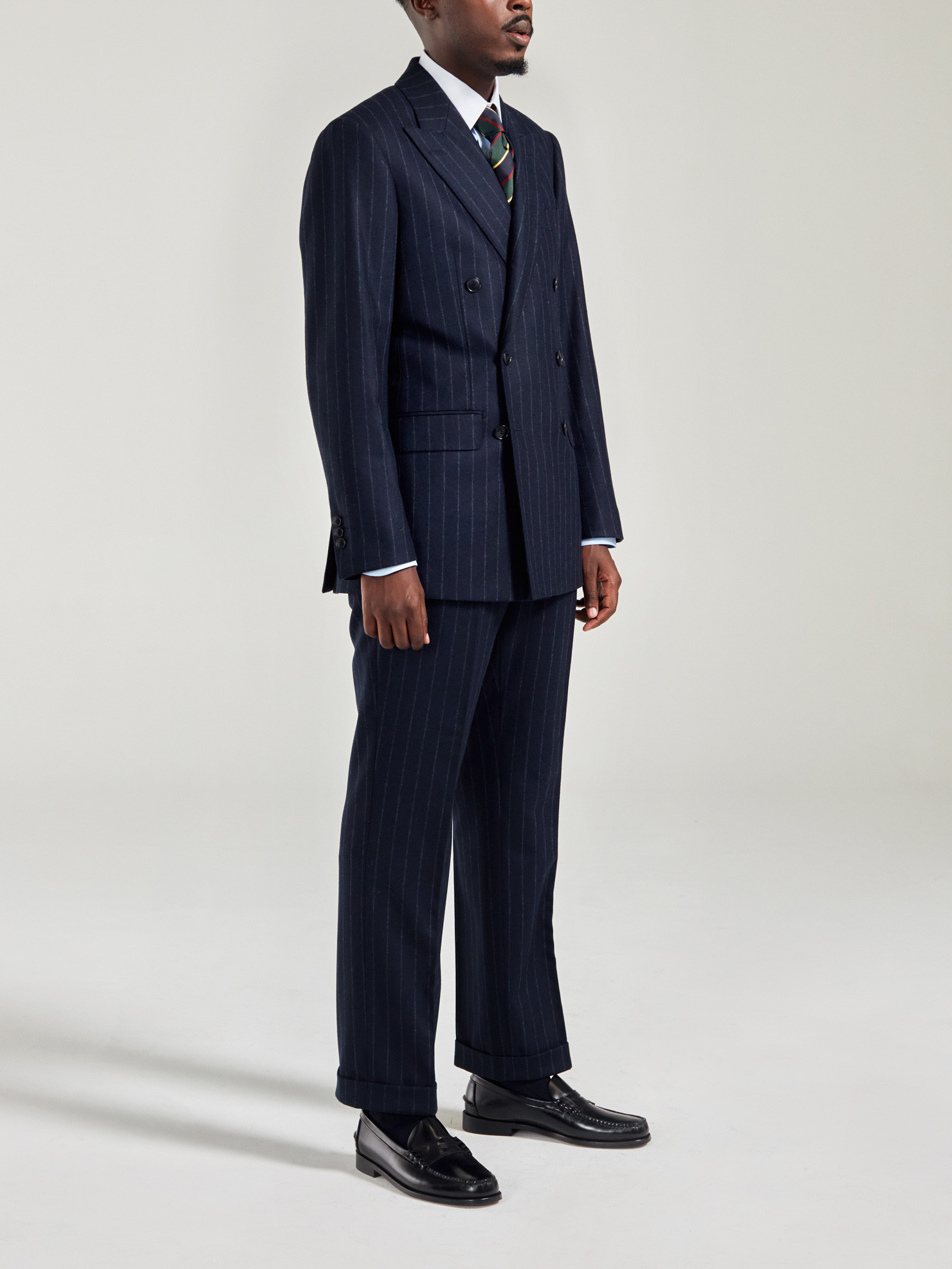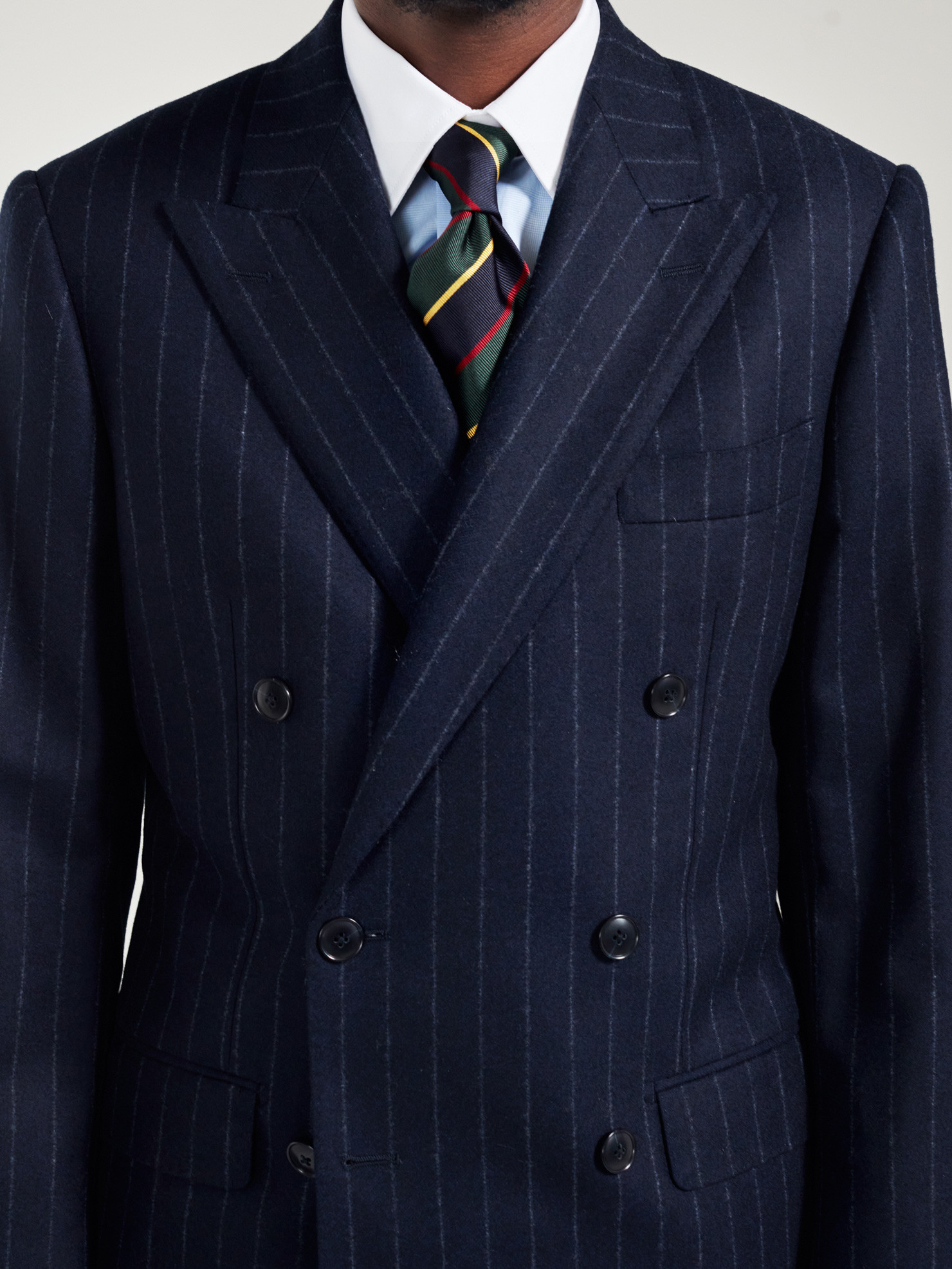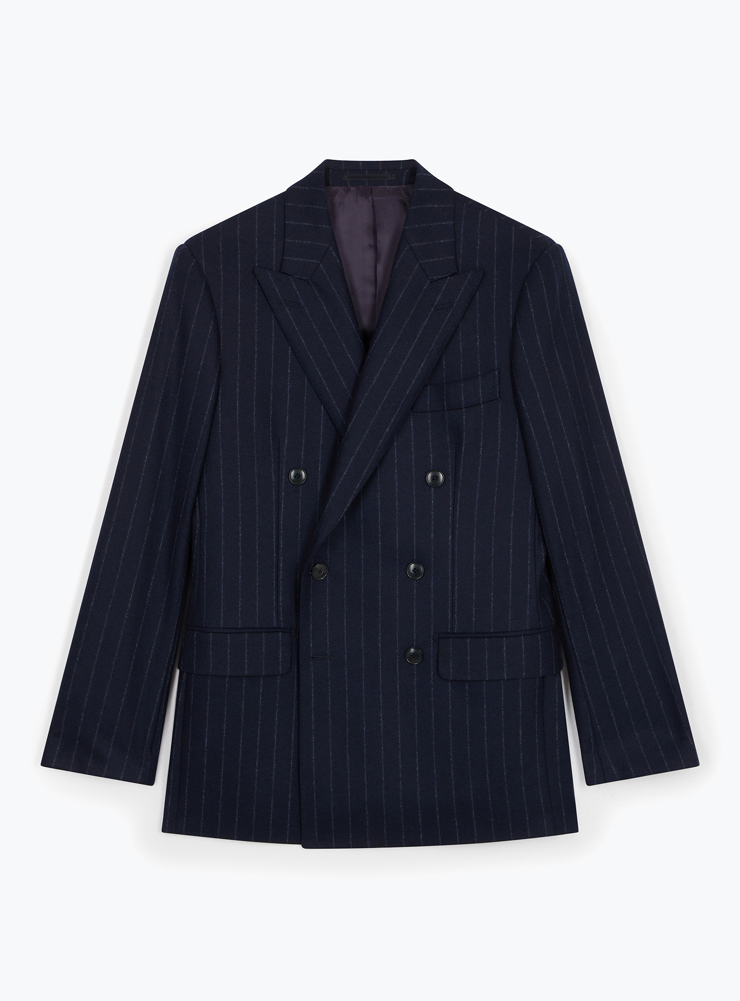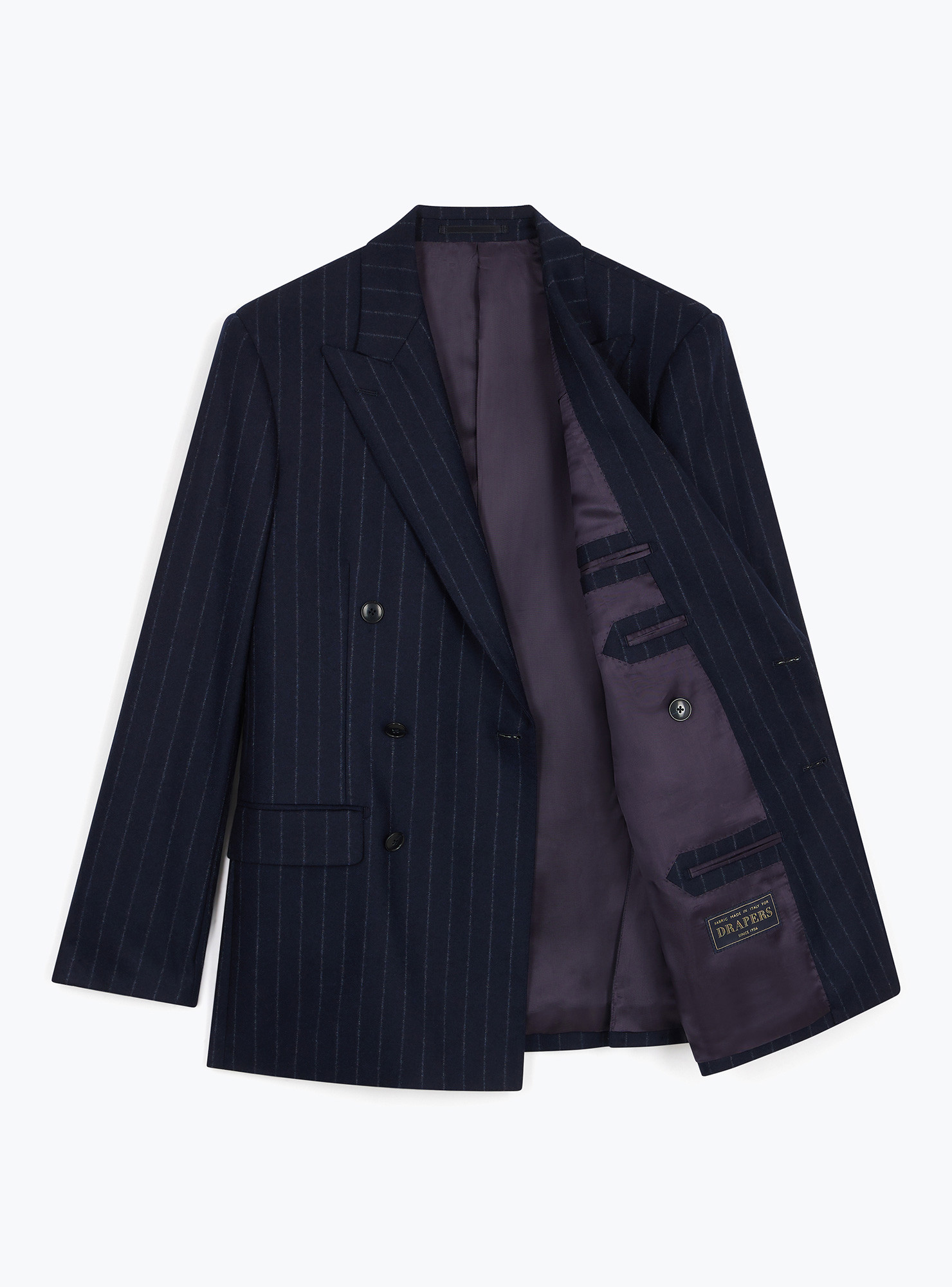 Costume croisé 6 boutons à motif Rayure Craie bleu marine en flanelle de laine de chez Drapers. Montage Traditionnel, épaules avec épaulettes structurées, poches latérales à rabats droits, 2 fentes dos et doublure intérieure complète. Pantalon à pattes de serrages, boutonnage decalé, 2 pinces extérieures, revers de 4cm en bas de jambe.