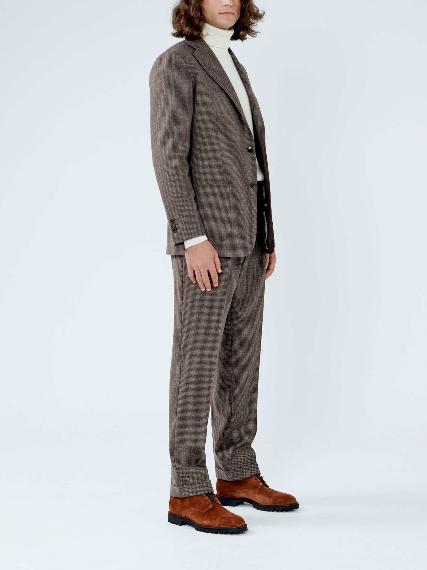 Costume Flanelle Pied de Poule Marron - Veste droite deux boutons, revers classique cran parisien, épaules souples padding léger, poche poitrine droite plaquée, deux poches droites plaquées, une fente dos - Pantalon classique avec deux pinces intérieures, passants ceintures, poches latérales obliques, une poches droite à l'arrière, bas revers 4 cm.