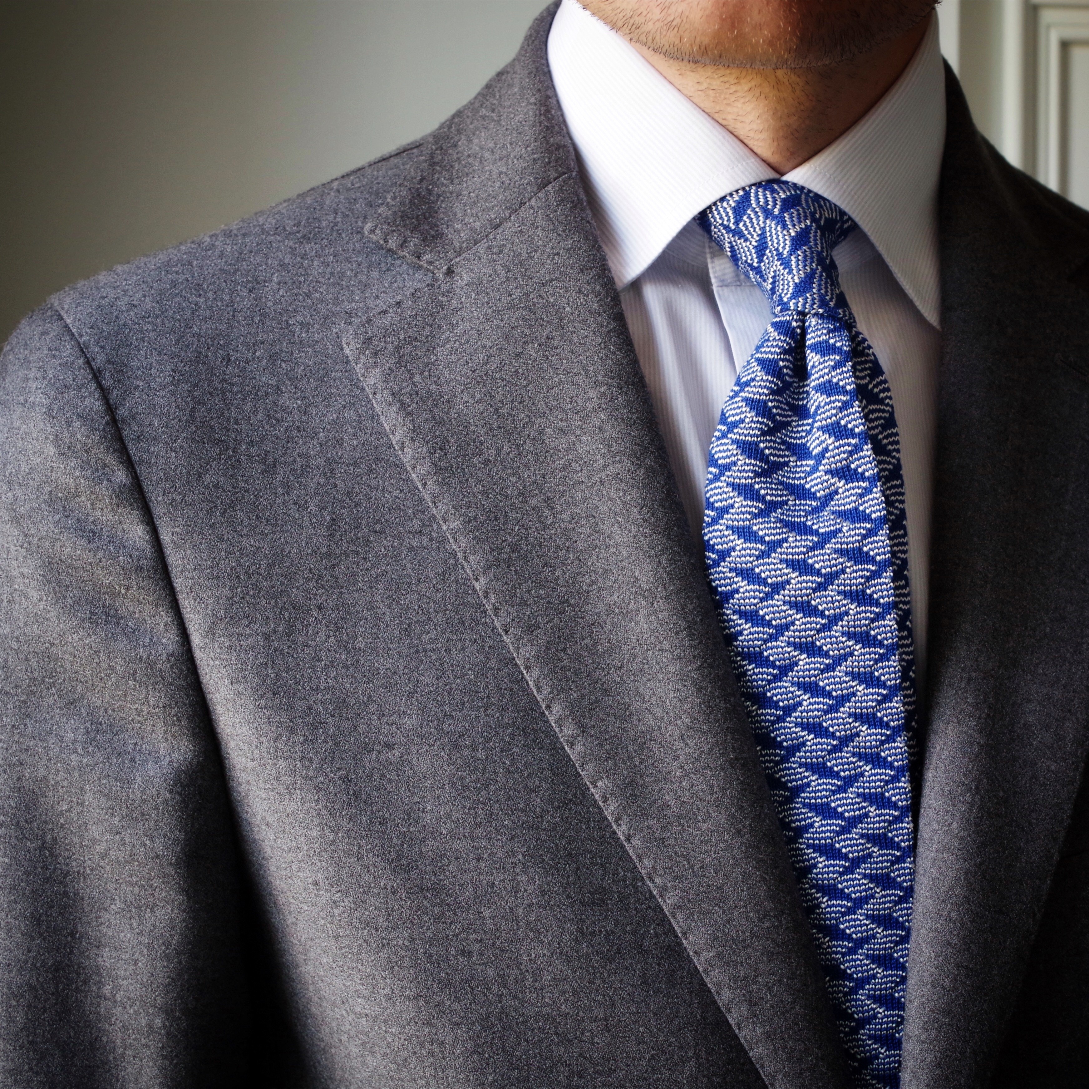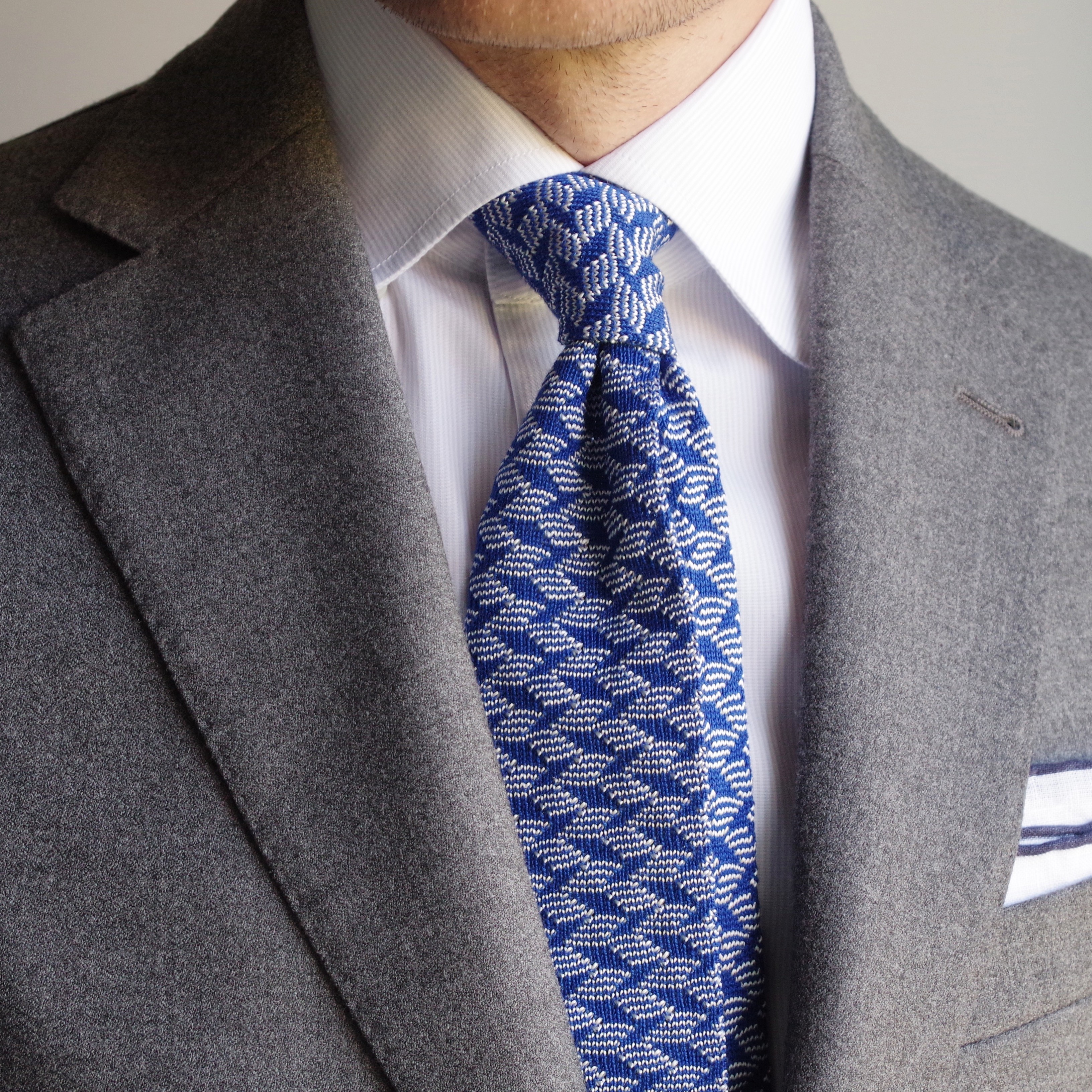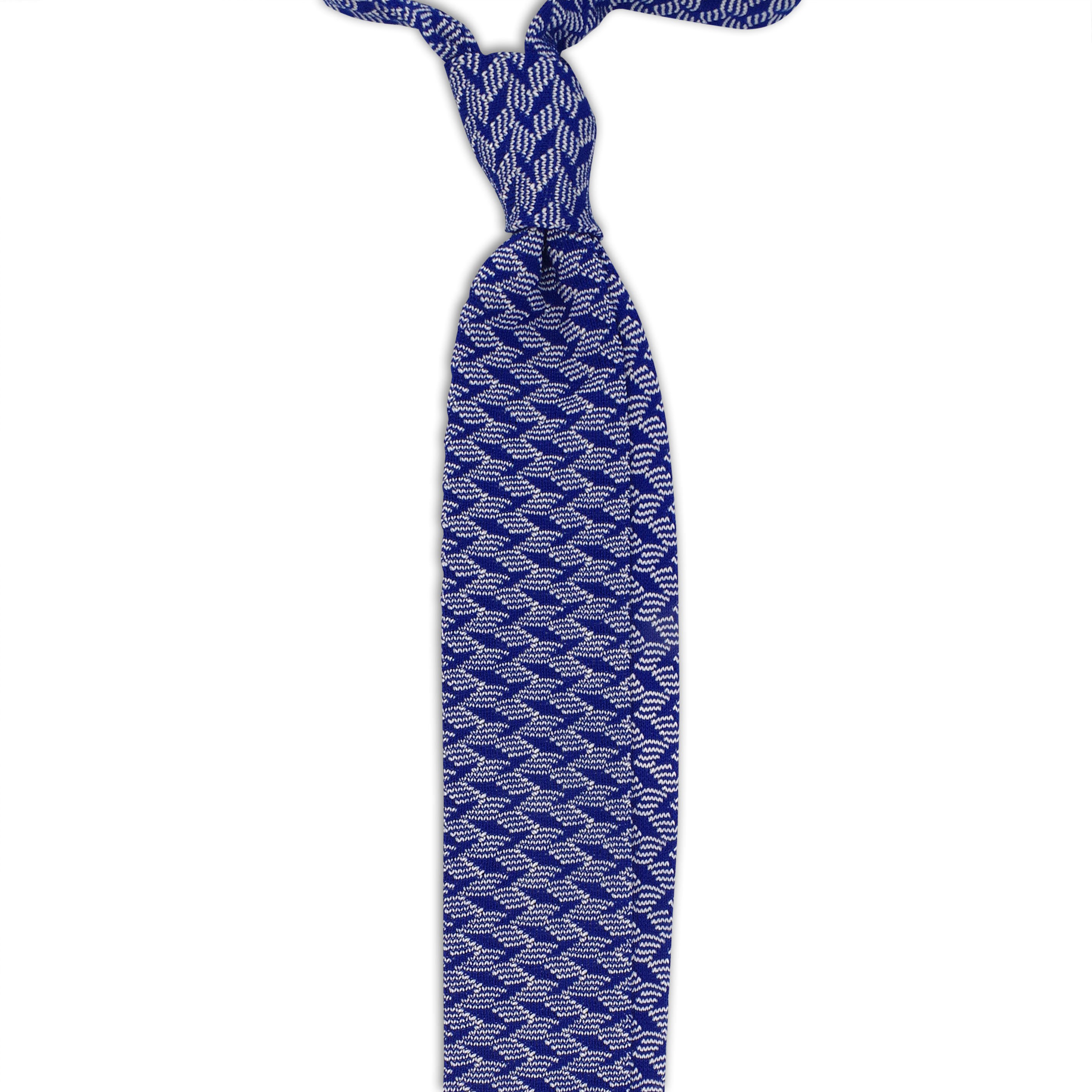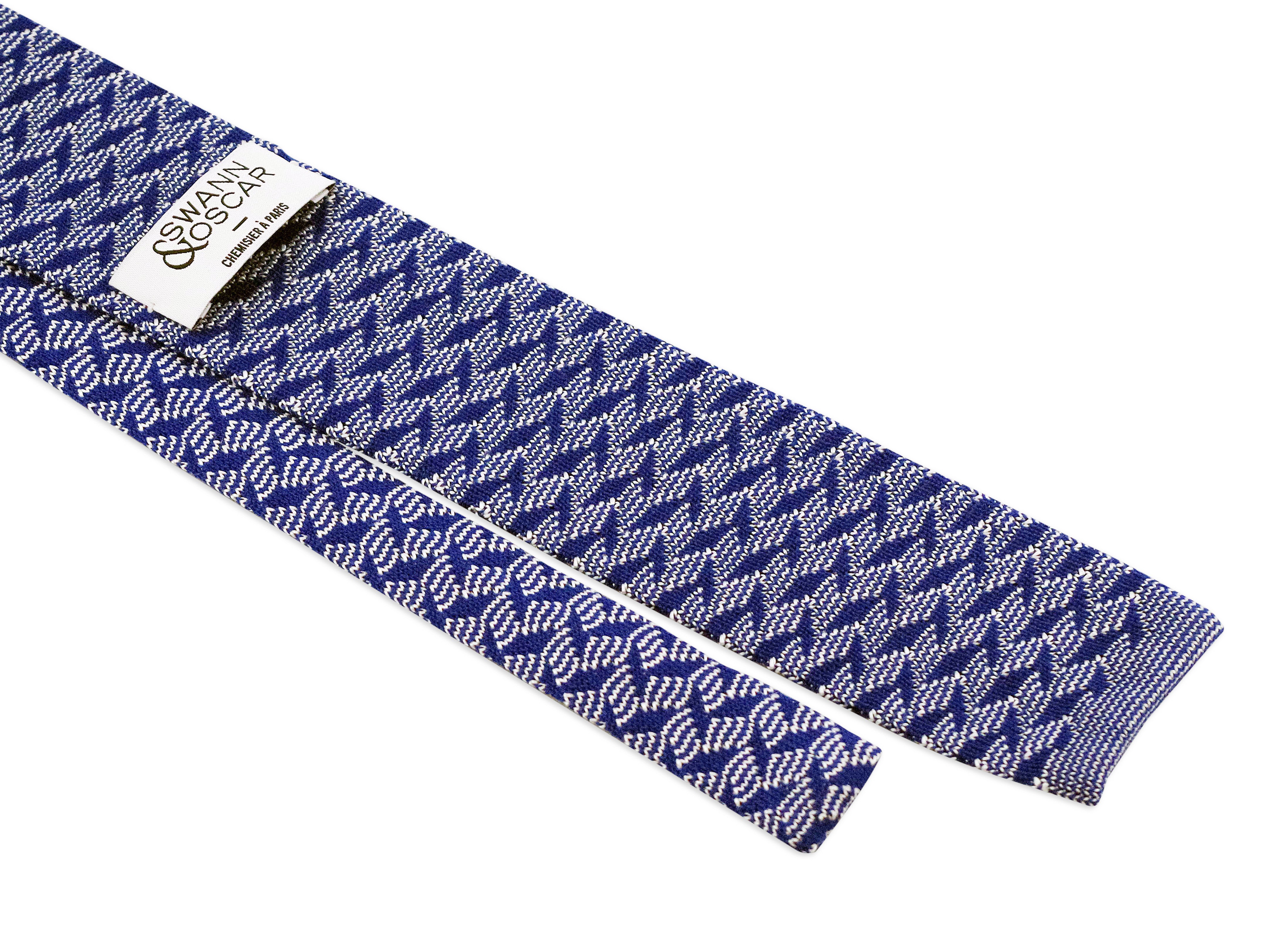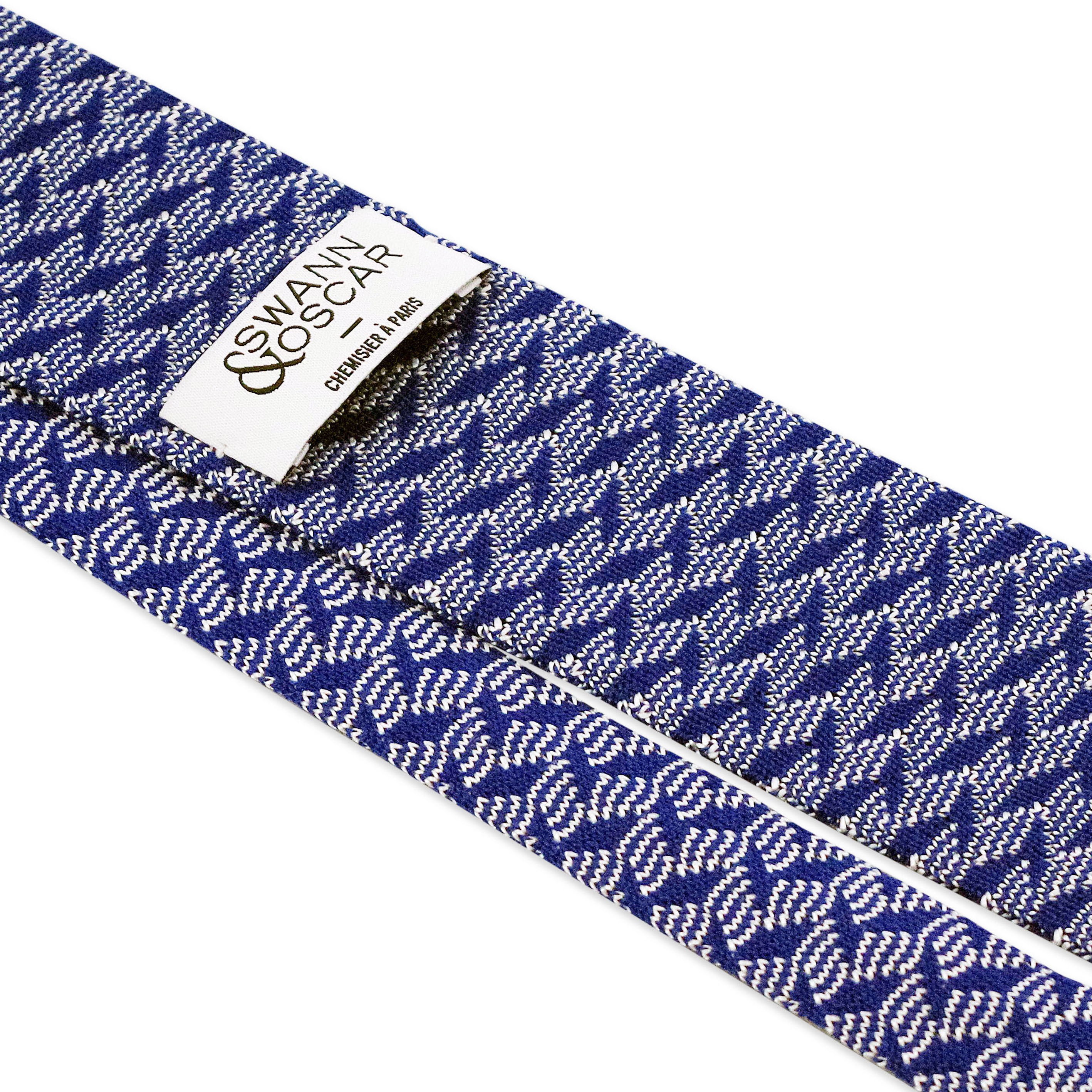 Cette cravate est un tricot à motif très typé sportswear chic, elle pourra se porter lors de vos after work en toute décontraction. Cependant, contrairement au modèle vert déjà présenté et en vente sur notre site, le bleu apporte un côté plus classique et habillé. Cette fois, il faudra l’imaginer sur une chemise blanche, avec un costume gris et une simple pochette blanche avec liseret bleu.