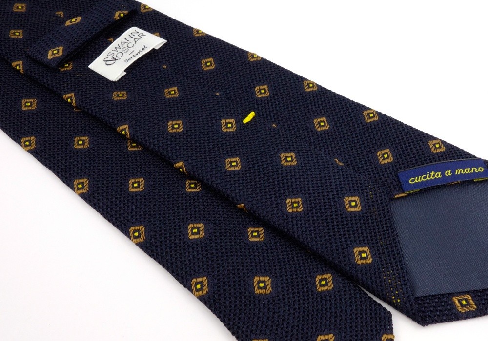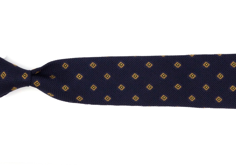 Le jacquard est une technique de tissage pour broder un motif. Un peu vintage, mais pas pour autant vieux-jeu ! Ce motif apporte de la couleur à une cravate au fond basique comme la grenadine de soie bleu marine.