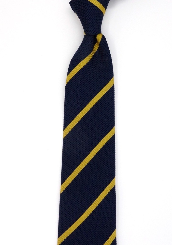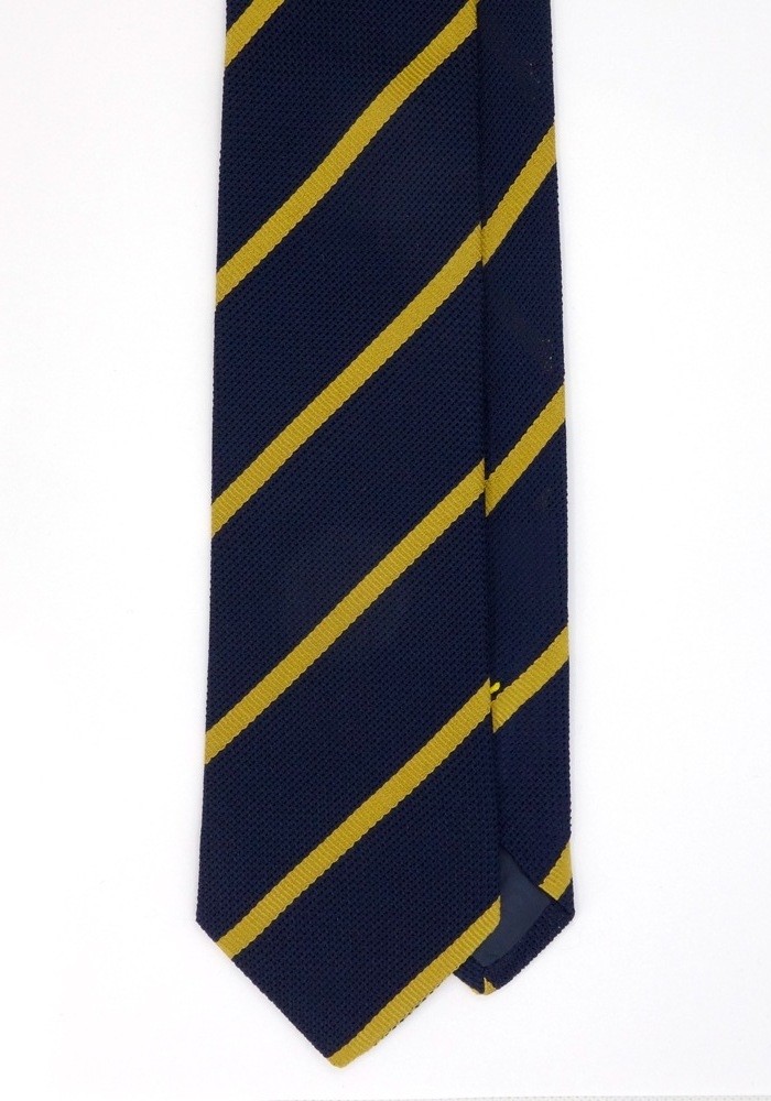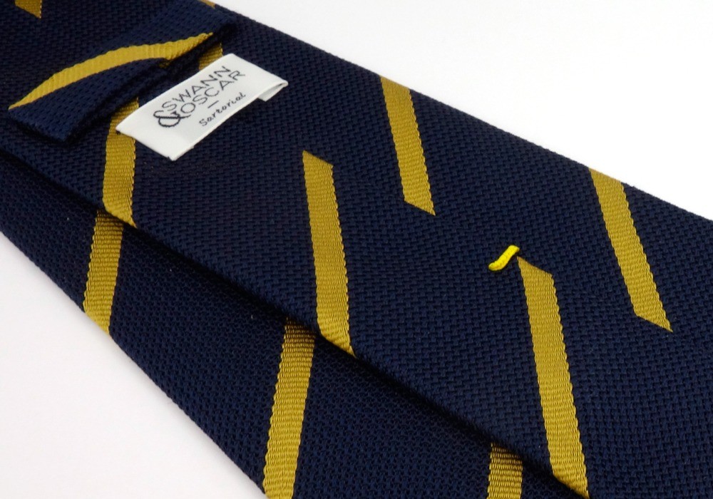 Cette cravate est un clin d'œil au style preppy. Sa texture est très surprenante : un mélange d'un fond bleu natté type grenadine à une rayures jaune doré tissée comme un motif jacquard.C'est une cravate à porter avec des pièces fortes, mais basiques : un blazer bleu, un cardigan d'été, des mocassins...