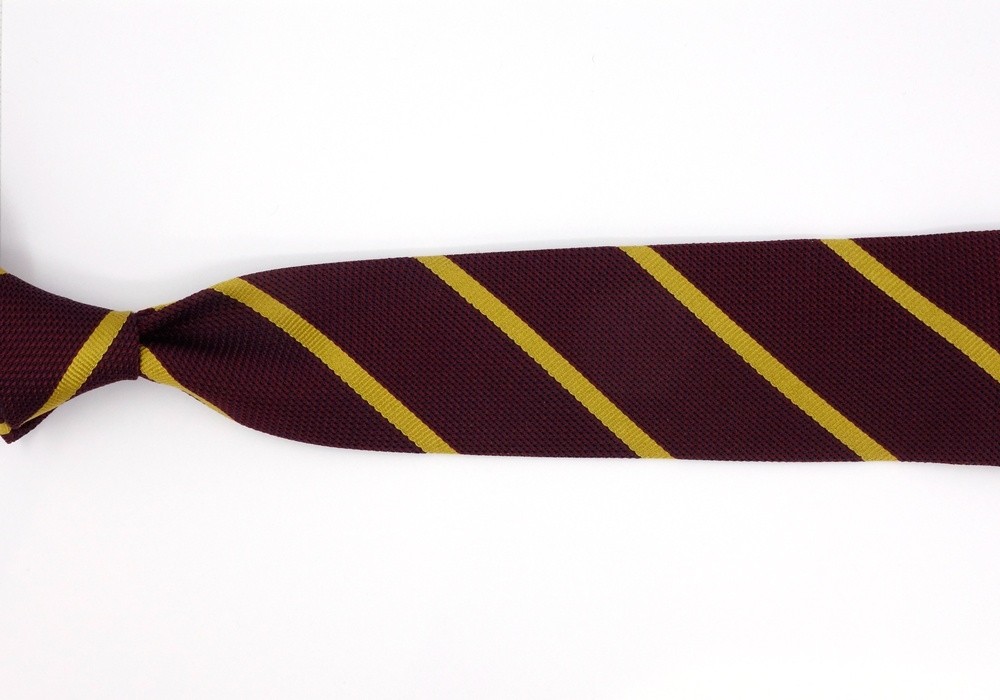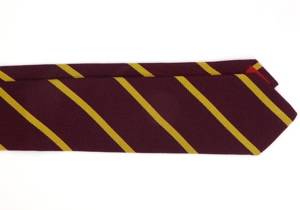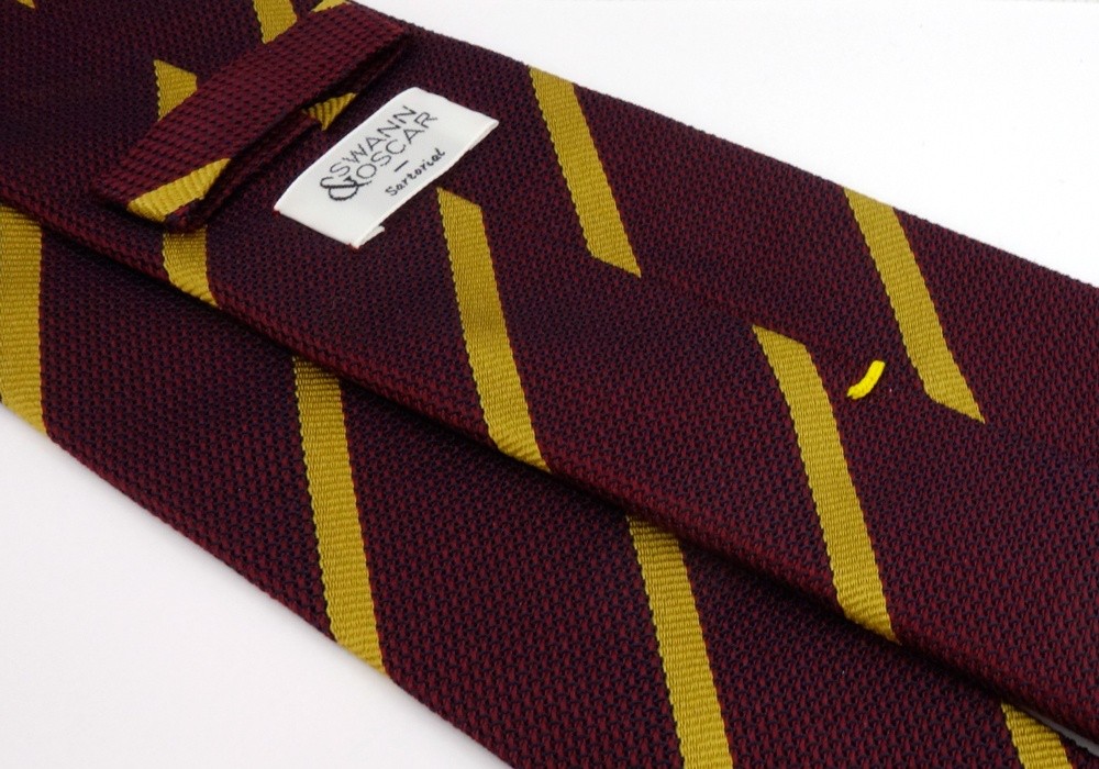 Cette cravate est un clin d'œil au style preppy. Sa texture est très surprenante : un mélange d'un fond bordeaux foncé natté type grenadine à une rayures jaune doré tissée comme un motif jacquard.C'est une cravate à porter avec des pièces fortes, mais basiques : un blazer, un cardigan d'été, des mocassins...