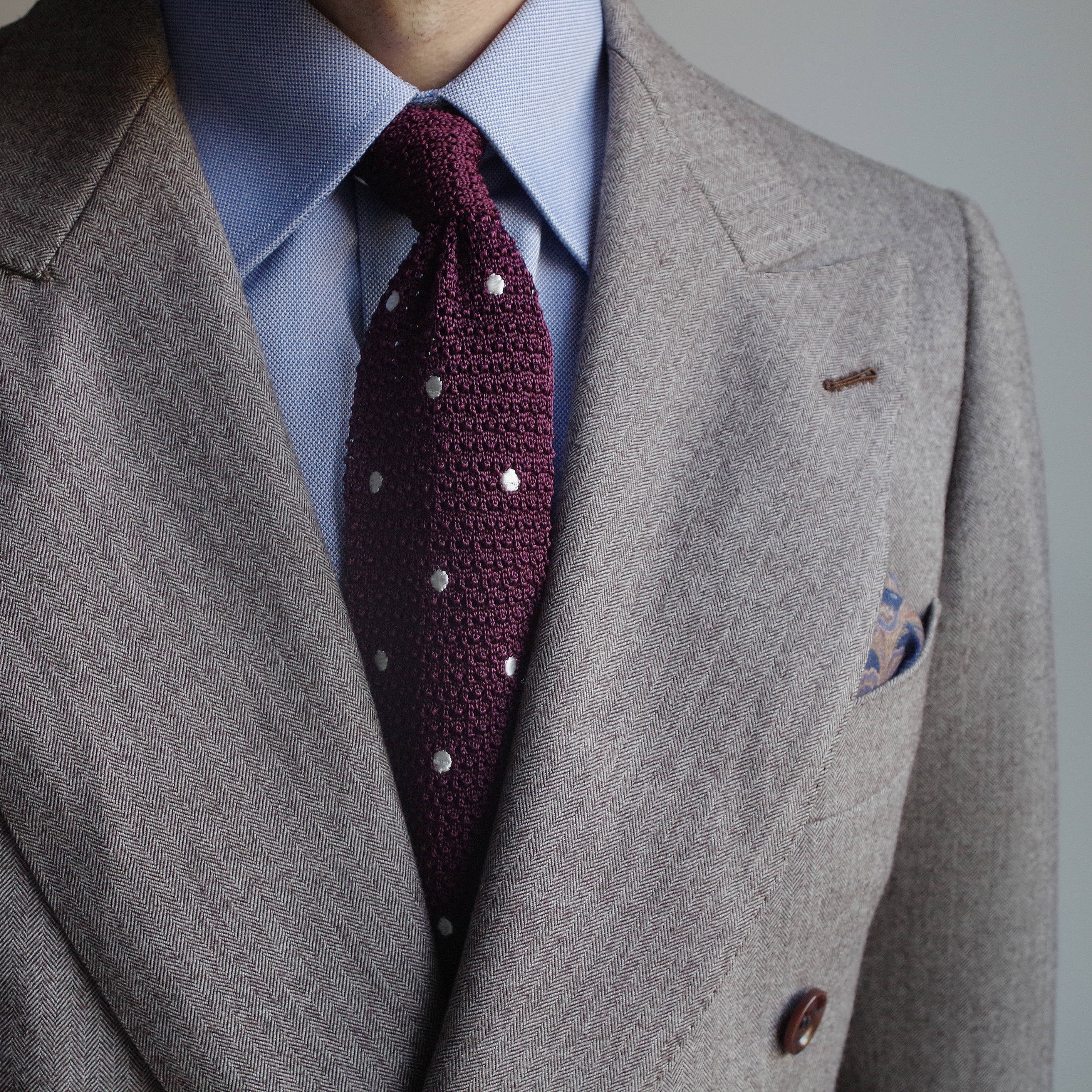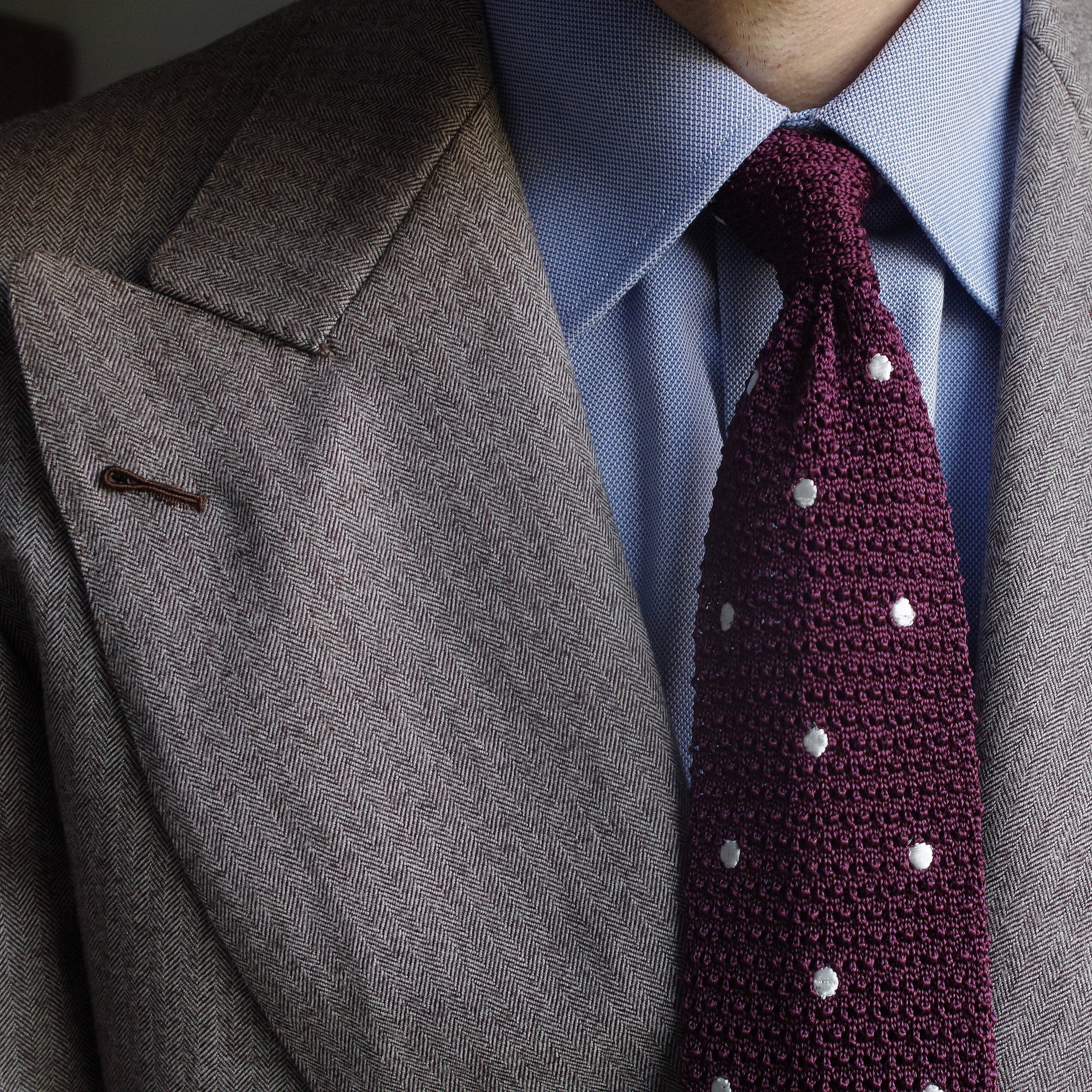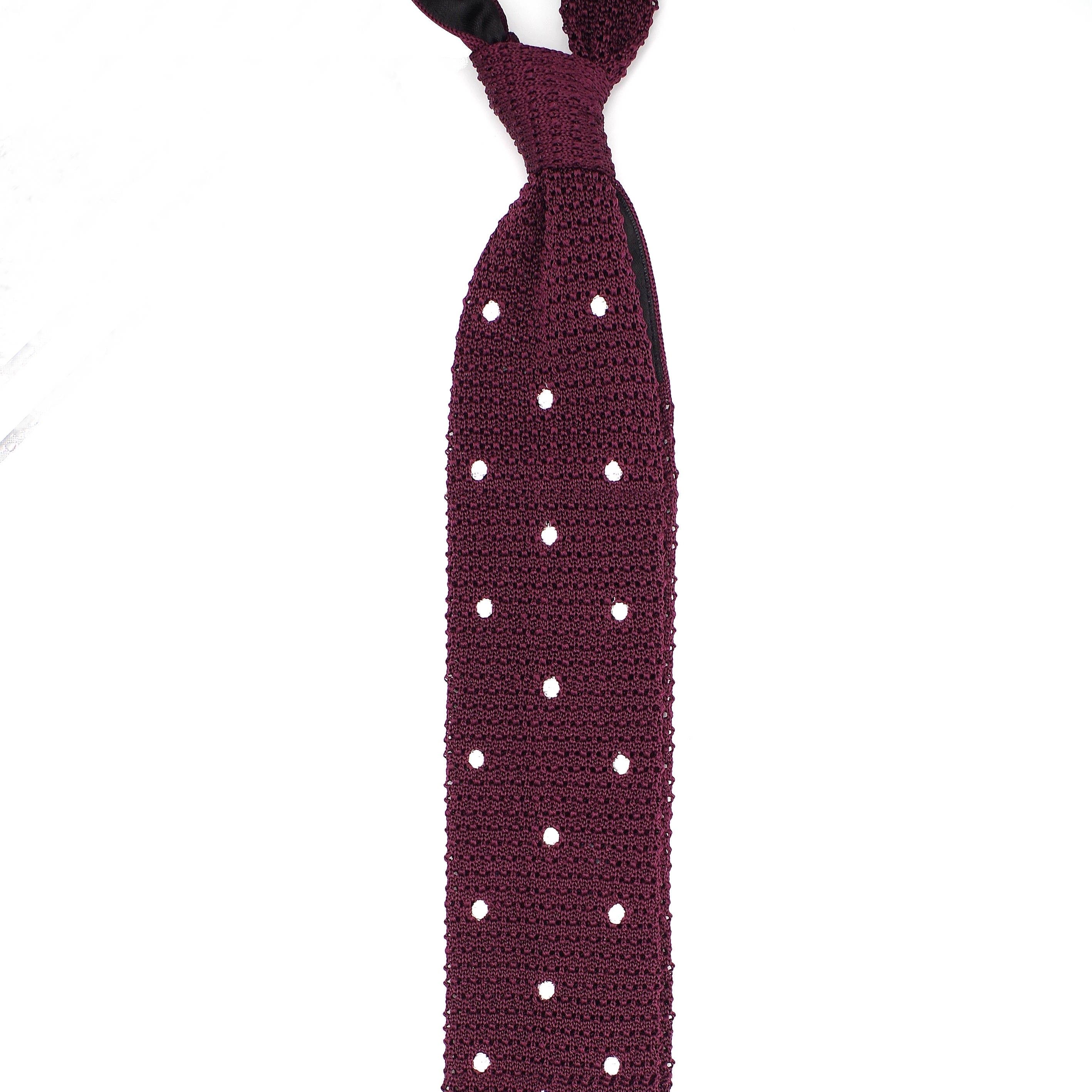 Une très belle pièce, incontournable, cette grenadine de soie bordeaux avec des points blancs, est très intéressante. Elle fonctionne très bien avec un costume marron clair ou gris, une chemise bleu clair ou blanche et une pochette blanc à points bordeaux.