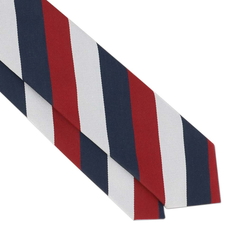 Cravate club blanc, bleu et rouge. Très élégante, inspirée des cravates "regimental" des corps d'armée anglais. Elle est fabriquée à Paris chez une façonnier centenaire.