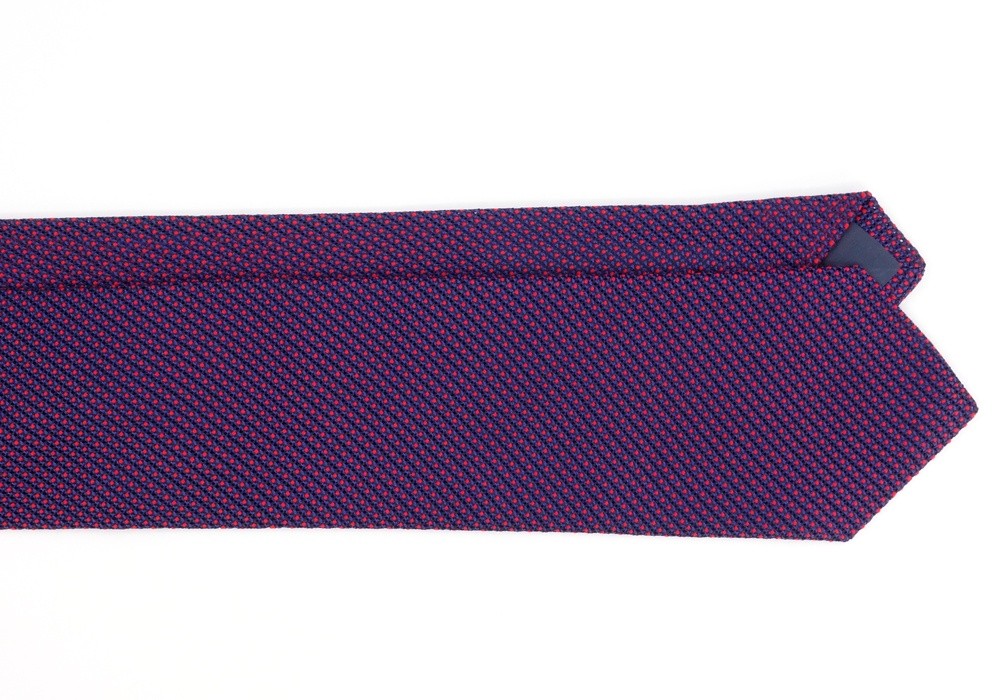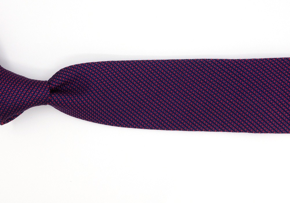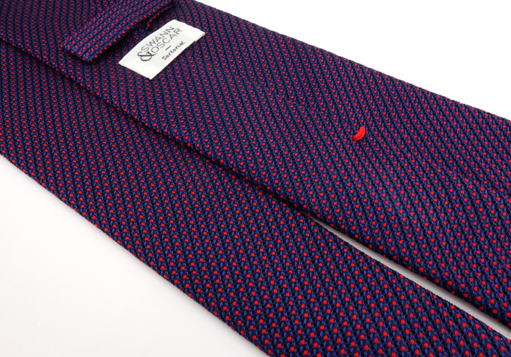 Une cravate faux-uni, c'est de loin une simple cravate bleue… qui se révèle lorsque l'on y prête plus d'attention. Son maillage très aéré de la grenadine de soie révèle texture et une couleur complémentaire qui s'accorde à la perfection : le rouge et bleu, c'est la base des associations de couleur.