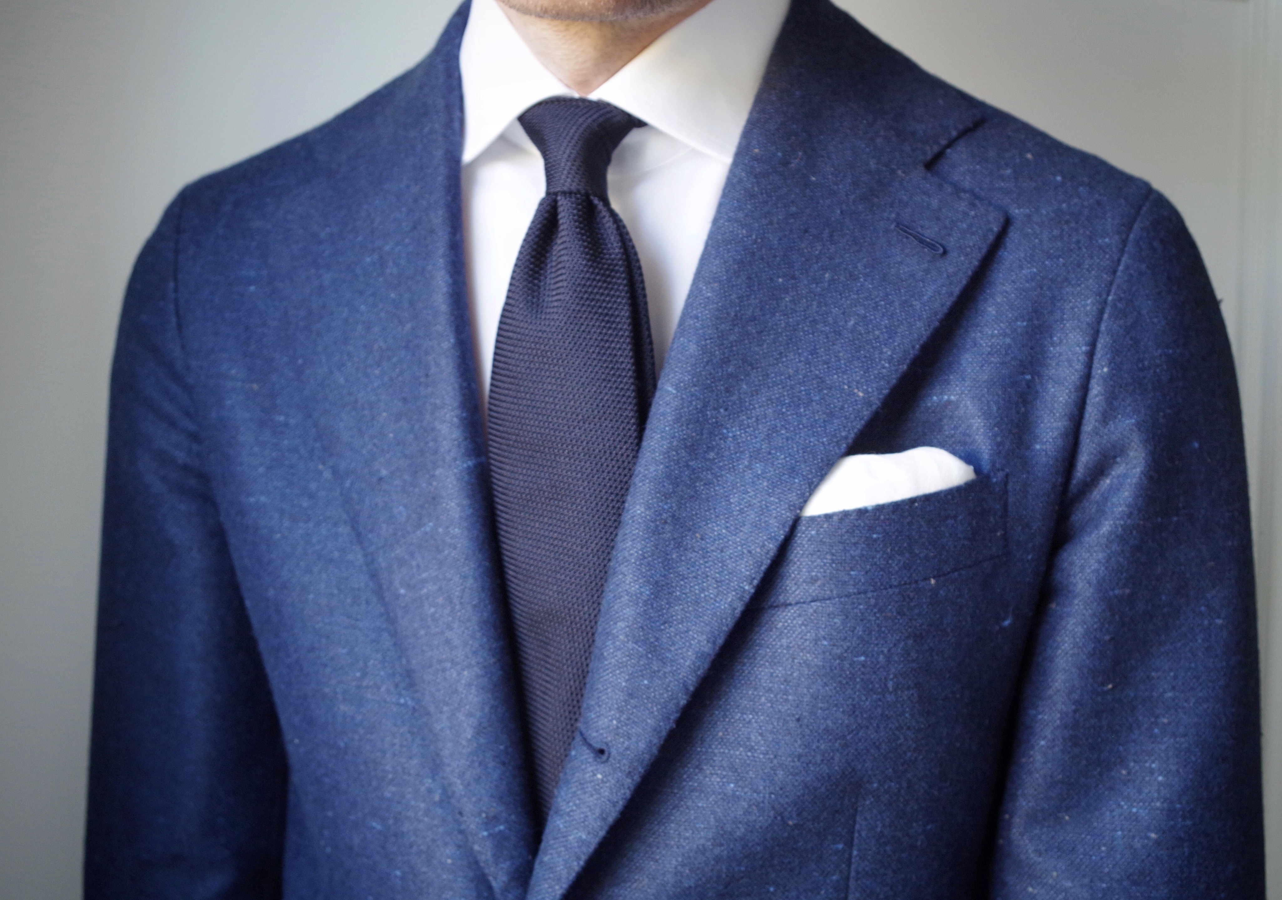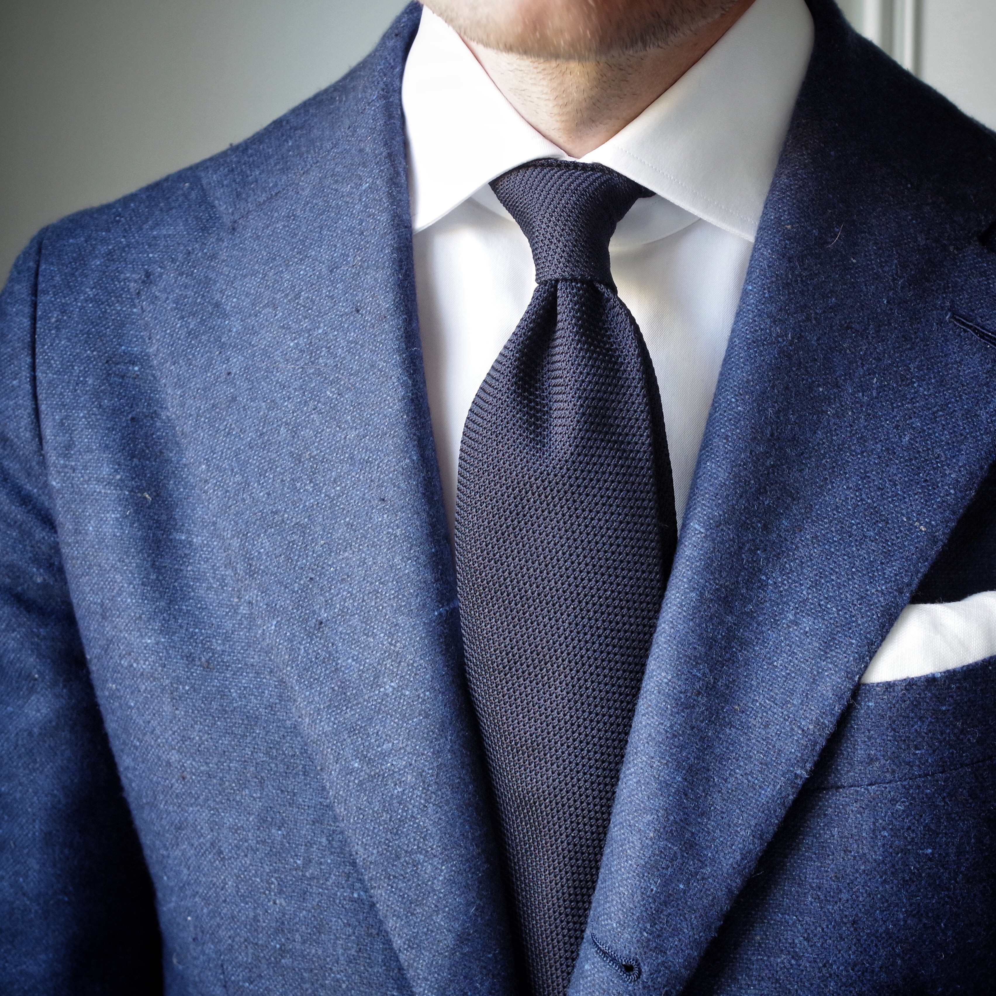 La grenadine de soie finement tissée est un choix sûr et idéal pour vos tenues professionnelles. Fonctionne le mieux avec des chemises blanches, des costumes gris de toutes nuances ou costumes marine. Ajoutez un simple carré de pochette en lin blanc, et le tour est joué. D’autant que la construction en 7 plis déstructurés, apporte une souplesse et un confort indescriptible à cette cravate. Les cravates en grenadine font parties de nos préférées.