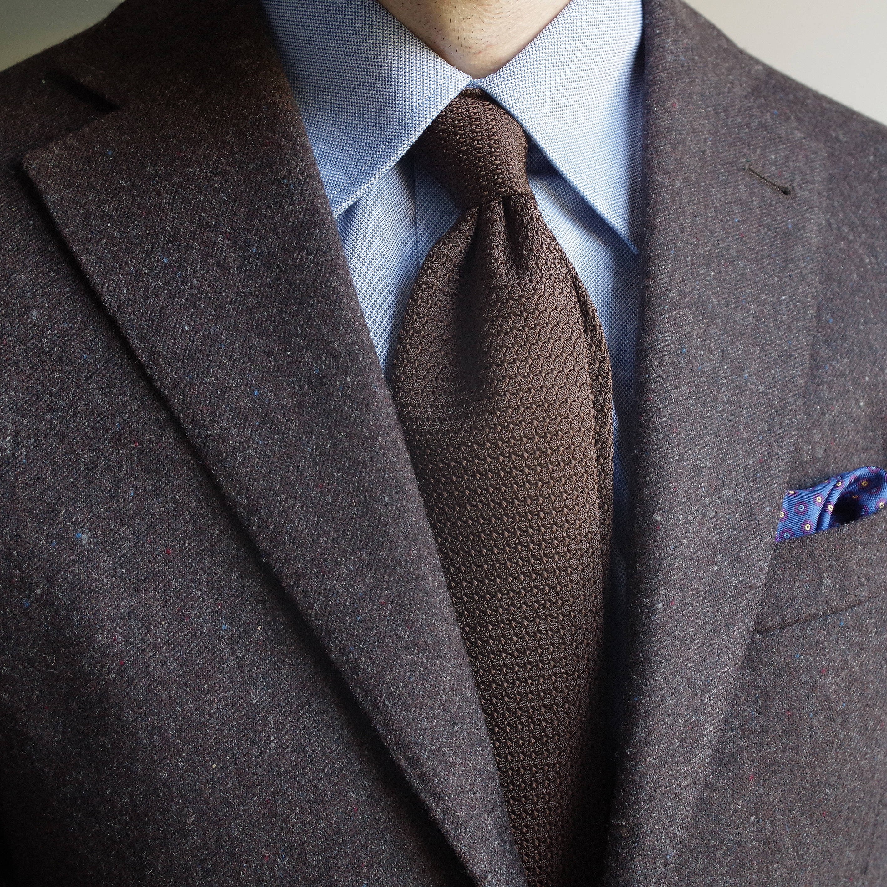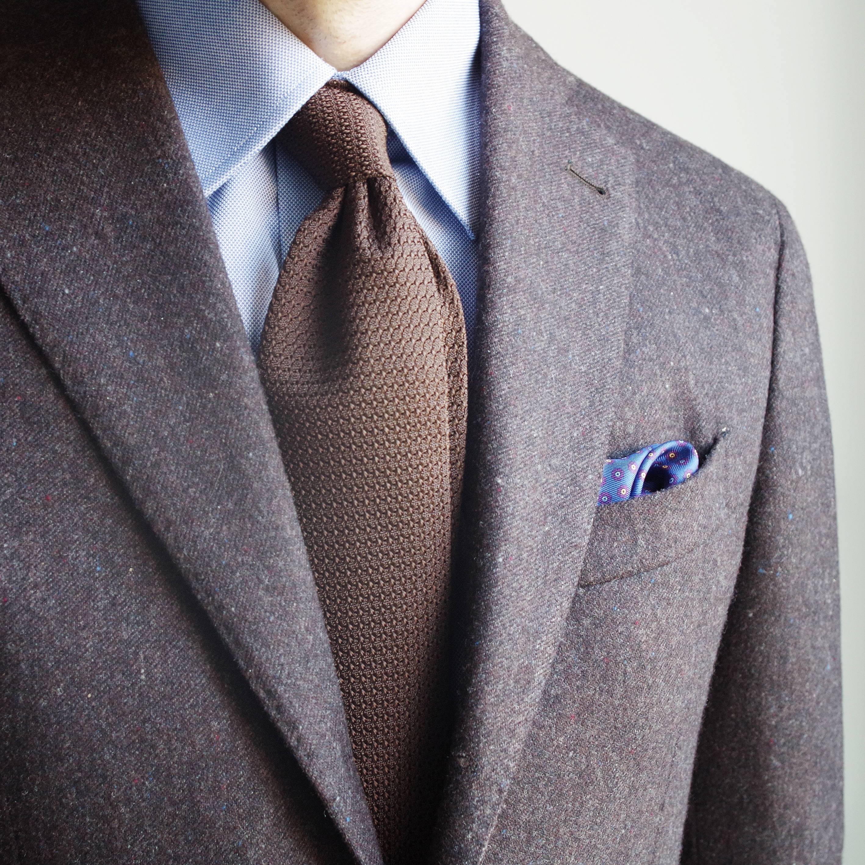 La grenadine marron s'habille dans un tissu dit « Garza Grossa » . Elle fonctionnera aussi bien avec un costume bleu marine, une chemise avec de fines rayures, une pochette blanche à motifs marron, qu’avec une veste de couleur marron, une chemise d’un bleu clair, et la pochette qui pourra rappeler cette tonalité. Une collection qui sera doublée, « foderata ».
