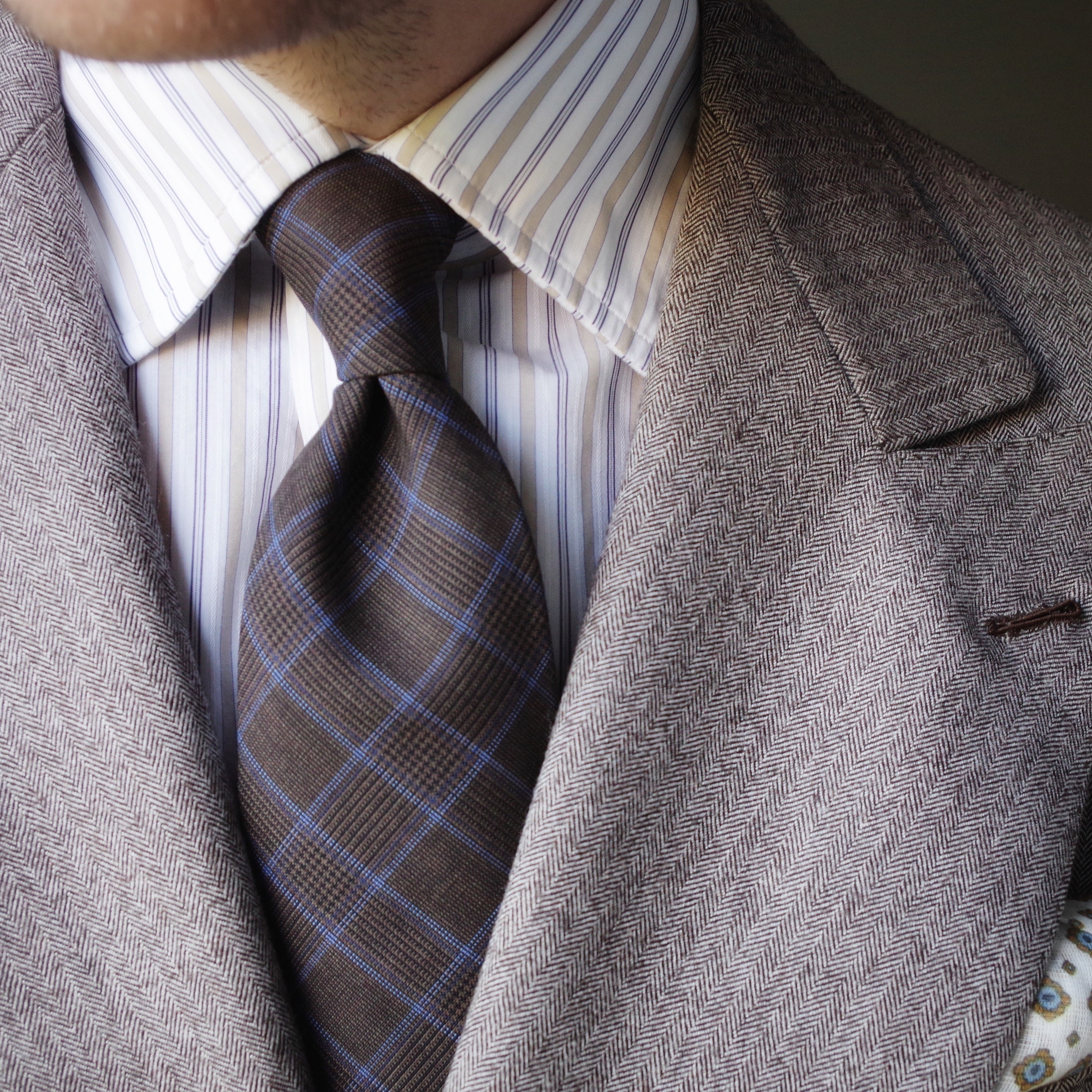 Ce modèle regroupe deux particularités et non des moindres. Le 7 plis « non-foderato con orlo a mano ». Ces deux caractéristiques sauront vous convaincre et les associations seront très faciles à imaginer. D’autant que son tissu en 100% laine, permet facilement de faire un joli nœud simple.