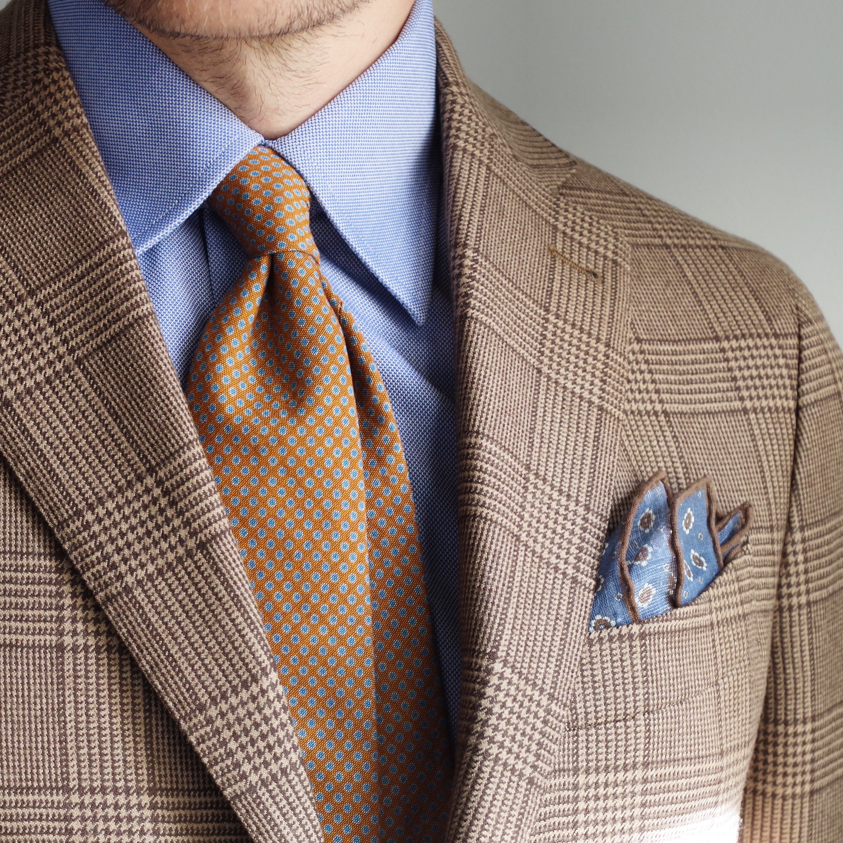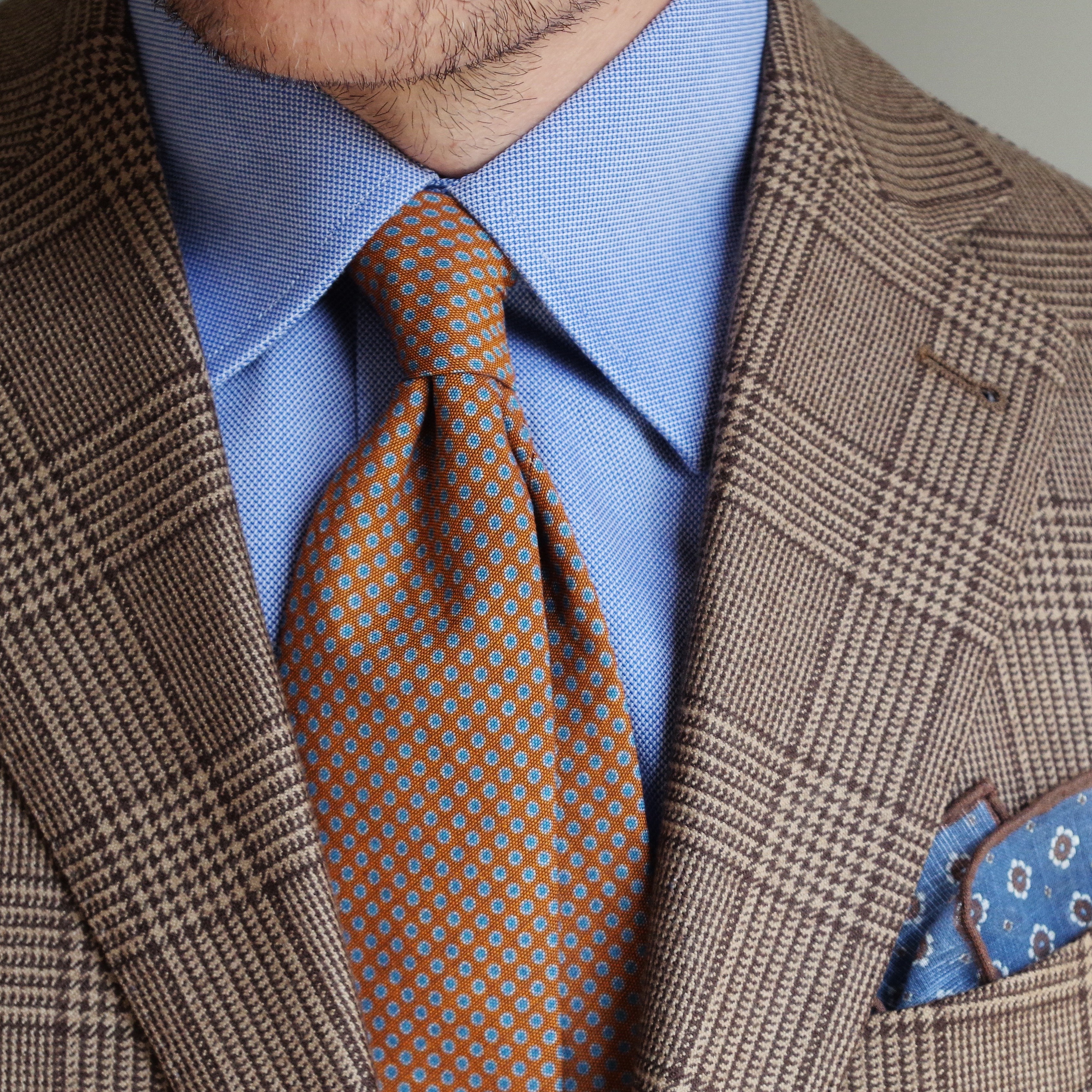 D’autant que cette couleur orangée s’associera parfaitement avec une tenue chic et décontractée. L’association avec une chemise bleue claire au col imposant est évidente. Le col « Positano » que nous proposons sur notre gamme de chemises serait parfait, le petit plus tout de même pour le confort serait de le choisir avec un triplure ultra souple.