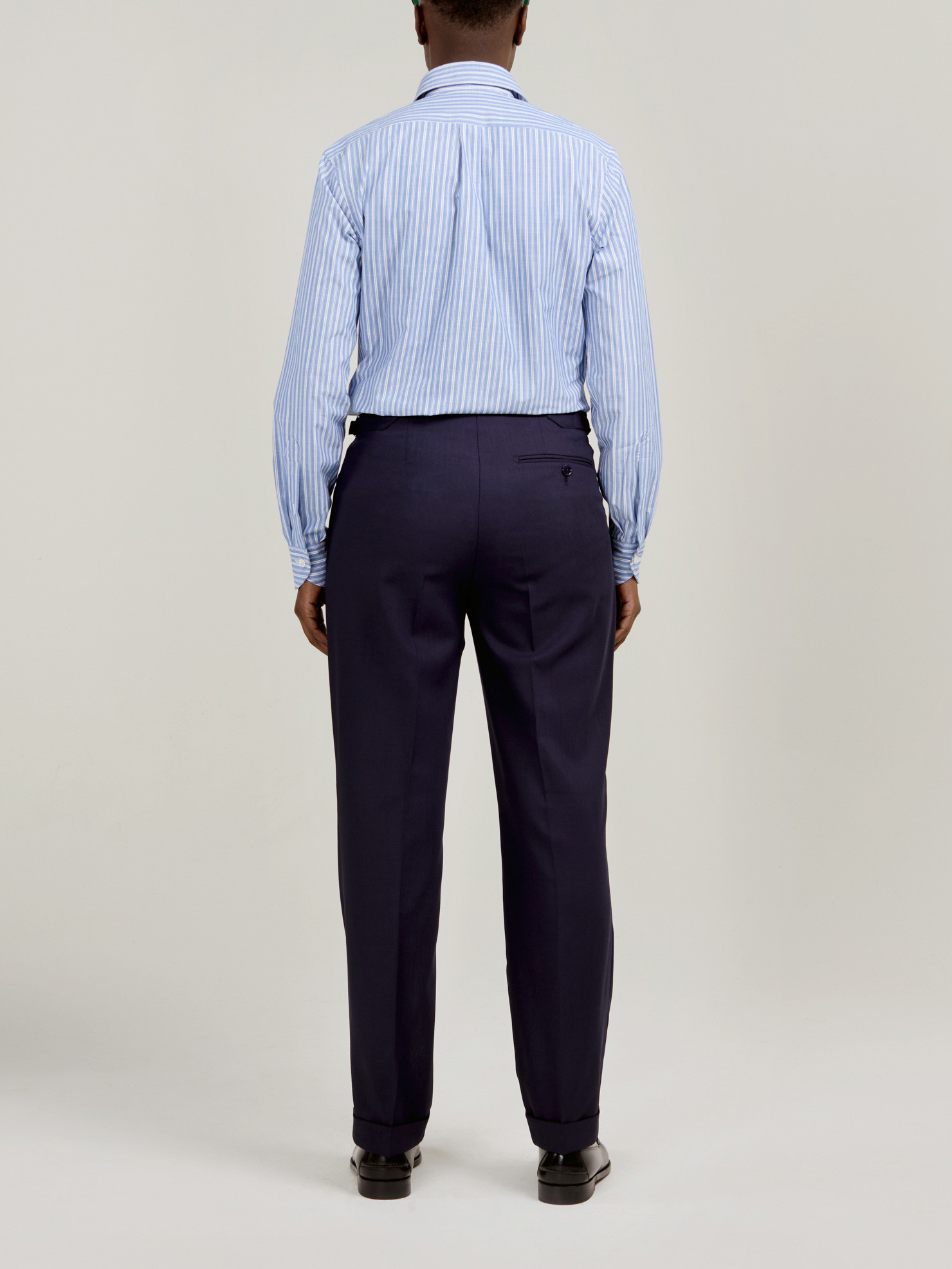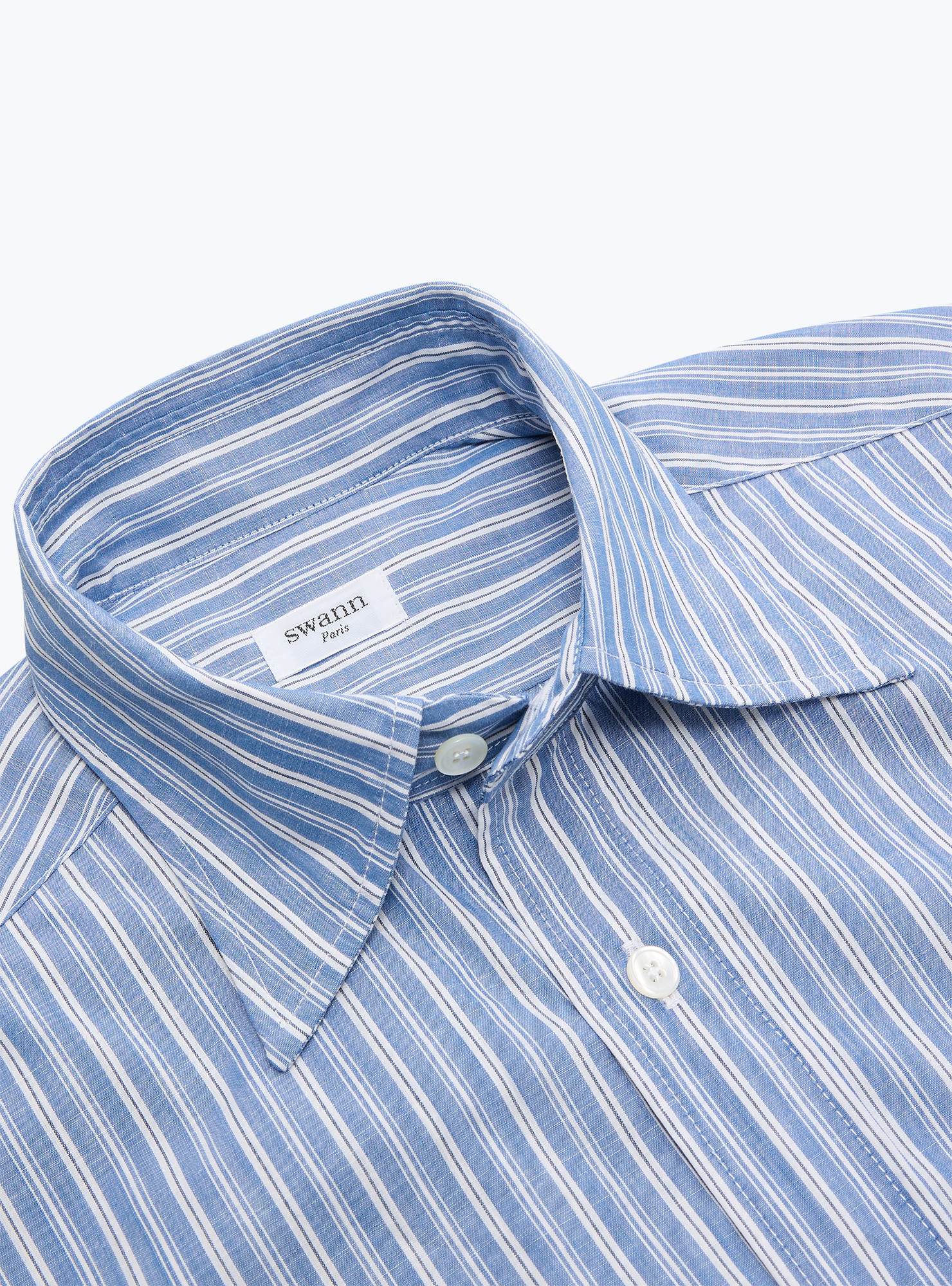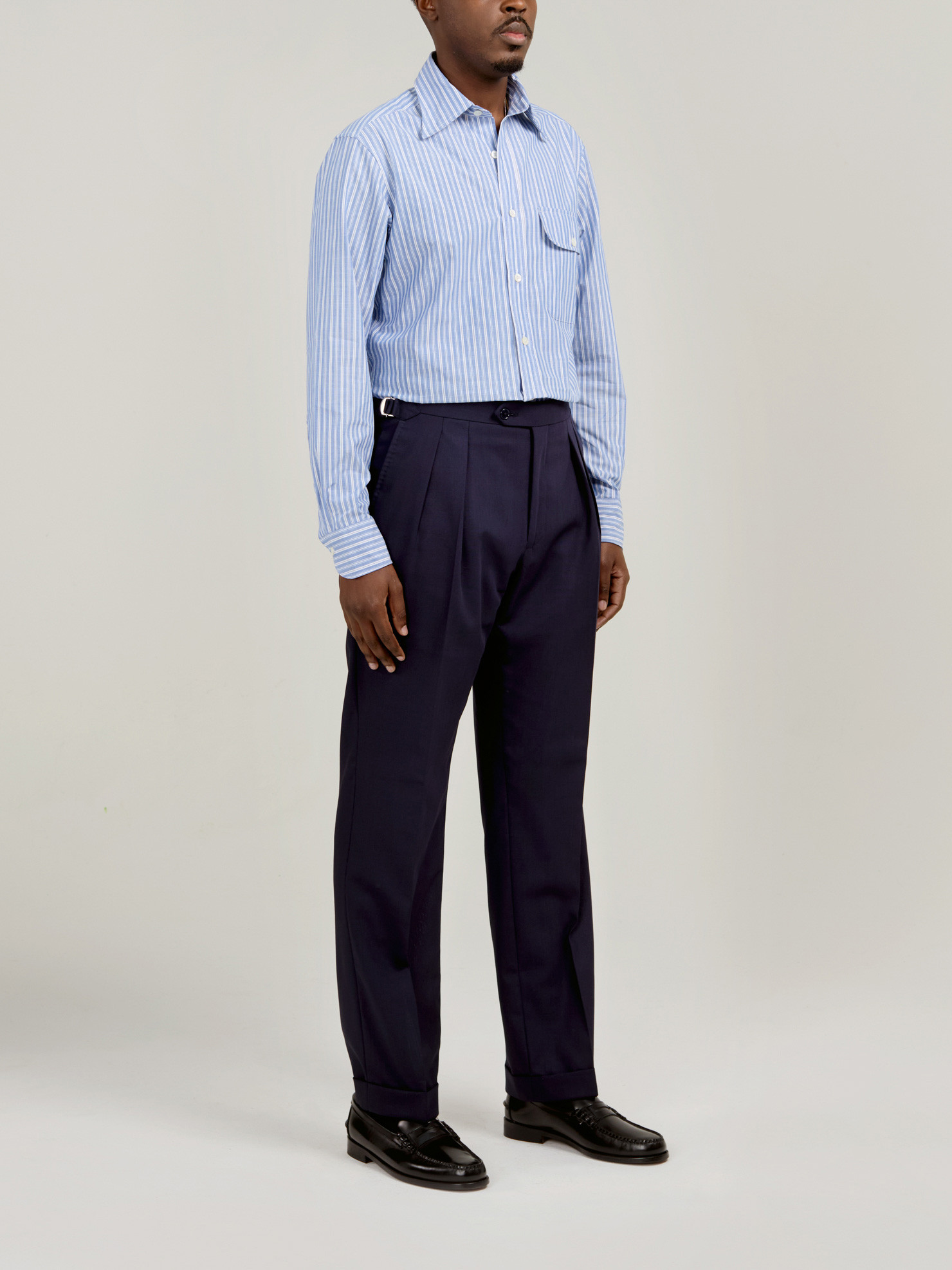 Chambray 140's de chez Thomas Mason rayé bleu, une chemise sport. Ce tissu est tissé avec un fil robuste en trame et un fil très doux en chaine pour apporter confort et raffinement : une construction rare, de très grande qualité.