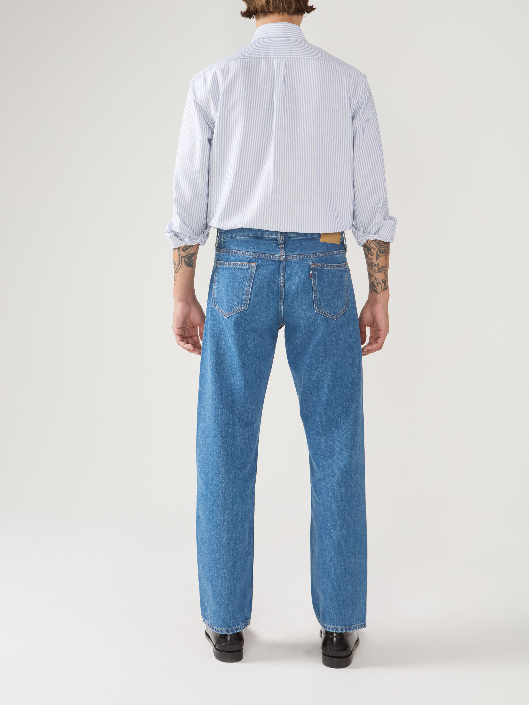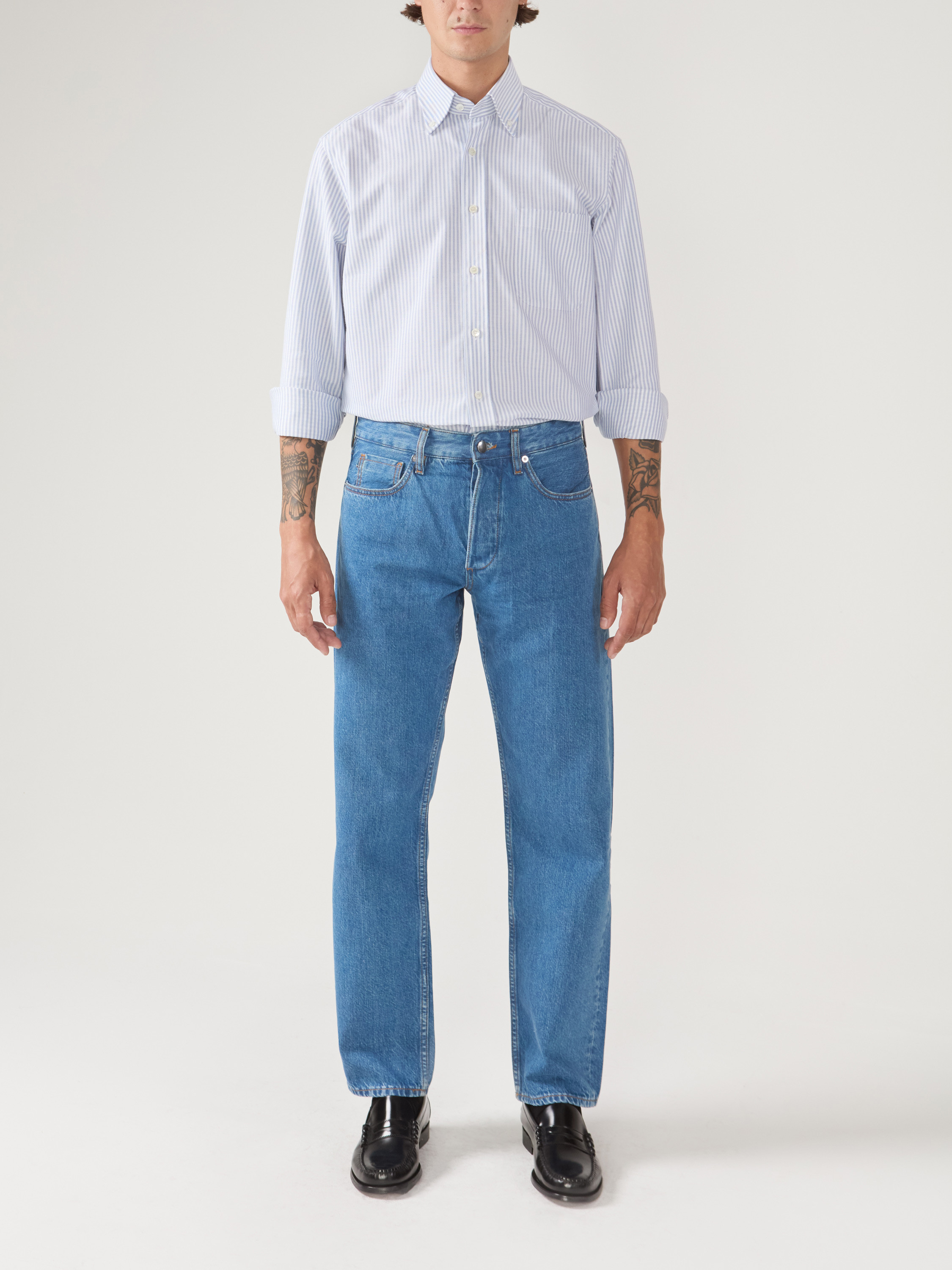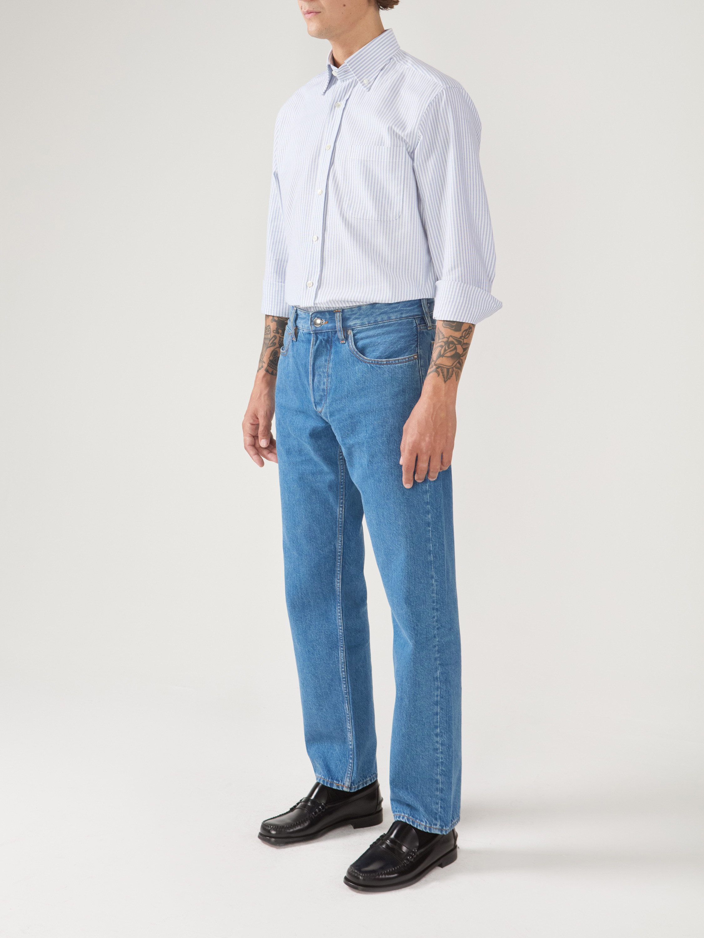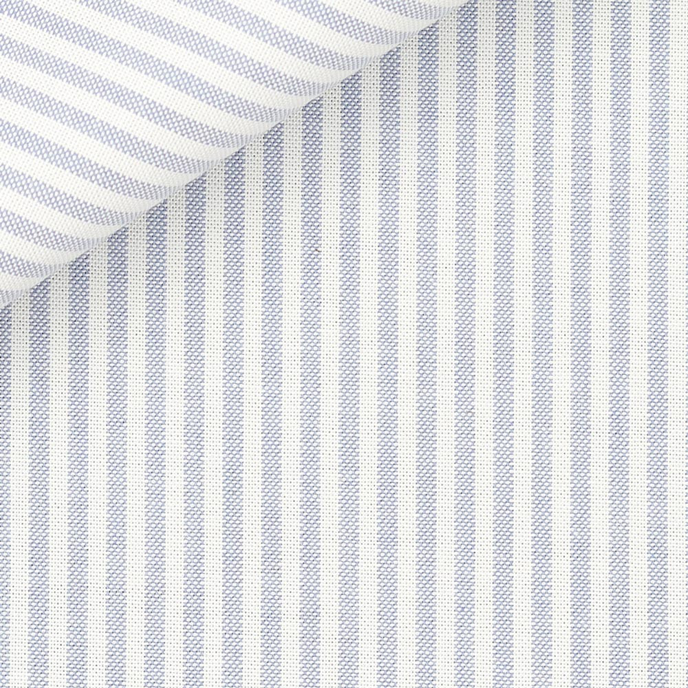 Oxford épais rayé bleu, tissé en Italie. Un tissu composé de fils très solides et particulièrement épais comme l'était l'oxford originel. Cette qualité d'oxford est une réédition d'une qualité de tissu légendaire de chez Thomas Mason