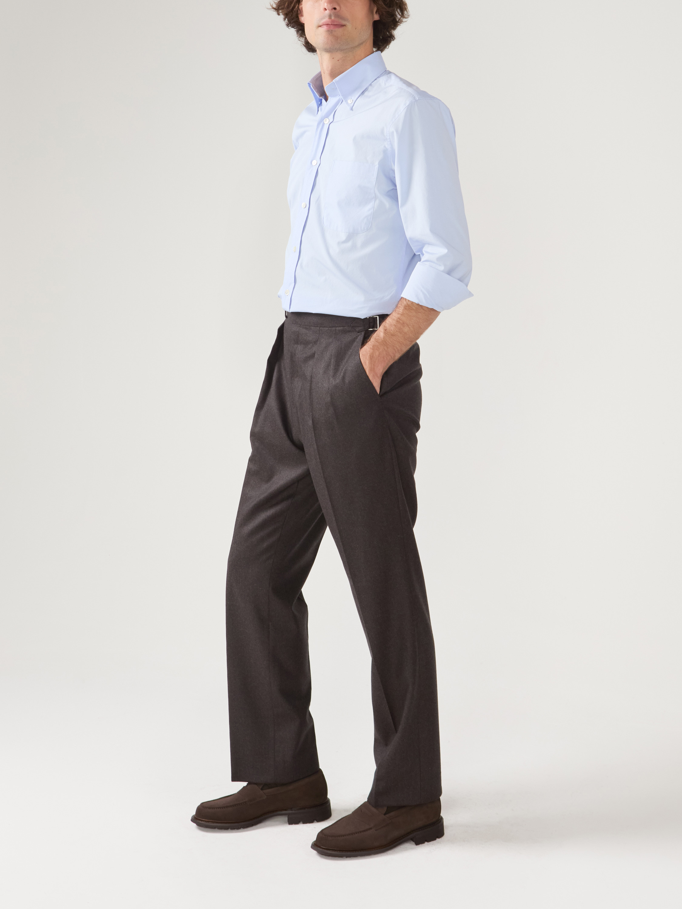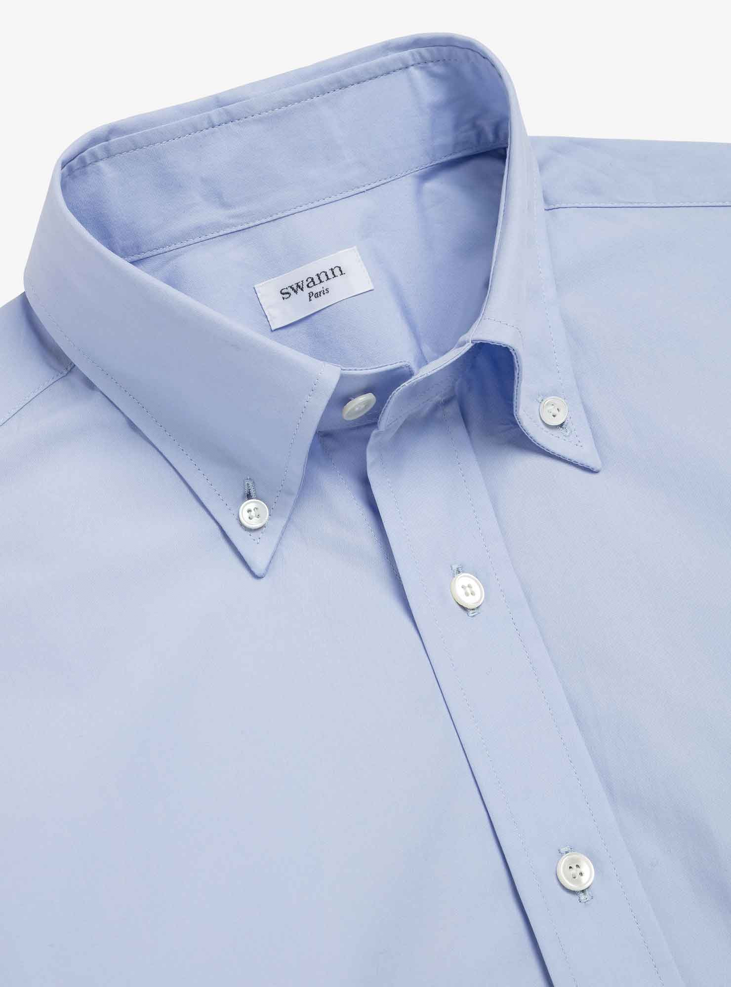 Popeline bleu Thomas Mason, double retors 100/2 lavée. Le tissu est lavé pour lui donner un aspect patiné, mat, immédiatement confortable. Il s'agit dès lors d'une popeline plutôt sport à porter avec un col souple.