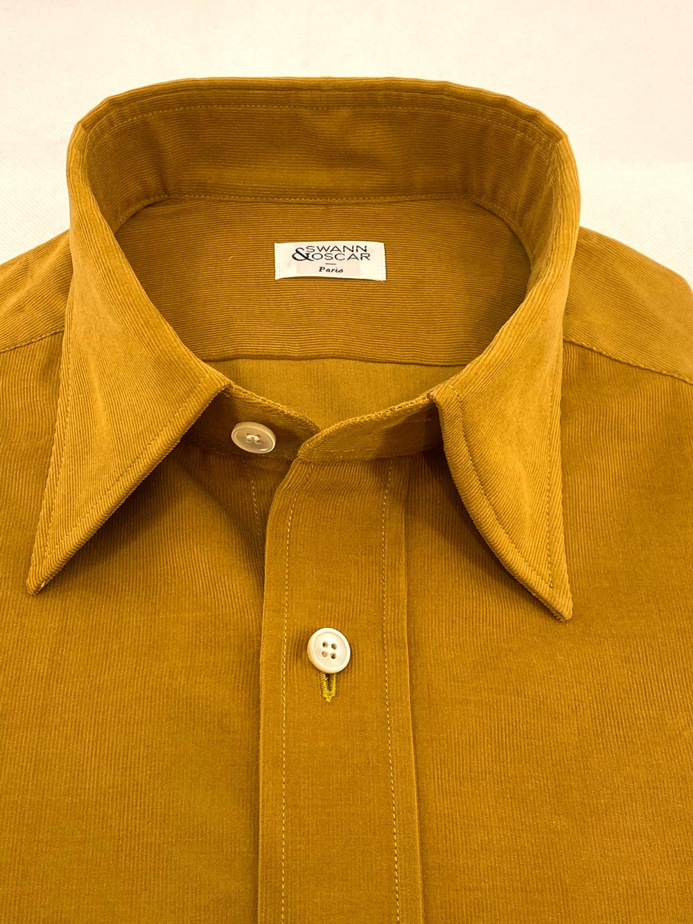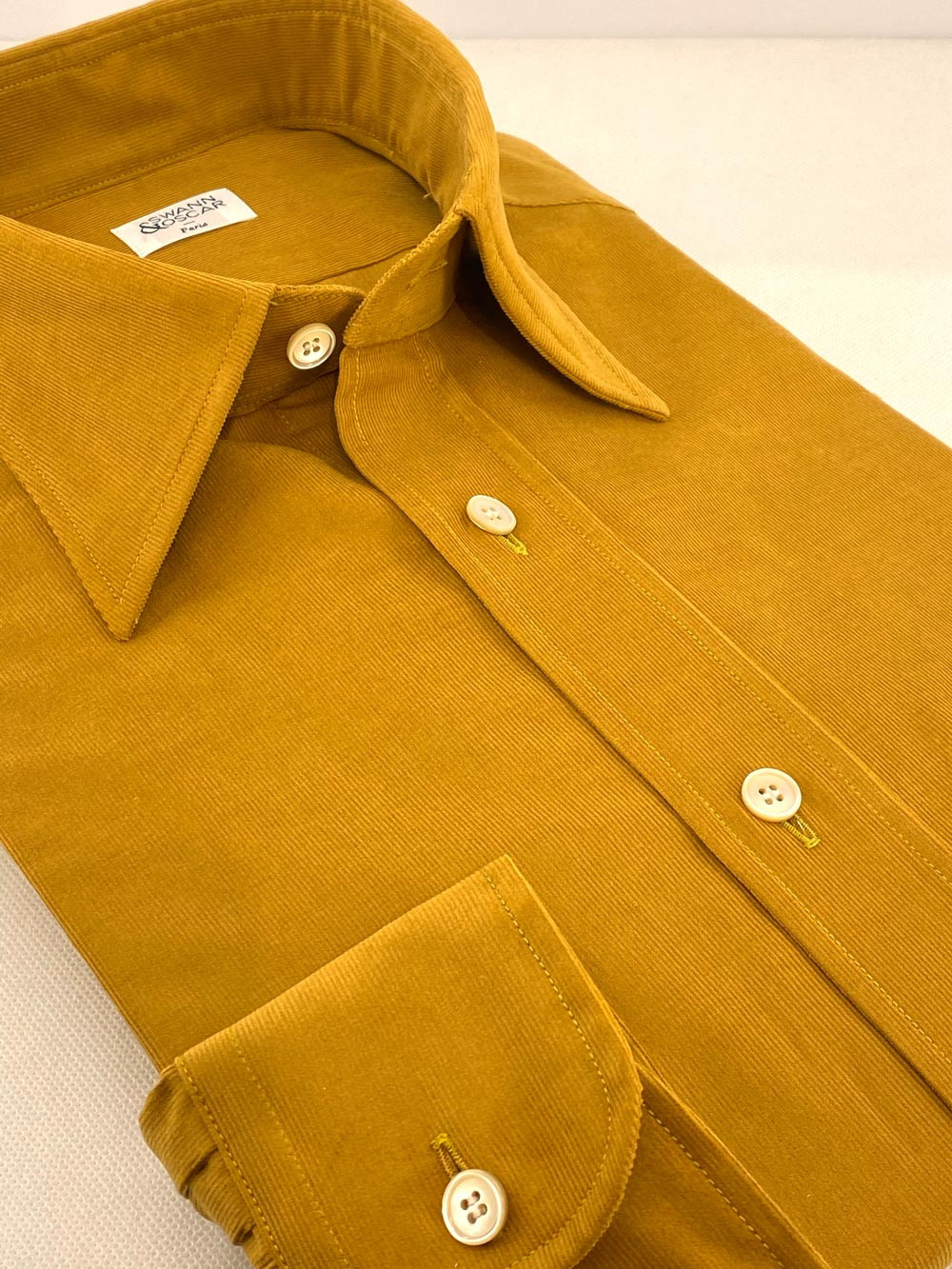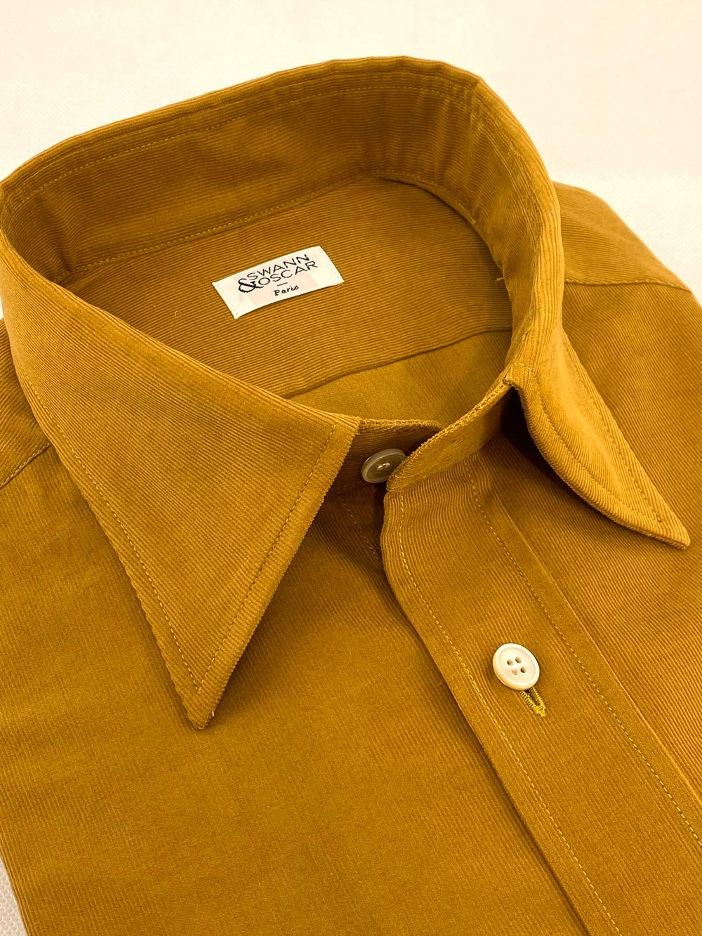 Velours camel de chez Albini. Tissu à fines cotes, souvent appelé "baby cord", chaud et confortable, c'est une super chemise sport. Les cols que nous vous conseillons : Amalfi boutonné, Hirondelle souple ou Positano.