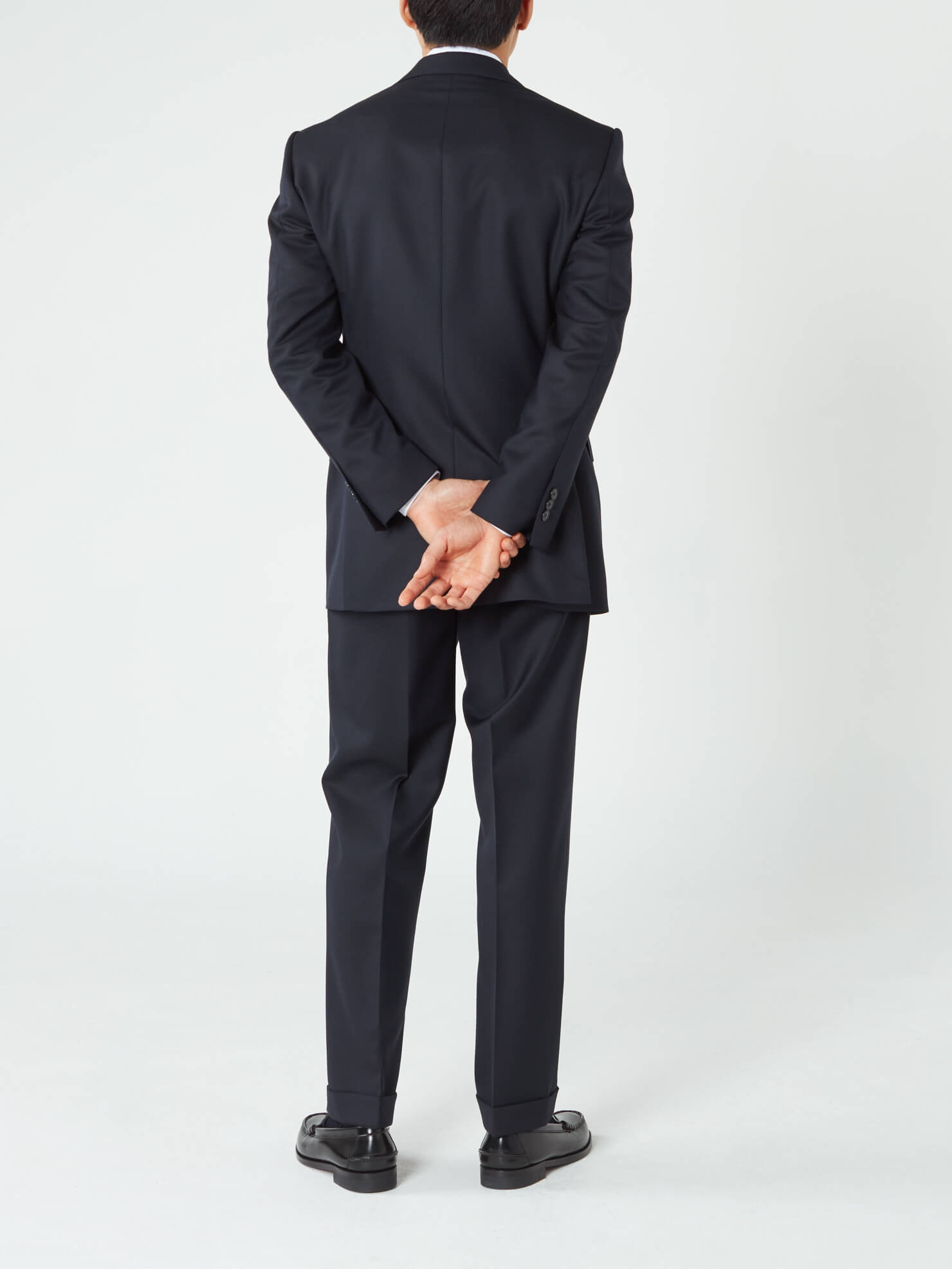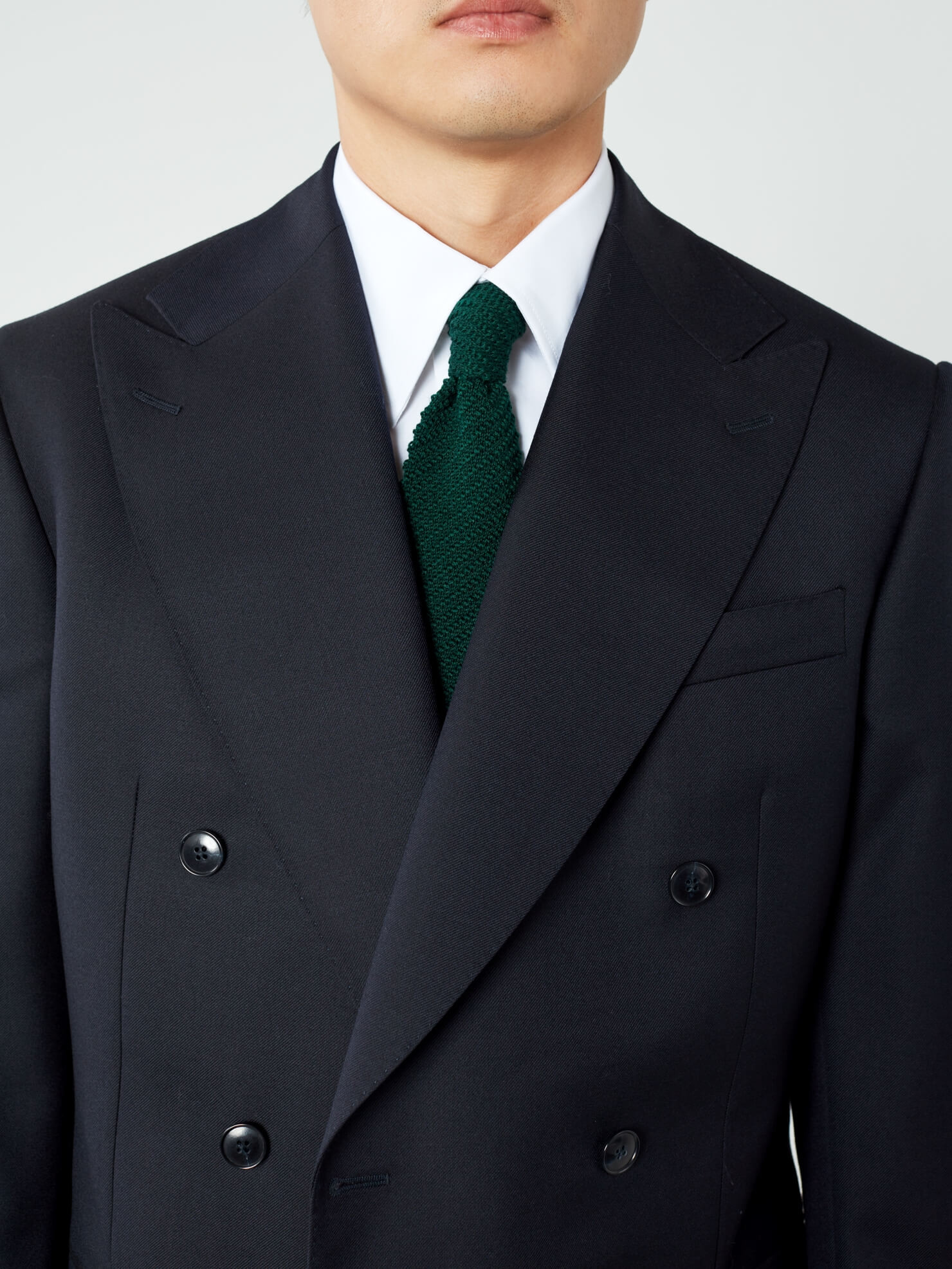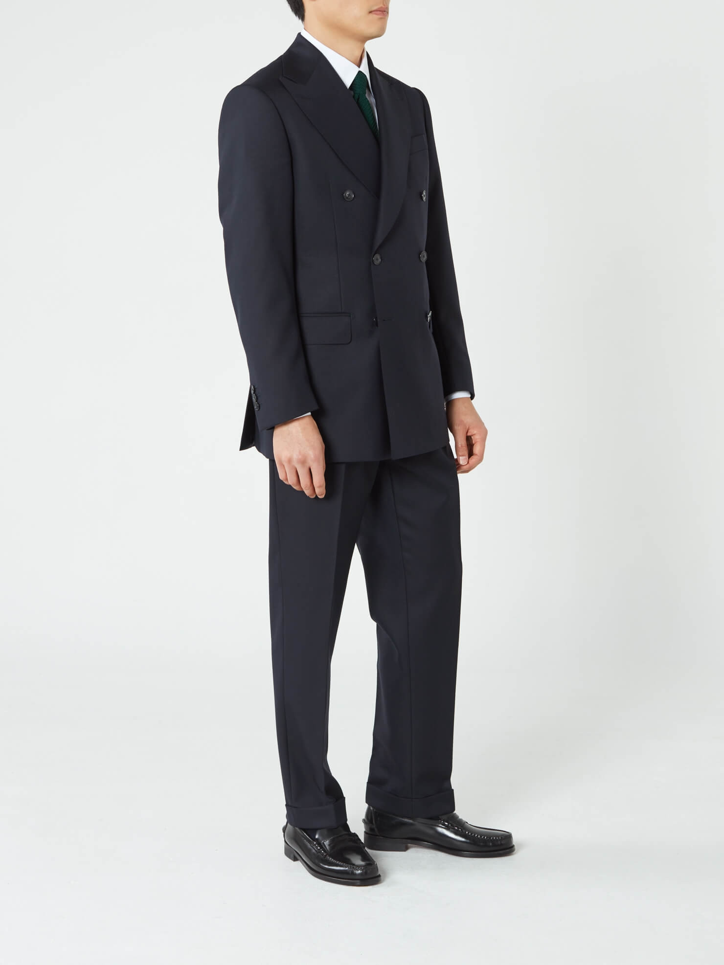 Costume Habillé croisé marine. Veste croisée six boutons, revers large cran aigu, épaule classique padding strandard, poche poitrine barchetta, deux poches rabat droit, deux fentes dos. Pantalon à pattes de serrage, deux pinces vers l'intérieur, poches latérales obliques, une poche passepoilée à l'arrière, bas revers de 4cm.