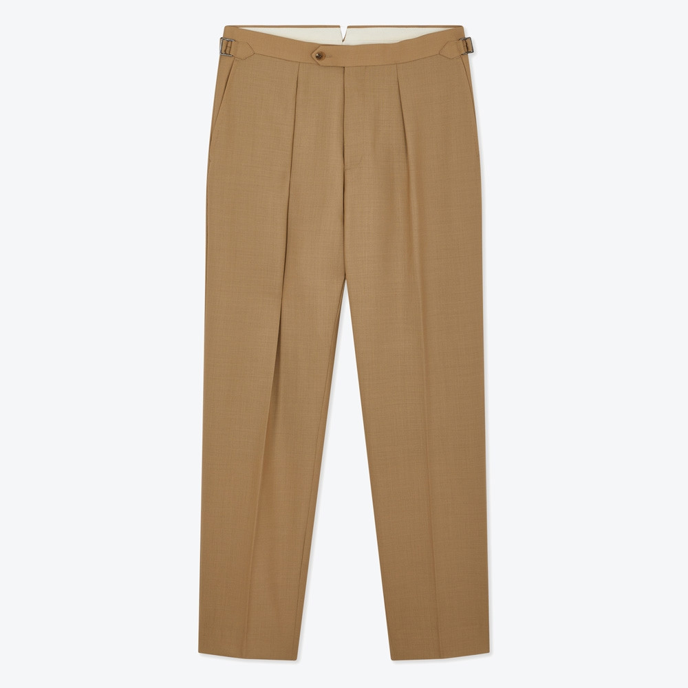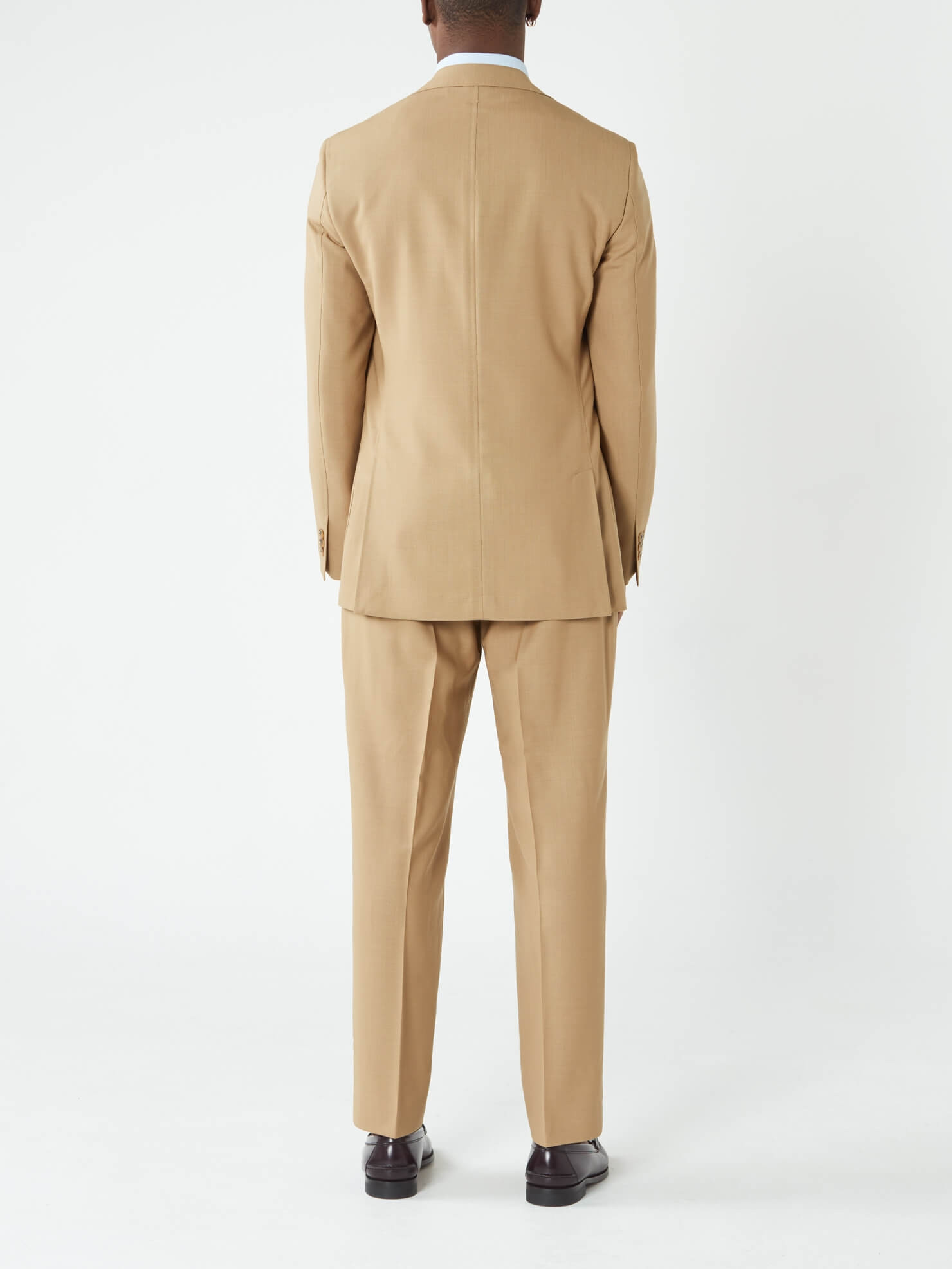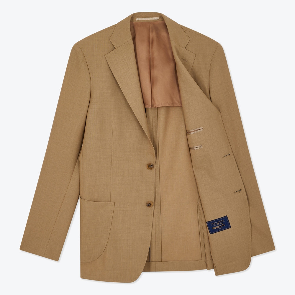 Costume Sport en Fresco beige - Veste droite non construite, entièrement non doublée, revers standard cran classique, sans épaulette ni padding, poche poitrine barchetta, deux poches plaquées arrondies, deux fentes dos, surpiqûres AMF 6mm. Pantalon une pince vers l'extérieur, pattes de serrage, poches latérales obliques, une poche passepoilée boutonnée à l'arrière, bas revers 4cm.